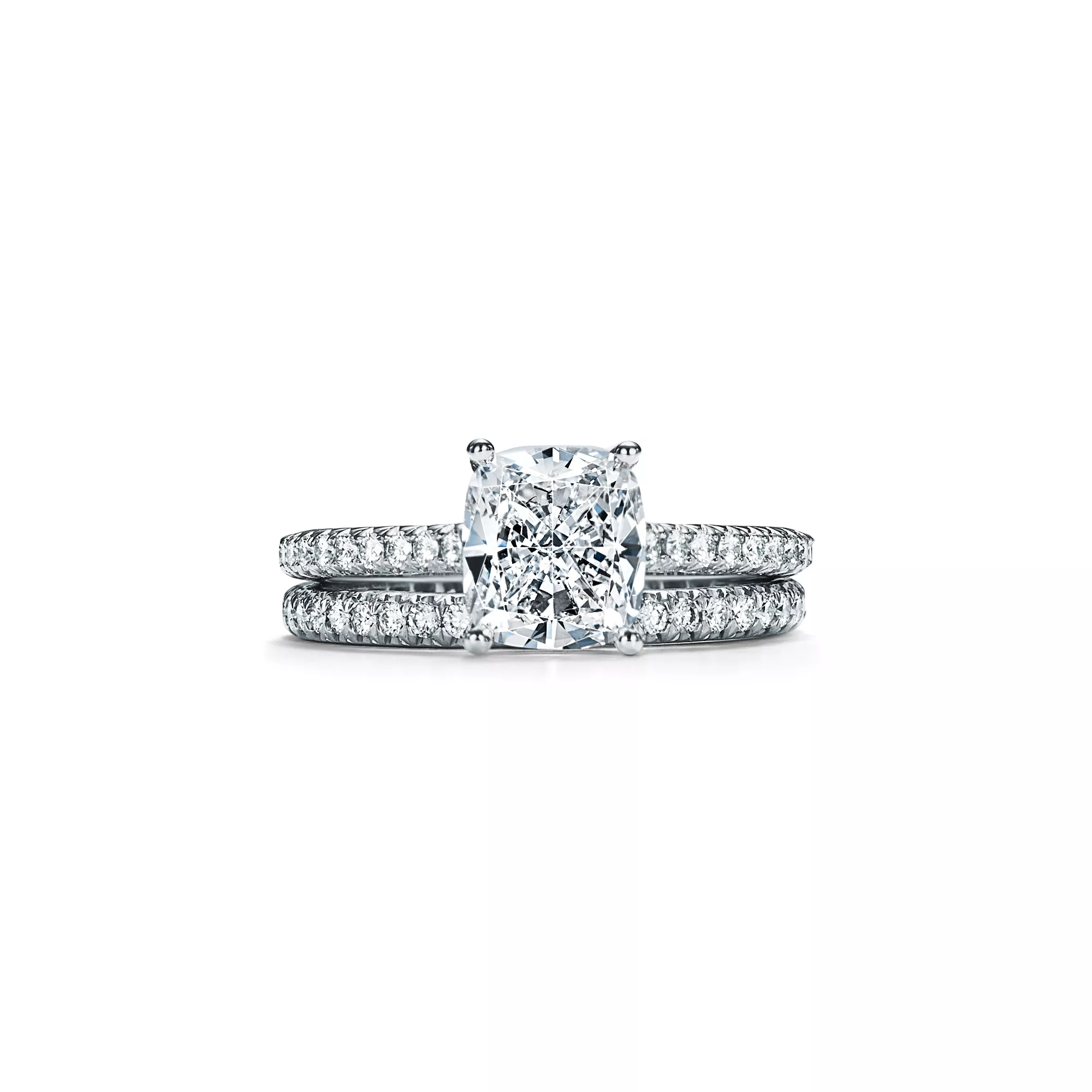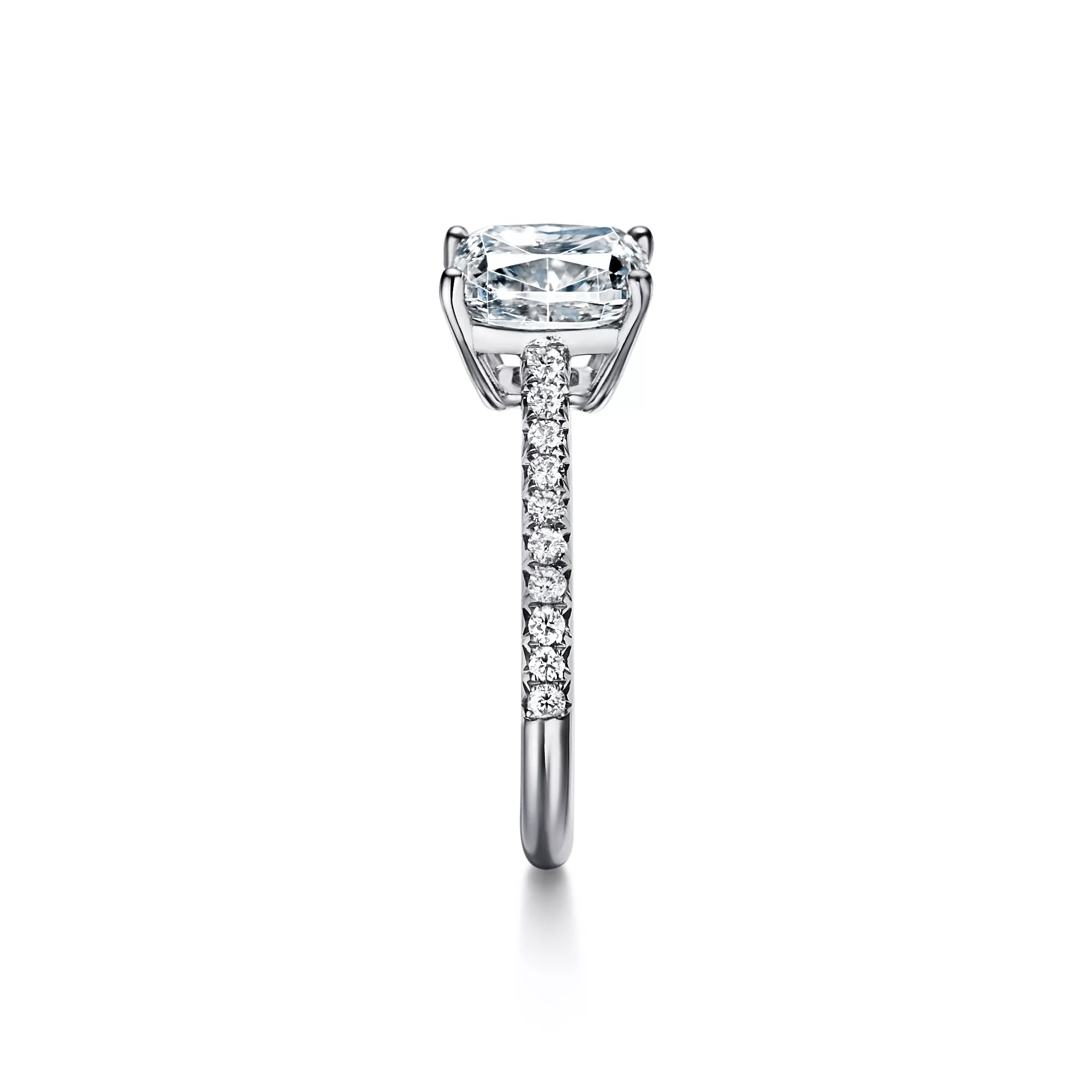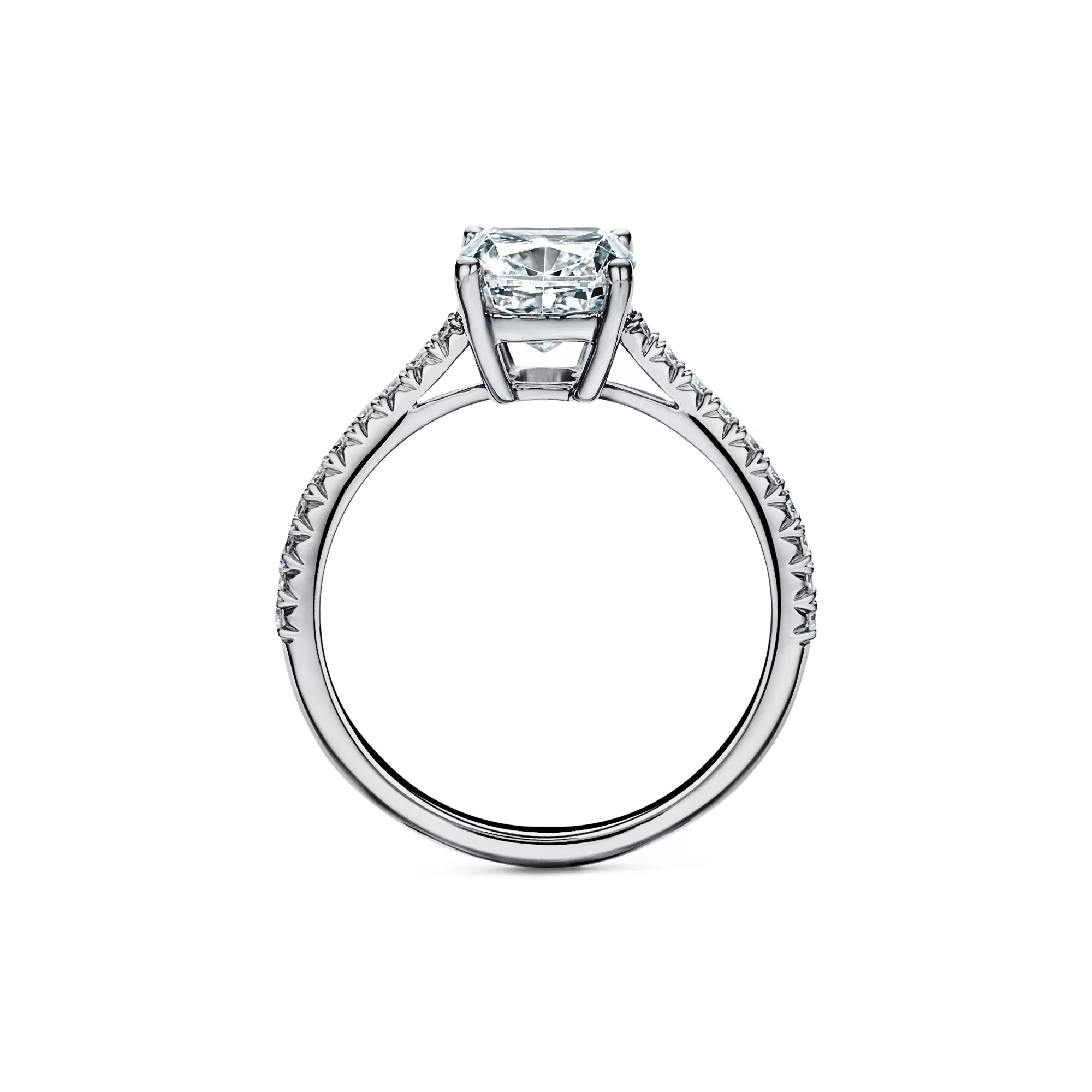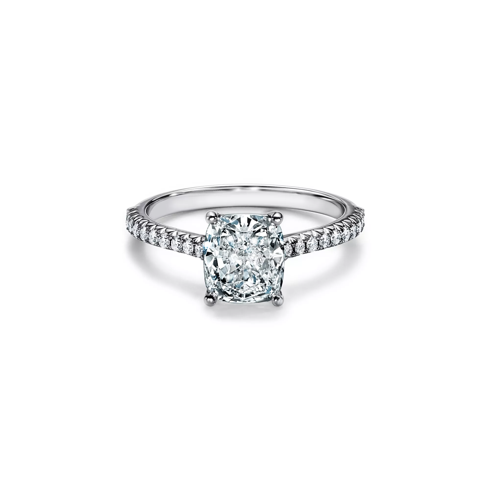 The cushion-cut center diamond—cut for brilliance with perfectly aligned facets and a roughly square shape—is set among four slim prongs, giving this timeless ring a feminine spirit with clean, contemporary lines. A slender band of micro-pavé-set diamonds lends the brilliant Tiffany Novo® a distinctly romantic sensibility with a modern edge. At Tiffany, we ethically source our diamonds. Integrity and social responsibility are at the core of our sourcing practices.