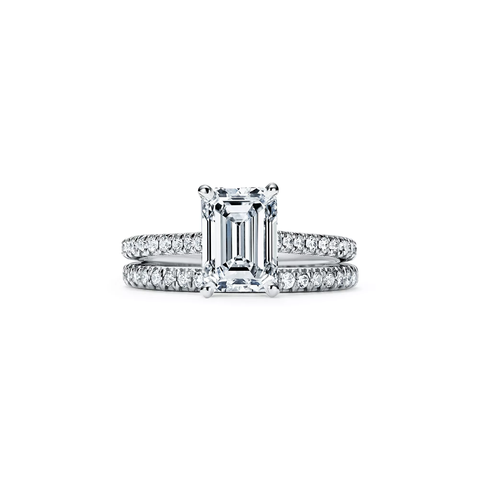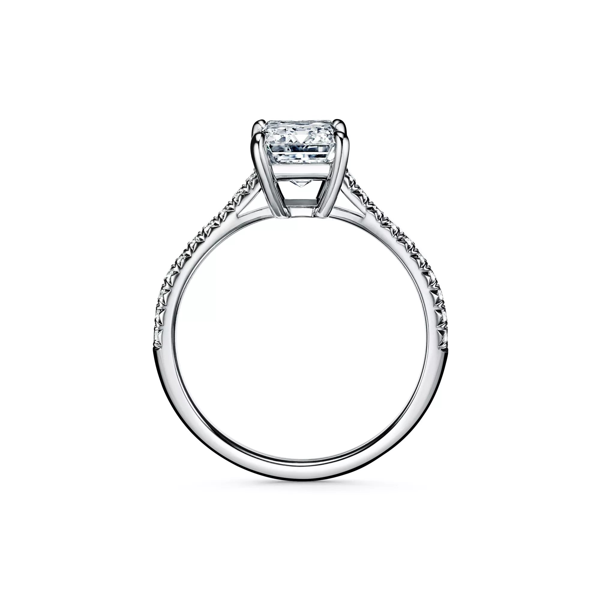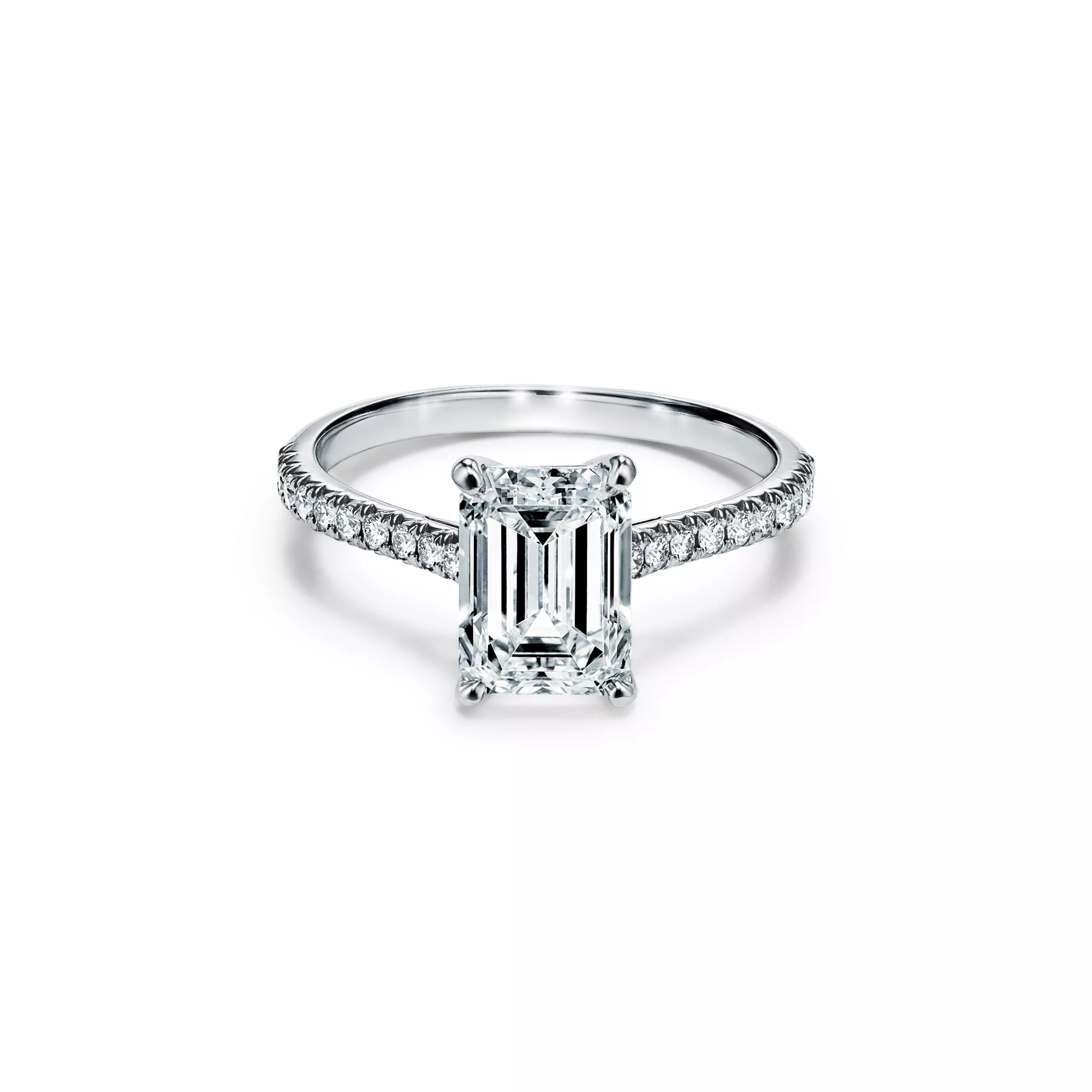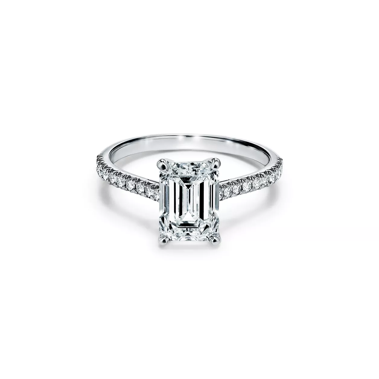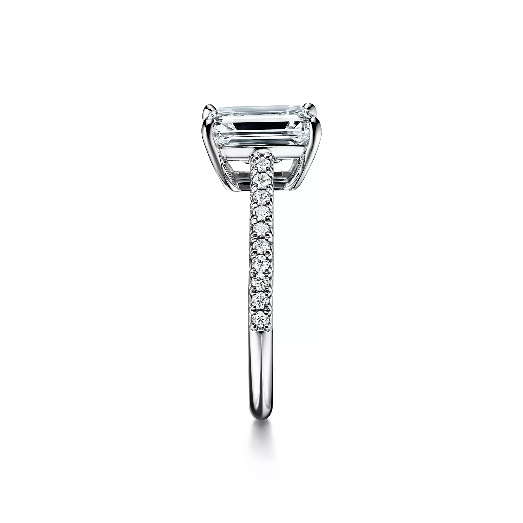 The emerald-cut center diamond—cut for brilliance with concentric rows of parallel facets—is set among four slim prongs, giving this timeless ring a feminine spirit with clean, contemporary lines. A slender band of micro-pavé-set diamonds lends the brilliant Tiffany Novo® a distinctly romantic sensibility with a modern edge. At Tiffany, we ethically source our diamonds. Integrity and social responsibility are at the core of our sourcing practices.