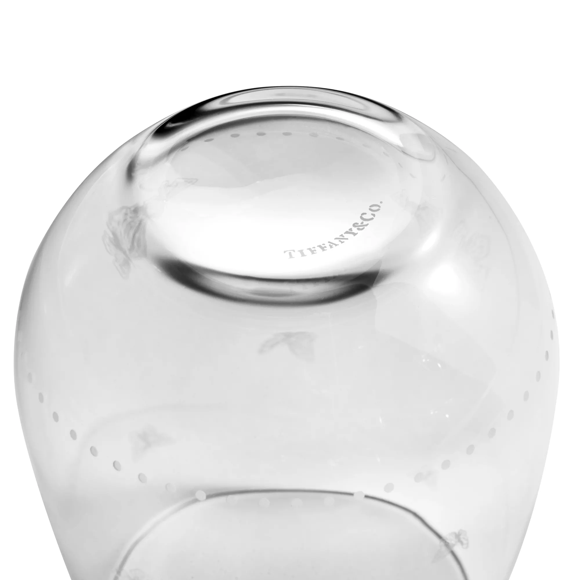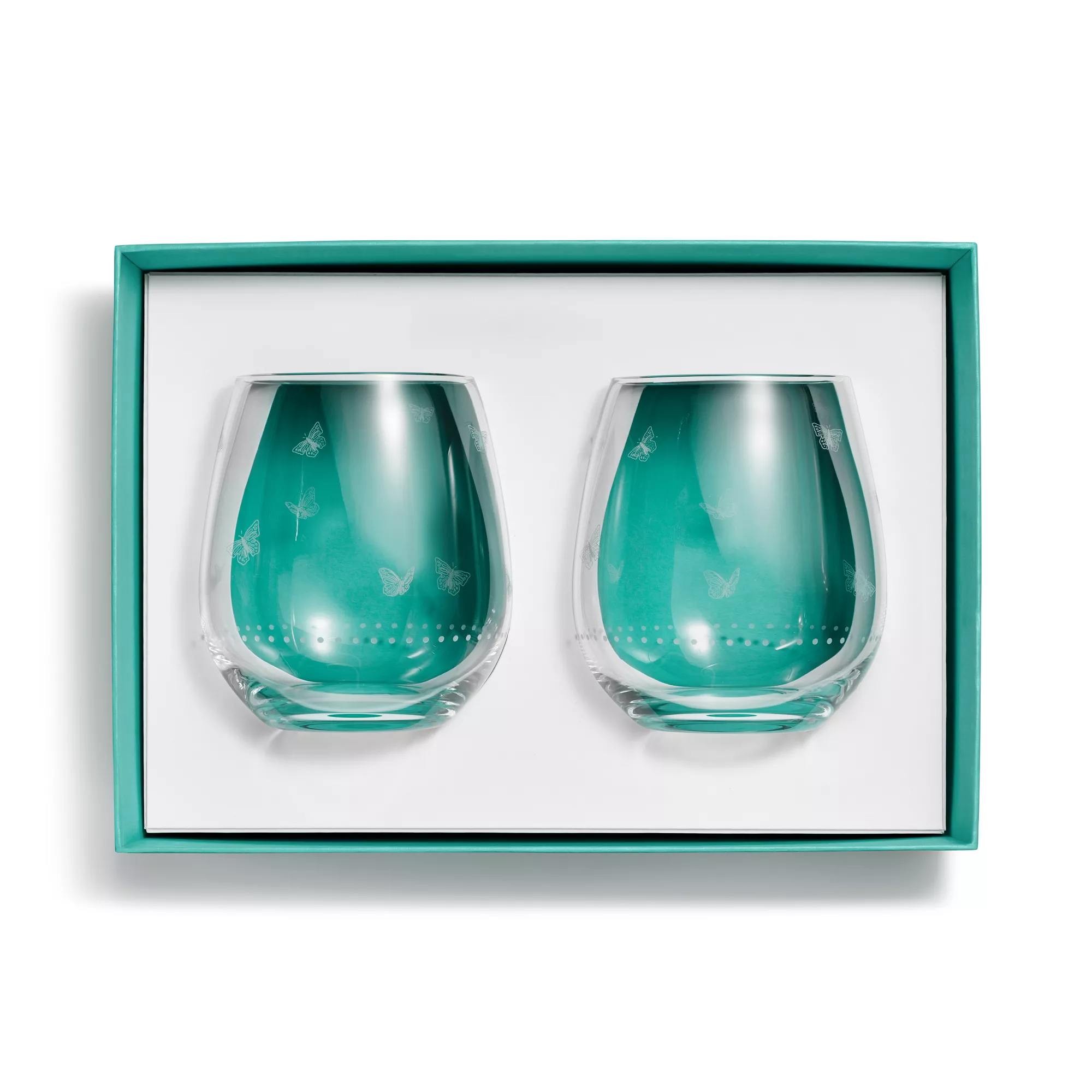 Featuring flora and fauna motifs first introduced on 19th-century Tiffany & Co. hollowware, the Tiffany Jardin collection captures the beauty of the natural world. This set of two stemless red wine glasses is delicately etched with a scene of butterflies in flight that teems with life. Partner with matching Tiffany Jardin tableware or mix with other styles for an unexpected look.