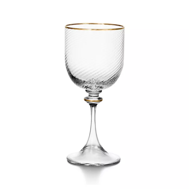 Contemporary and sleek, Tiffany Twist glassware features an elegant ripple effect in various silhouettes. This piece features a hand-painted gold rim and is mouth-blown in Murano, Italy. Tiffany Twist creations mix beautifully with designs from Tiffany Home dinnerware collections.
