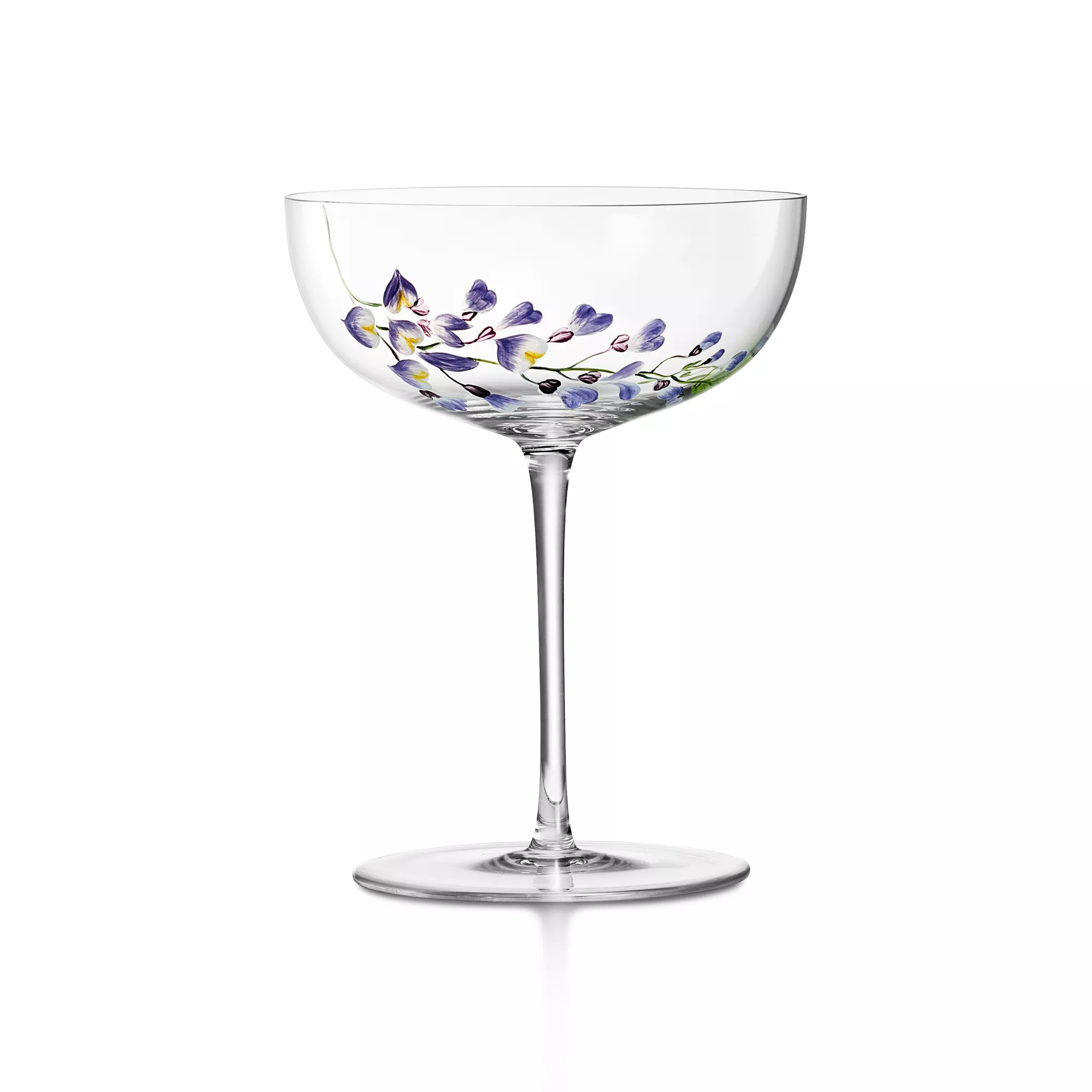 The Tiffany Wisteria collection draws from wisteria-inspired masterpieces from The Tiffany Archives. Reimagining this motif, the hand-painted florals imbue each design with a sense of timeless, feminine elegance. Crafted from mouth-blown glass, this coupe features cascading wisterias, elevating any table setting.