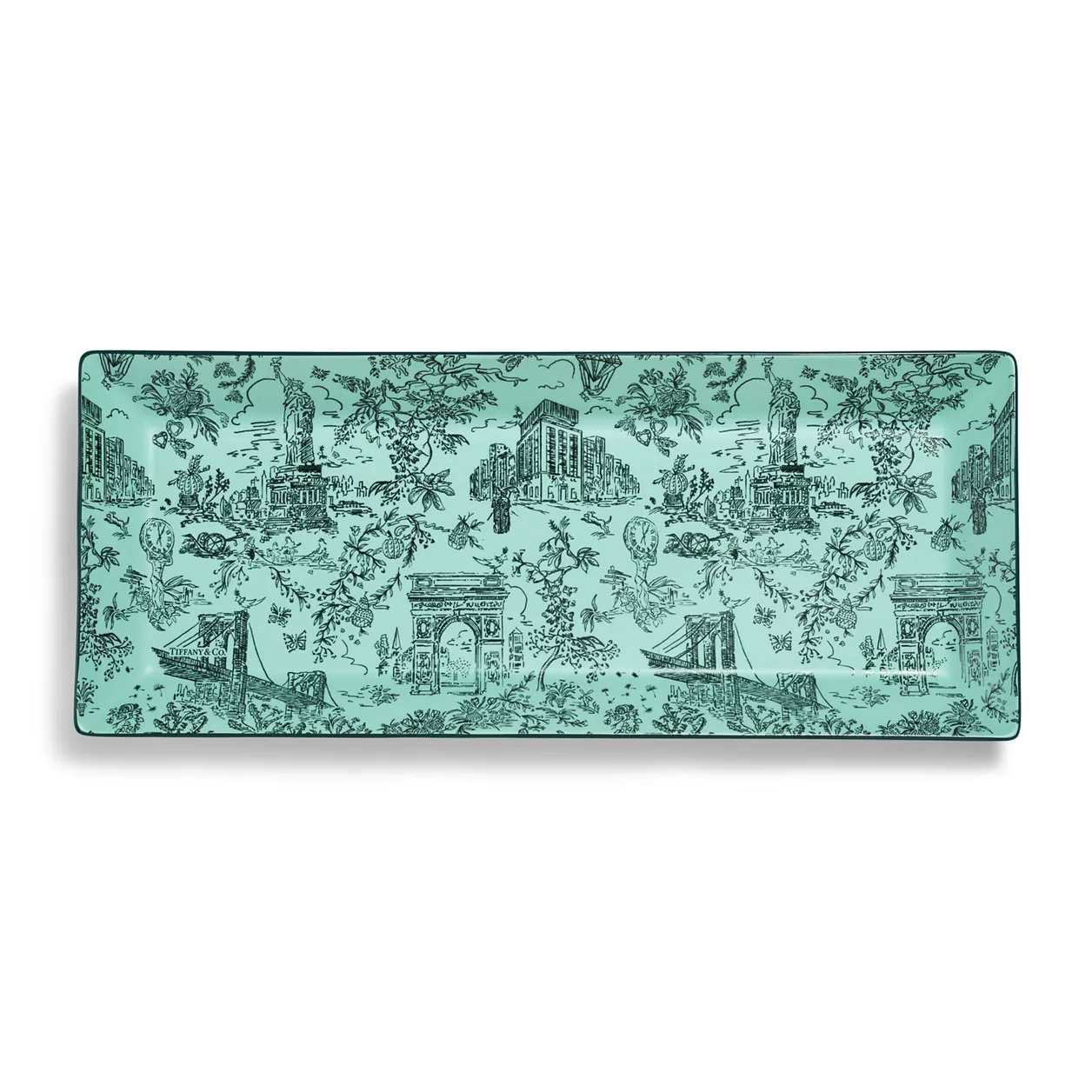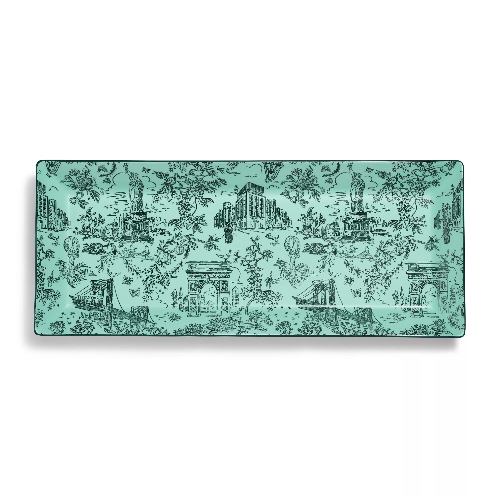 Tiffany Toile designs are a whimsical tribute to Tiffany's hometown and its heritage. Playful yet elegant, the artwork is inspired by an illustration of New York City from The Tiffany Archives. The Brooklyn Bridge meets Bird on a Rock; the Statue of Liberty mingles with a Tiffany & Co. diamond. This Tiffany Blue® platter features the elaborate print with a black hand-painted rim. Style with pieces from the Tiffany Toile collection for a matching look or mix with our other Tiffany Home patterns.