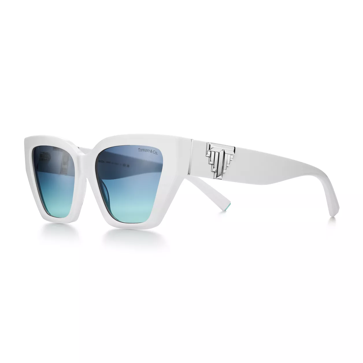 Tiffany's iconic House code returns. Tiffany T Deco sunglasses feature a striking temple design inspired by our favourite letter and Art Deco designs from The Tiffany Archives. This pair of Tiffany T sunglasses is crafted in white acetate with silver-coloured metal accents and Tiffany Blue® gradient cat eye lenses.