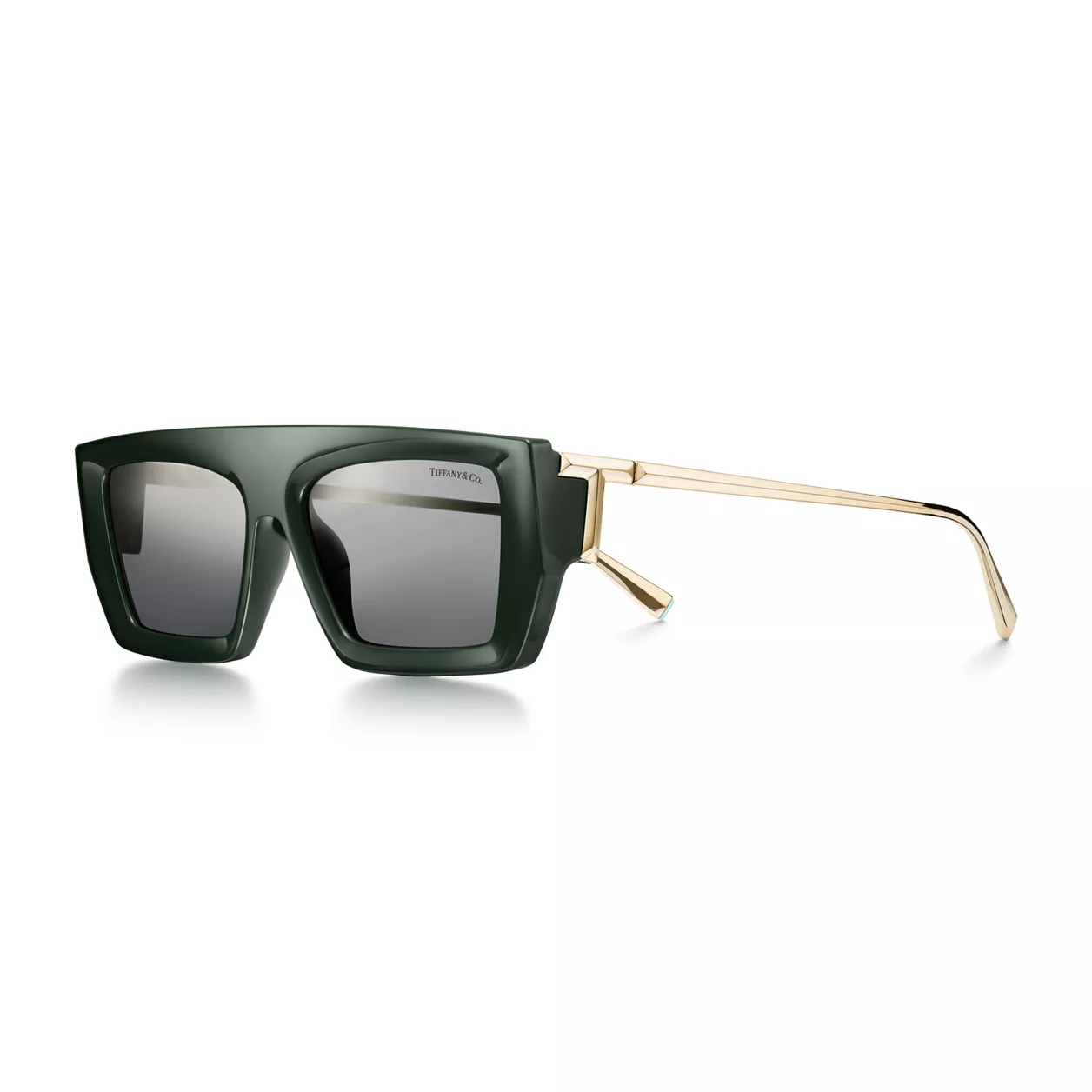 Inspiring, empowering and above all, unwavering, the Tiffany T collection reminds us of the connections we feel but cannot always see. This pair of Tiffany T sunglasses is crafted in dark green acetate with pale gold-coloured metal accents and dark grey rectangular lenses. Graphic angles and clean lines blend to create the beautiful clarity of the Tiffany T eyewear collection.