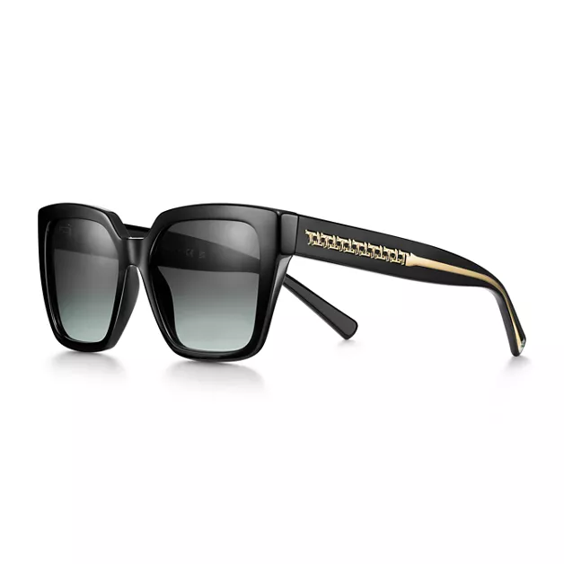 Tiffany's iconic House code returns. Tiffany T sunglasses feature a striking temple design inspired by our favourite letter. These sunglasses are crafted in black acetate with pale gold-coloured metal accents and grey gradient square lenses. Make a bold statement with this sleek pair of sunglasses.