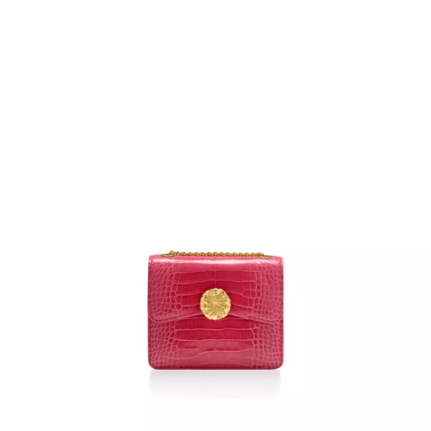 The Jean Schlumberger by Tiffany Ribbons collection is inspired by the legendary designer’s family history in the textile industry and the ornate trim he frequently incorporated into his creations. Crafted from alligator leather, this bag features a front slip pocket lined with Tiffany Blue® and an interior back pocket with a removable mirror. The gold-plated brass closure nods to a motif seen on a compact mirror designed by Jean Schlumberger in 1957.