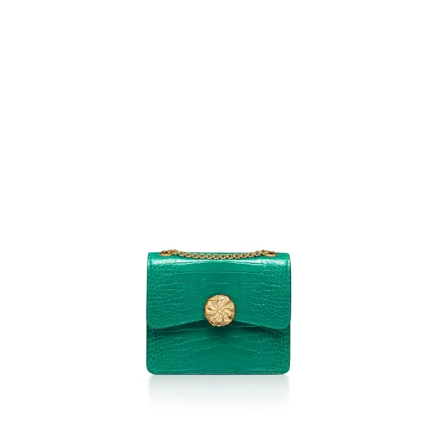 The Jean Schlumberger by Tiffany Ribbons collection is inspired by the legendary designer’s family history in the textile industry and the ornate trim he frequently incorporated into his creations. Crafted from alligator leather, this bag features a front slip pocket lined with Tiffany Blue® and an interior back pocket with a removable mirror. The gold-plated brass closure nods to a motif seen on a compact mirror designed by Jean Schlumberger in 1957.