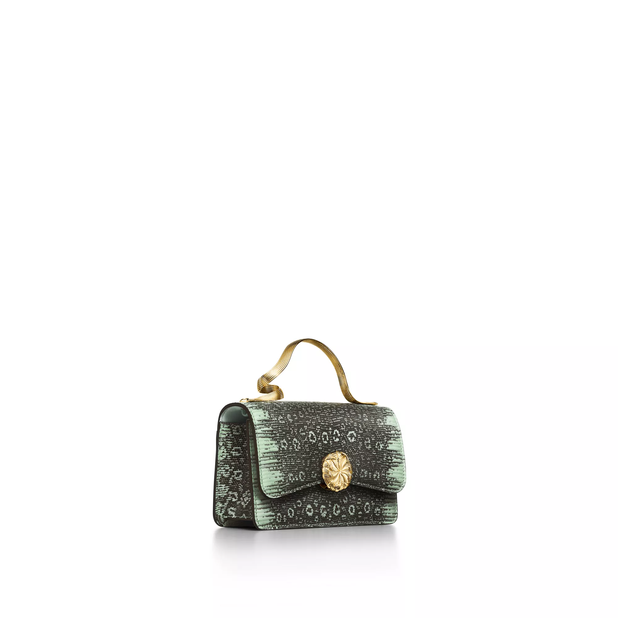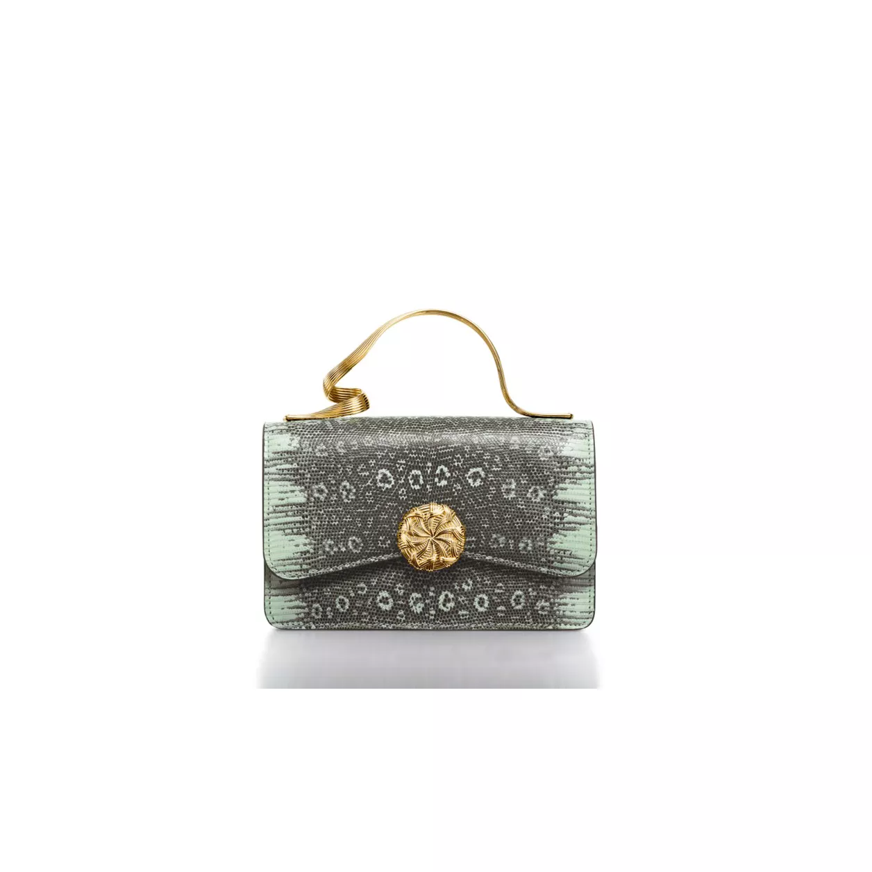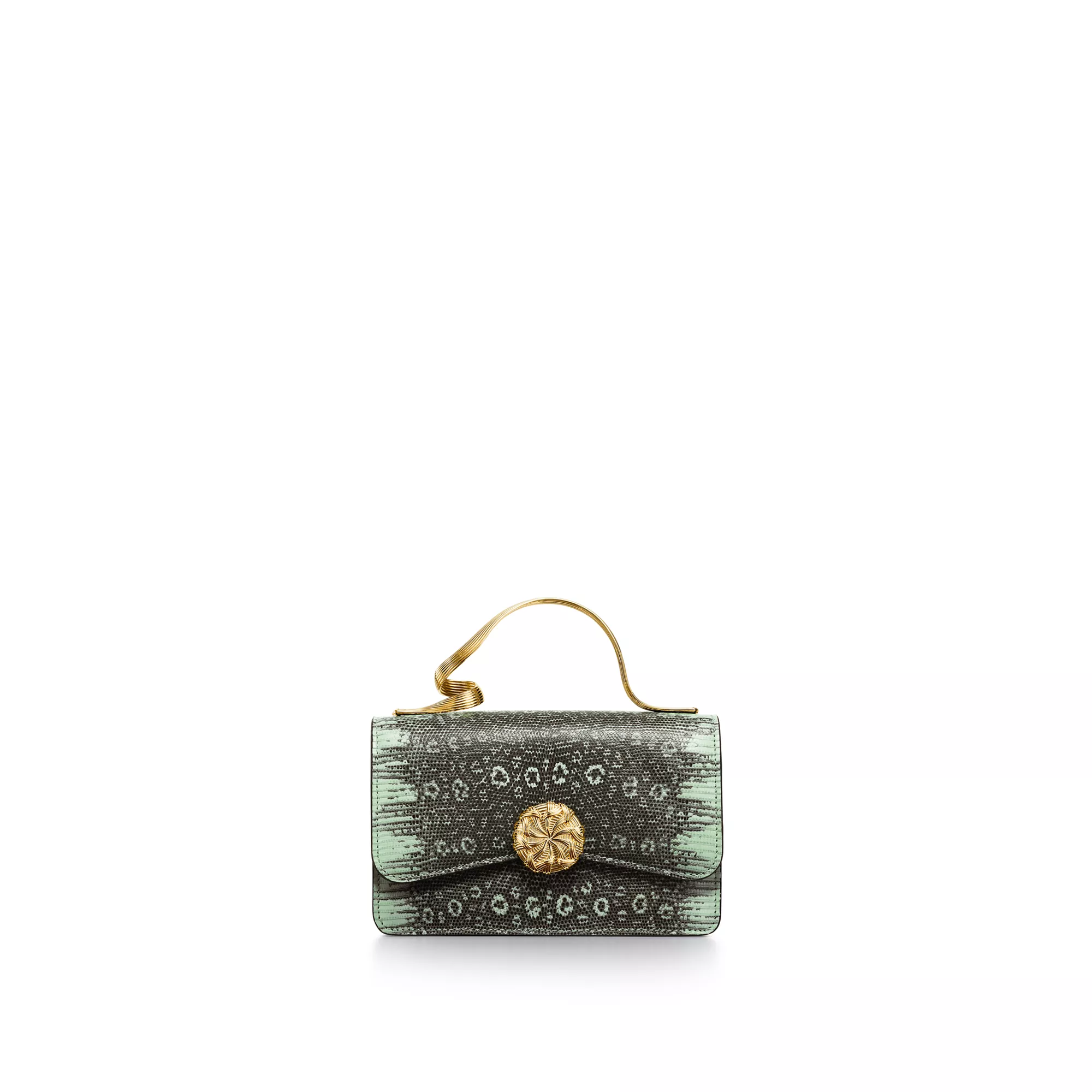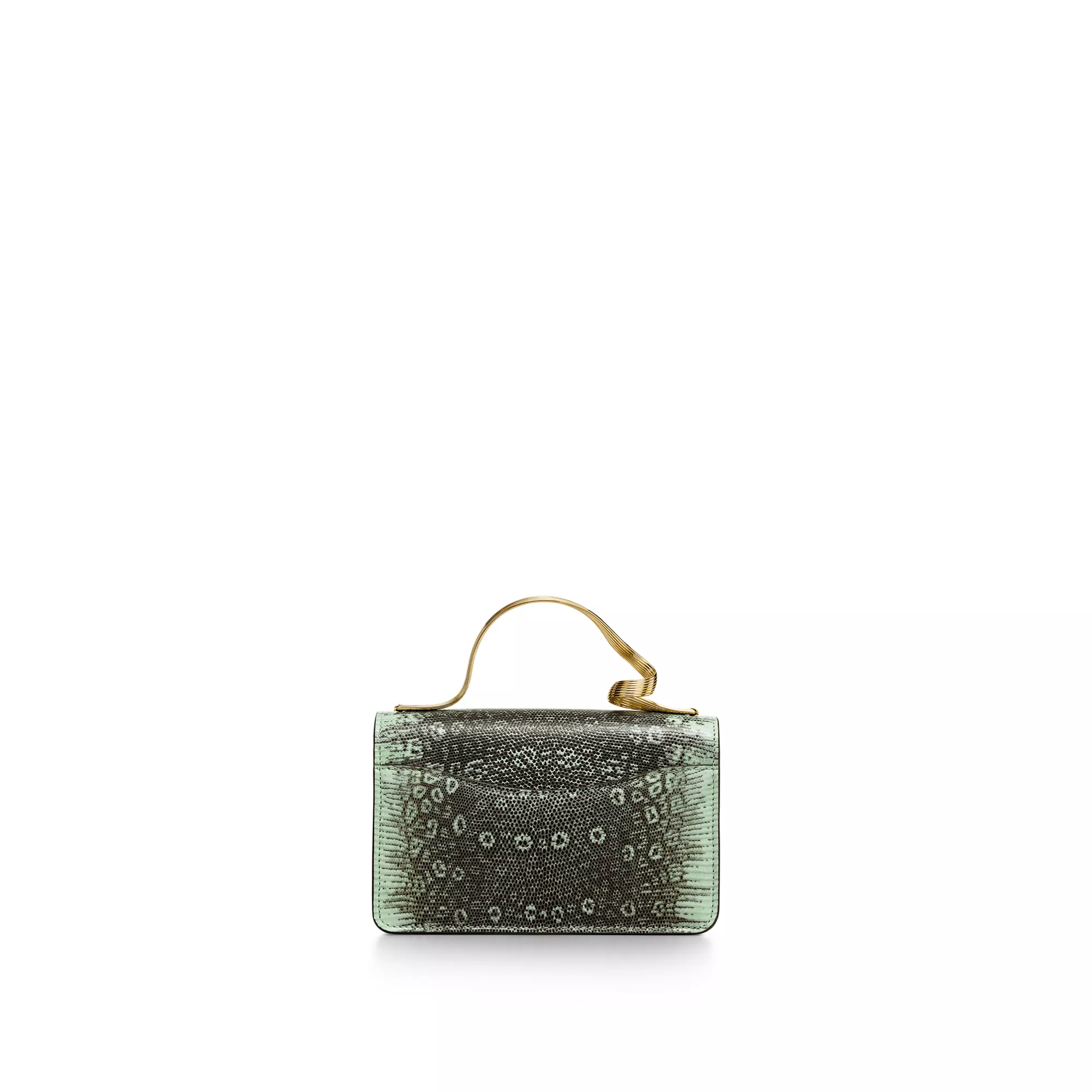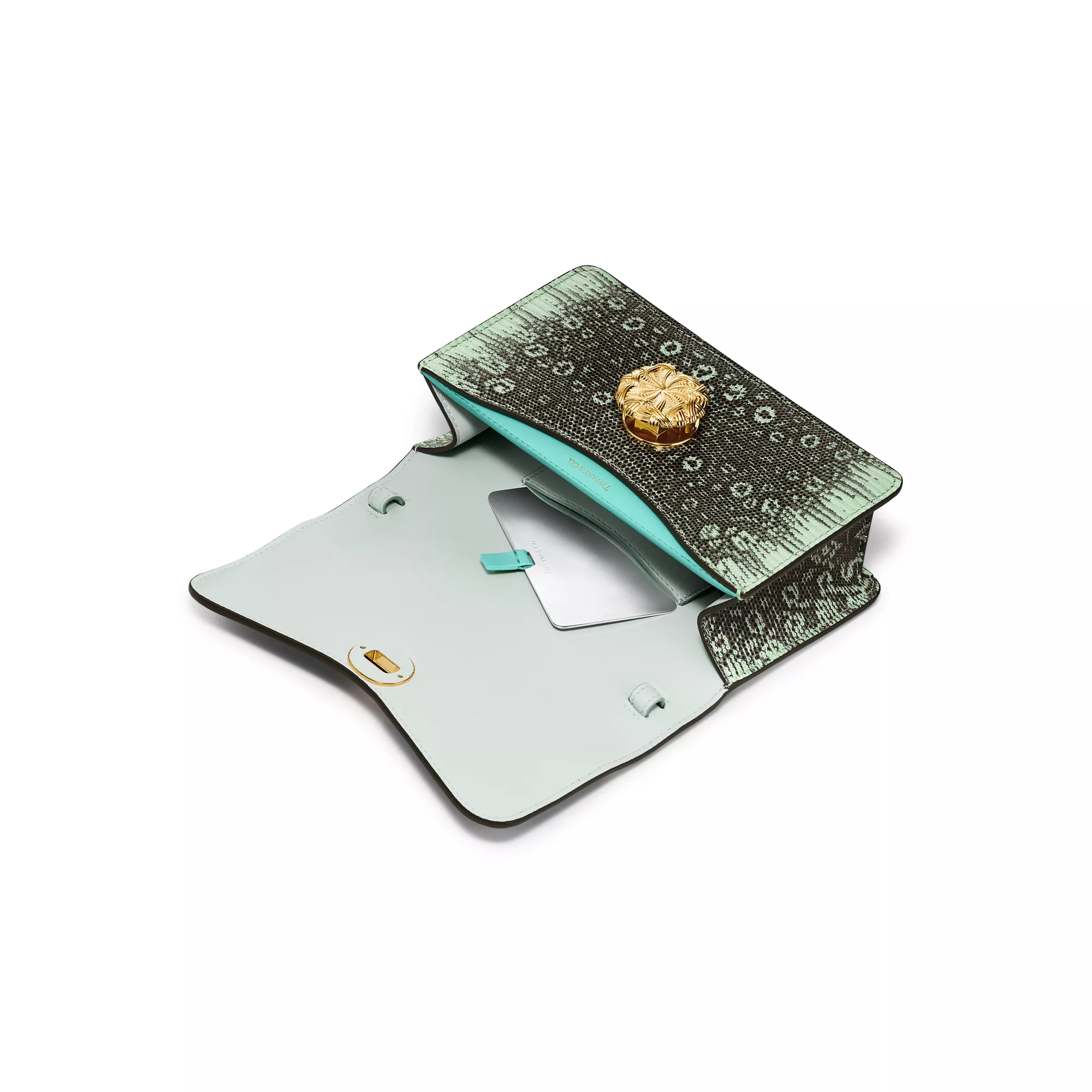 The Jean Schlumberger by Tiffany Ribbons collection is inspired by the legendary designer’s family history in the textile industry and the ornate trim he frequently incorporated into his creations. Crafted from lizard leather, this bag features a front slip pocket lined with Tiffany Blue® and an interior back pocket with a removable mirror. The gold-plated brass closure nods to a motif seen on a compact mirror designed by Jean Schlumberger in 1957.