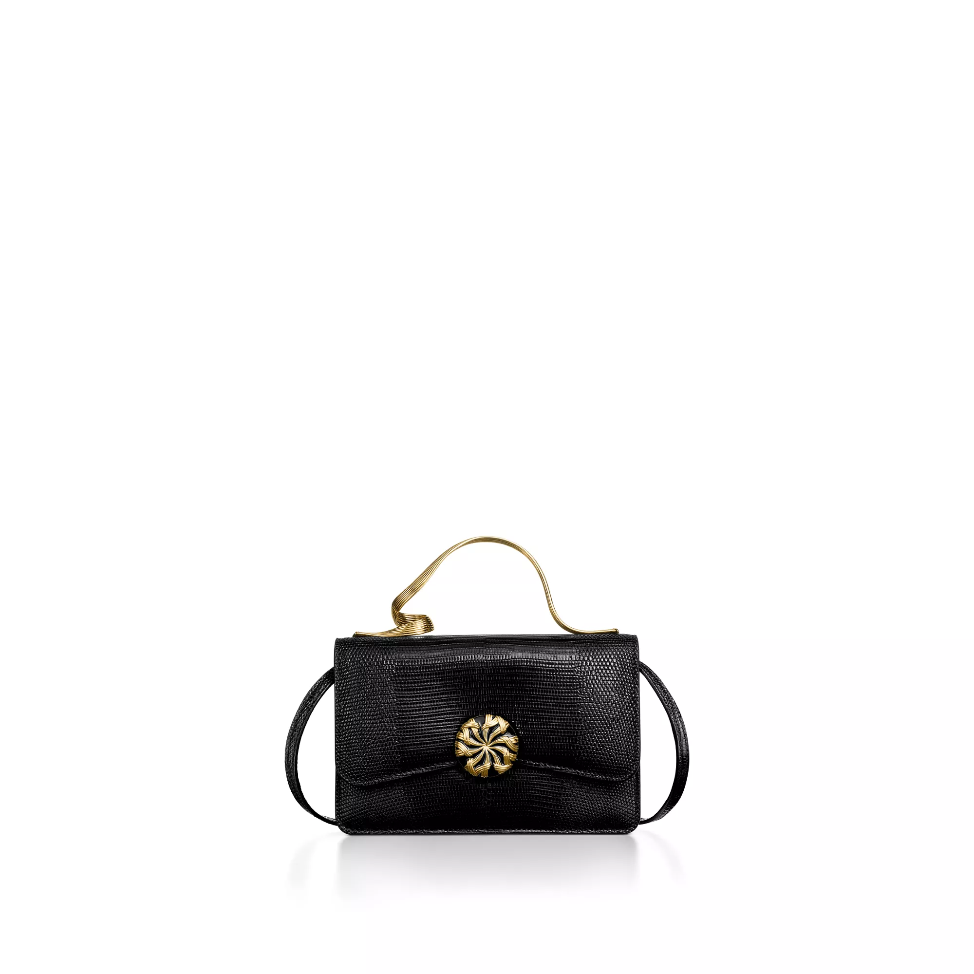 The Jean Schlumberger by Tiffany Ribbons collection is inspired by the legendary designer’s family history in the textile industry and the ornate trim he frequently incorporated into his creations. Crafted from lizard leather, this bag features a front slip pocket lined with Tiffany Blue® and an interior back pocket with a removable mirror. The gold-plated brass and enamel closure nods to a motif seen on a compact mirror designed by Jean Schlumberger in 1957.