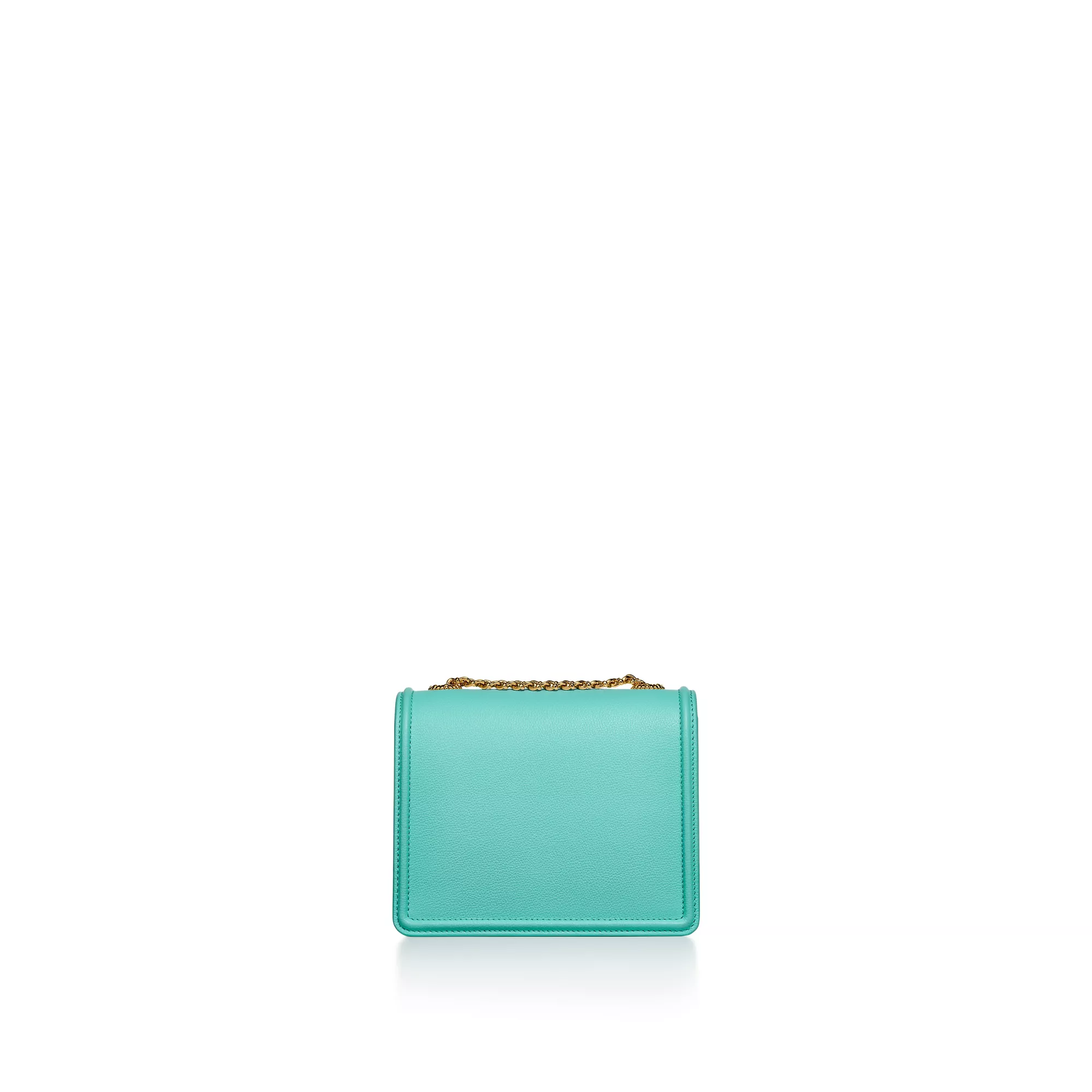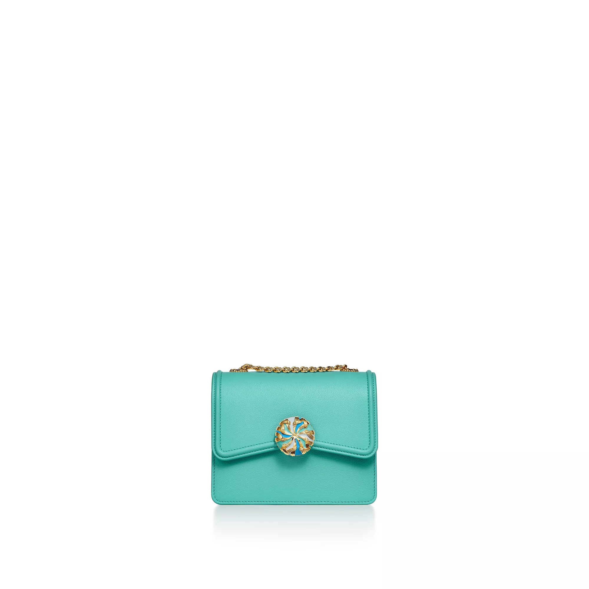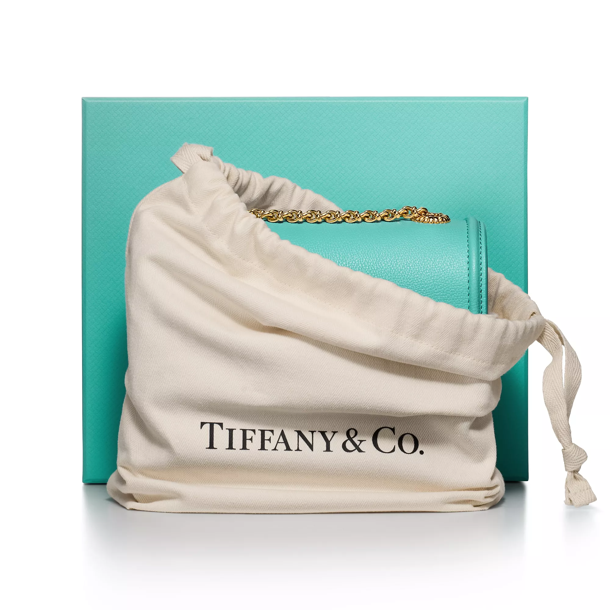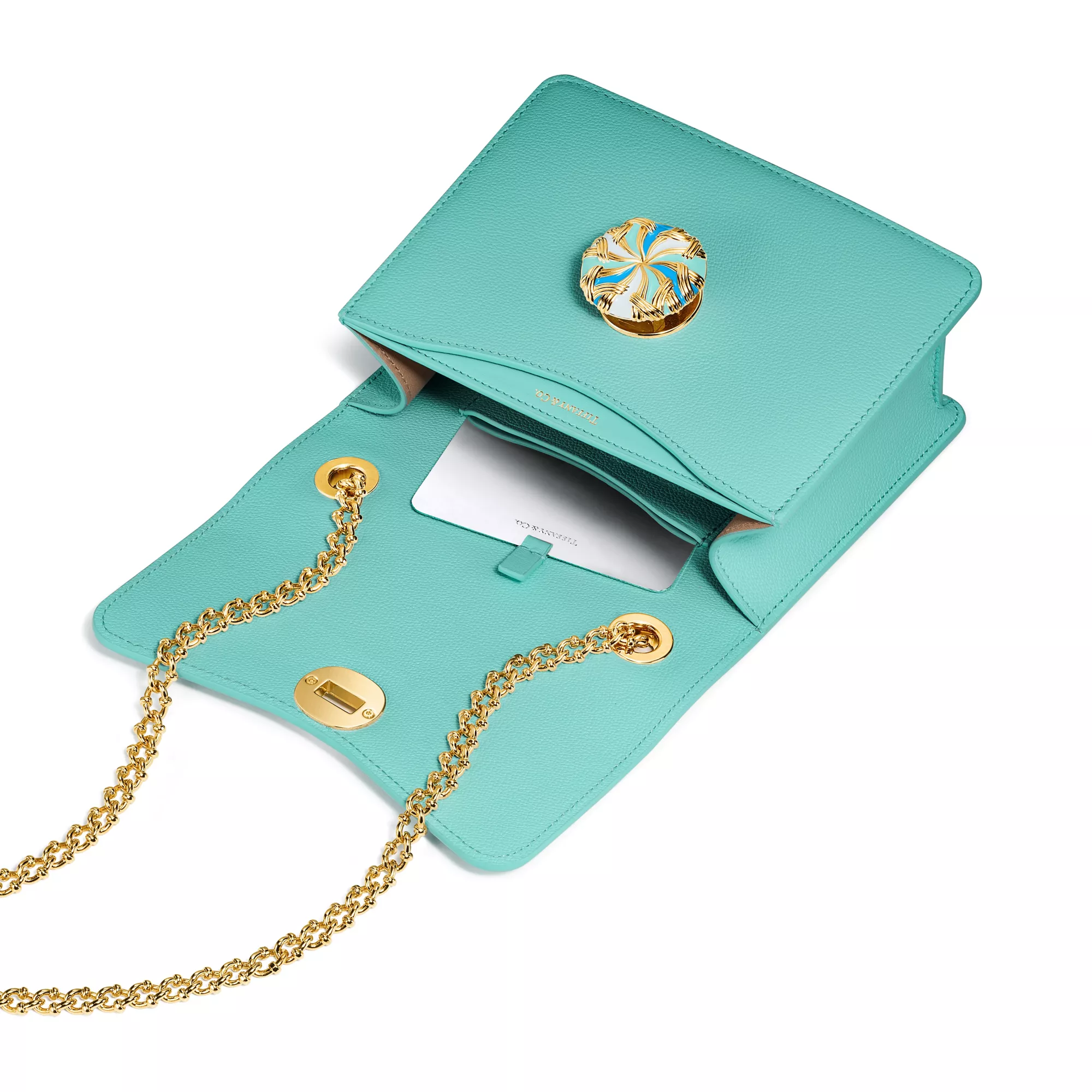 The Jean Schlumberger by Tiffany Ribbons collection is inspired by the legendary designer’s family history in the textile industry and the ornate trim he frequently incorporated into his creations. Crafted from grained calf leather, this bag features a front slip pocket lined with Tiffany Blue® and an interior back pocket with a removable mirror. The Tiffany Blue® enamel and gold-plated brass closure nods to a motif seen on a compact mirror designed by Jean Schlumberger in 1957.