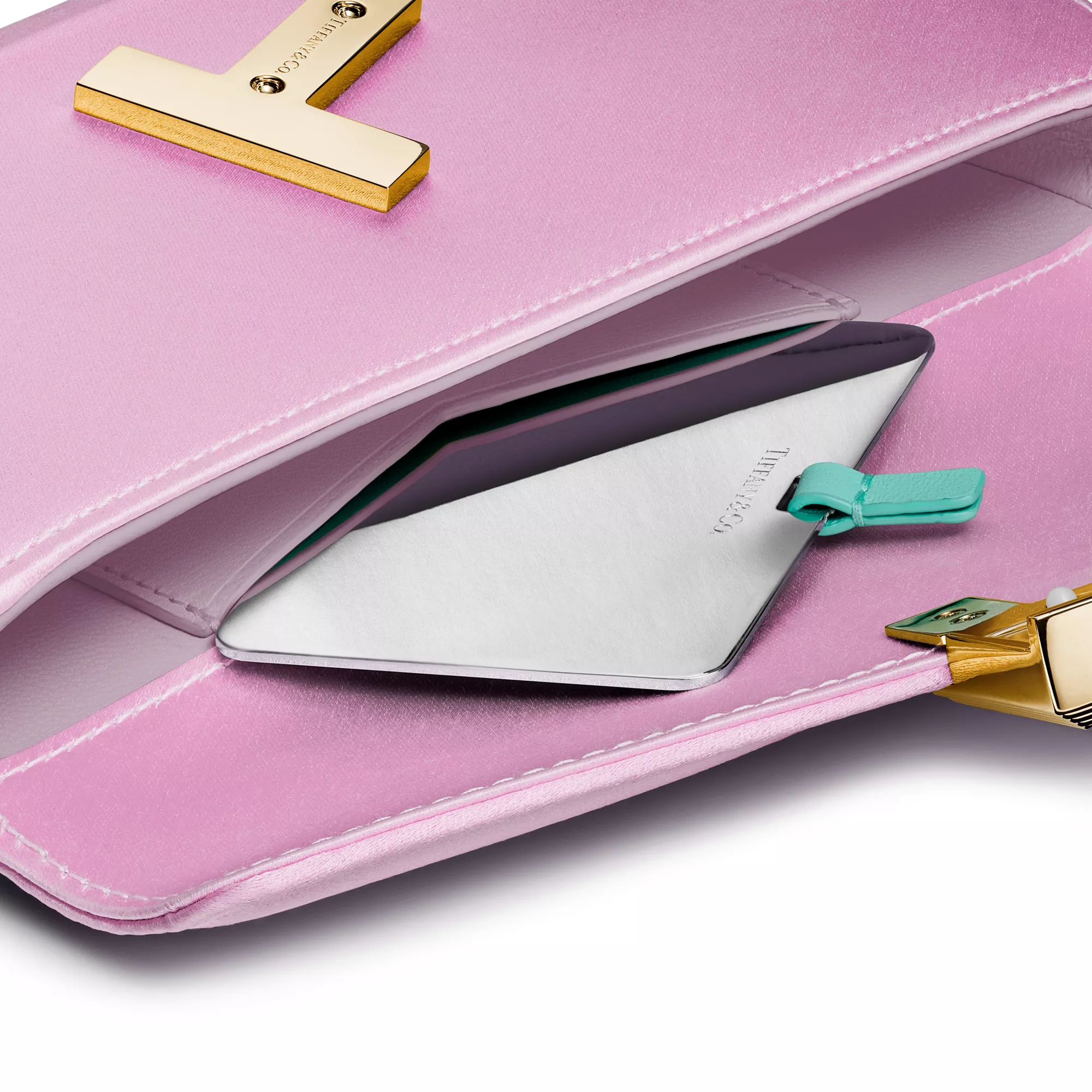 Inspiring, empowering and above all, unwavering, the Tiffany T collection reminds us of the connections we feel but cannot always see. This Tiffany T mini clutch is crafted in satin with gold-plated brass hardware. It features a small pocket with a removable mirror, a magnet closure and a Tiffany T logo on the front.