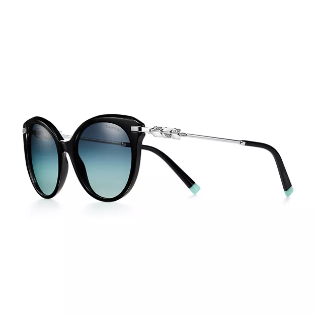 Inspired by the beauty of nature, Tiffany Victoria® designs capture the organic movement of flowers, vines and leaves with meticulously cut diamonds. These cat eye sunglasses turn the collection’s signature motif into a statement detail with Austrian crystals. Sleek frames are expertly crafted with black acetate, silver-coloured metal, gradient Tiffany Blue® lenses and Tiffany Blue® accents.