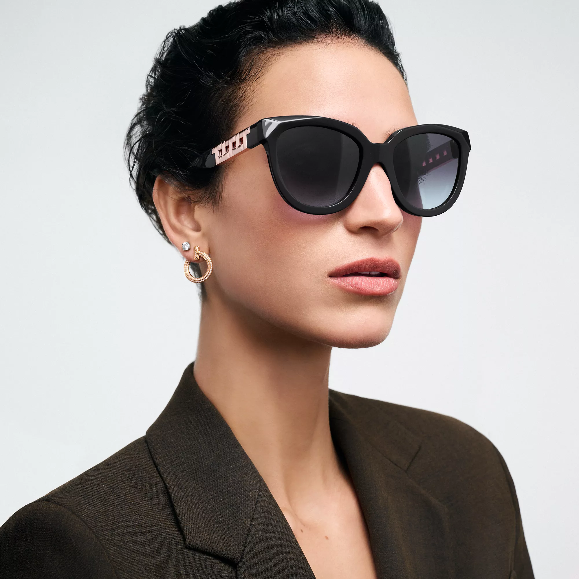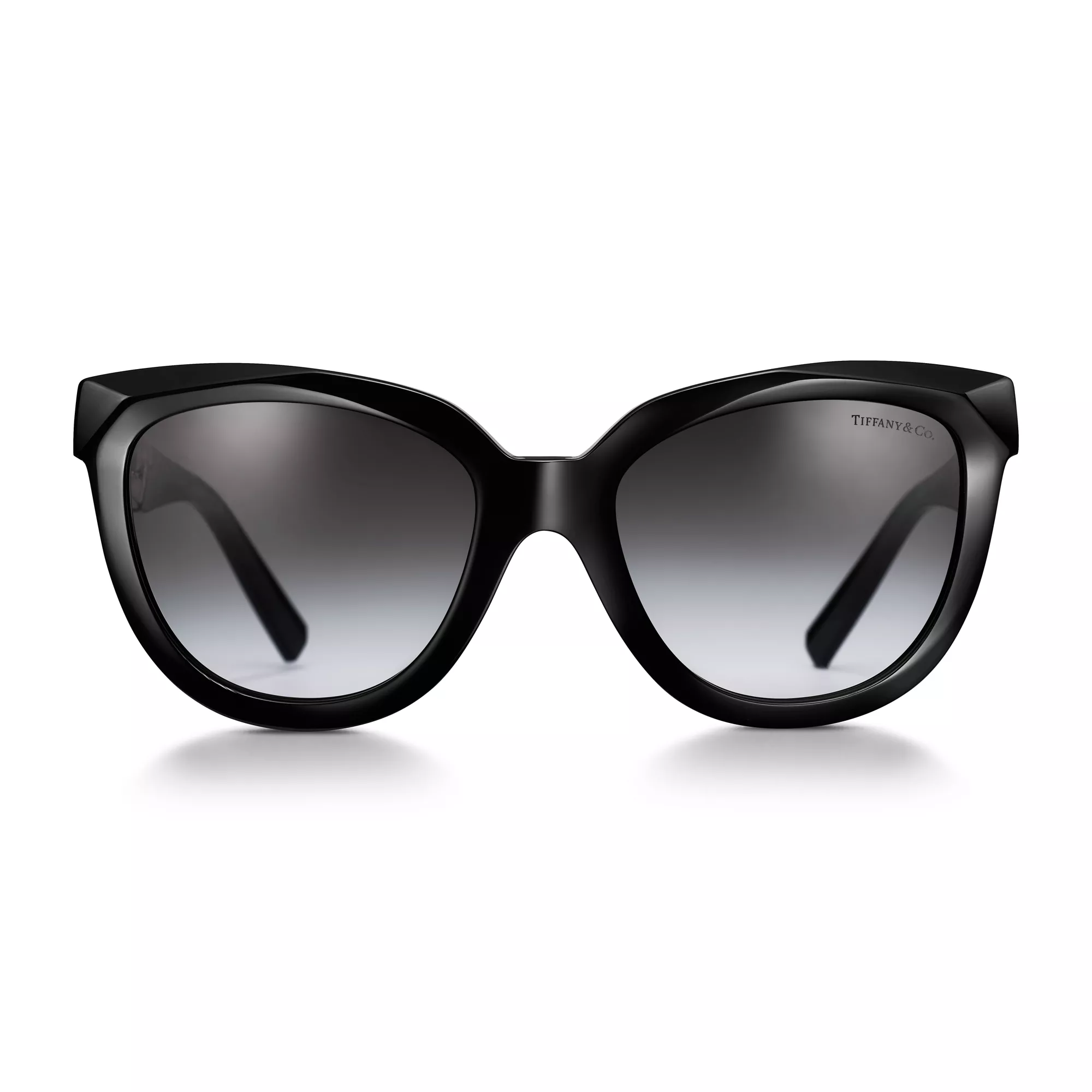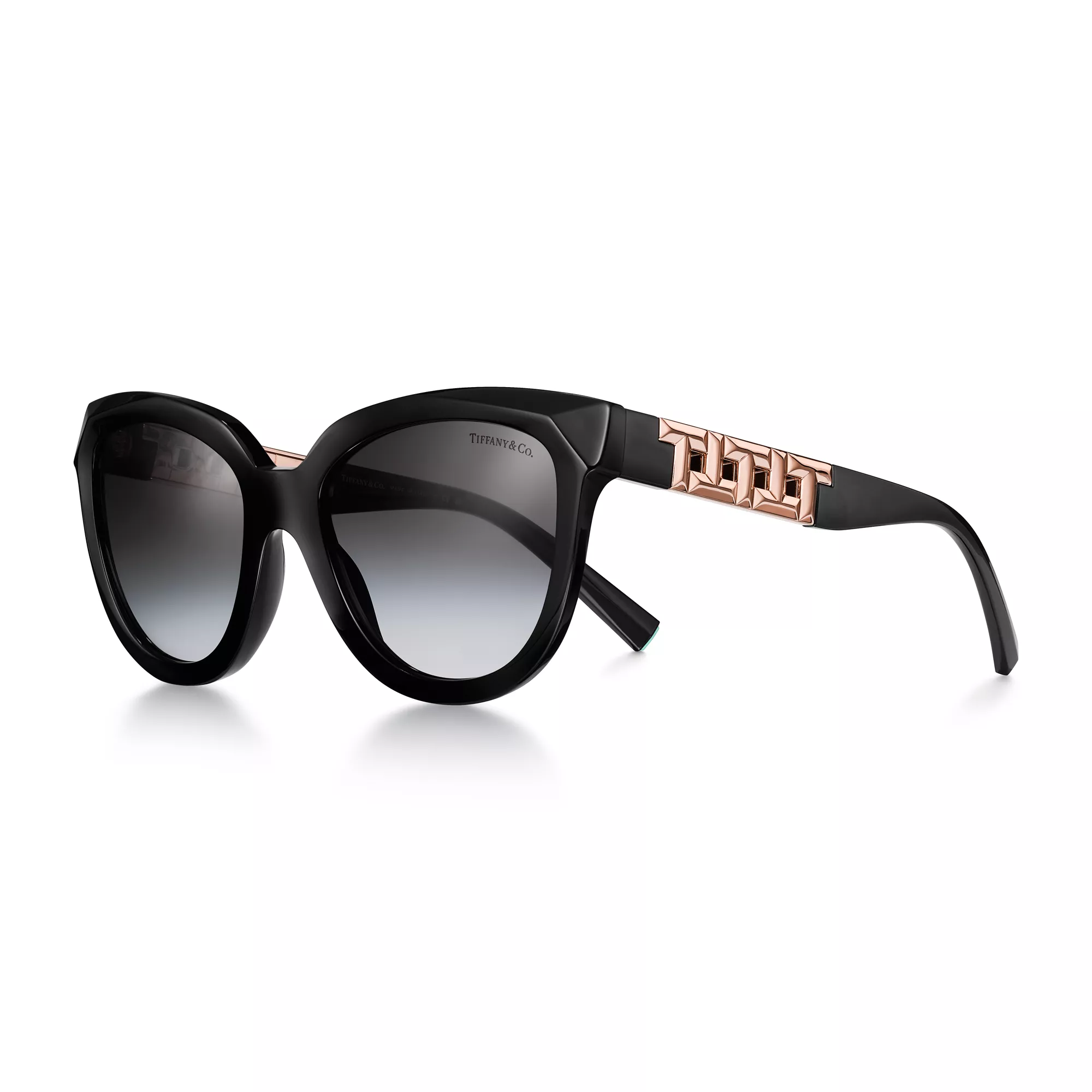 Tiffany's iconic House code returns. Tiffany T sunglasses feature a striking temple design inspired by our favourite letter. This pair of sunglasses is crafted in black acetate with rose gold-coloured metal accents and grey gradient cat eye lenses.