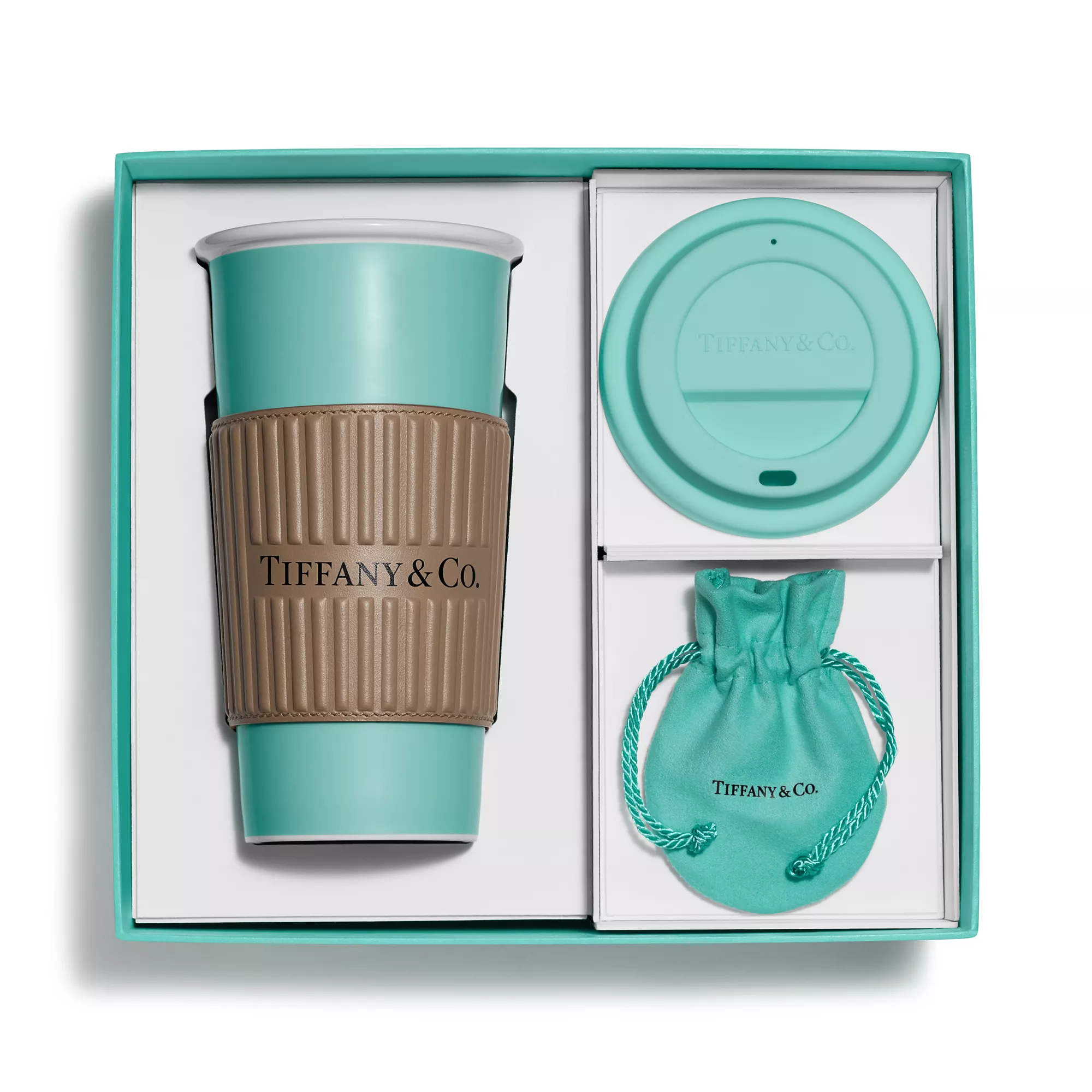 Tiffany artisans transform utilitarian items into handcrafted works of art. Crafted in bone china, this contemporary coffee cup set features a large coffee cup, a Tiffany & Co.-branded leather cup sleeve, a silicone lid and a Return to Tiffany™ sterling silver lid plug. Take this cup on the go or pair it with our selection of Tiffany Home accessories as a gift.