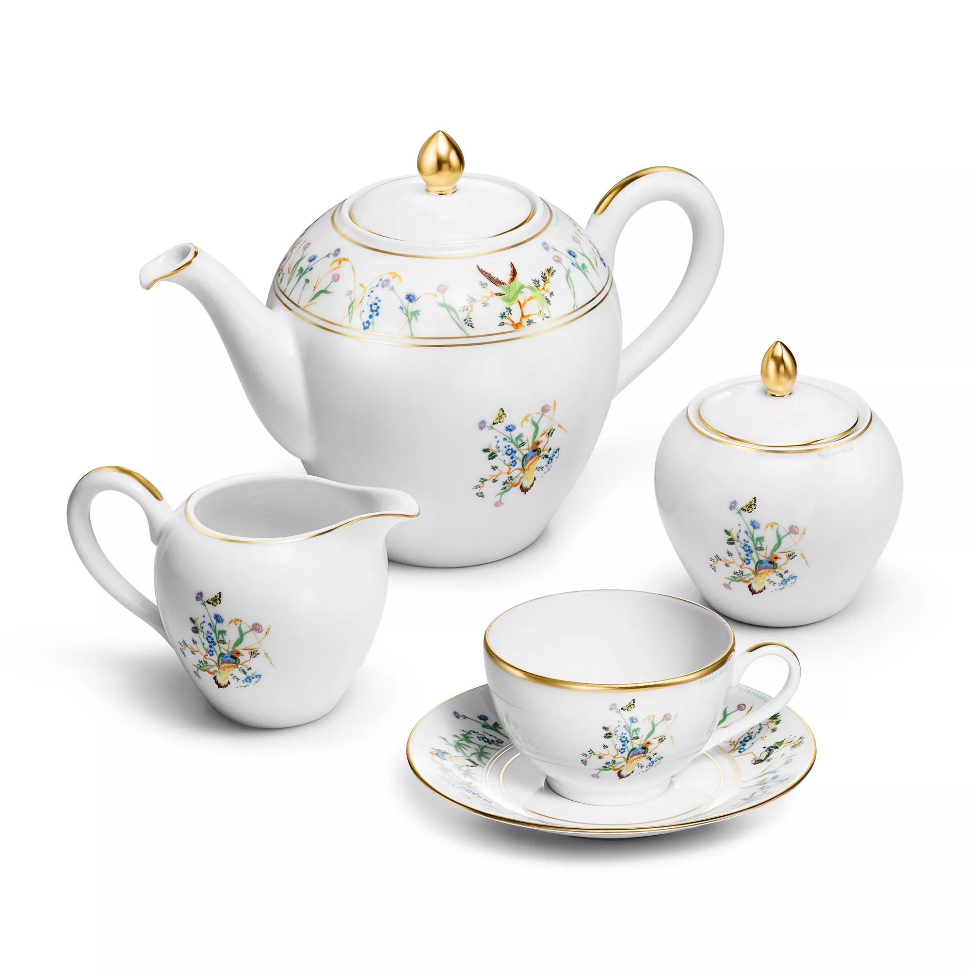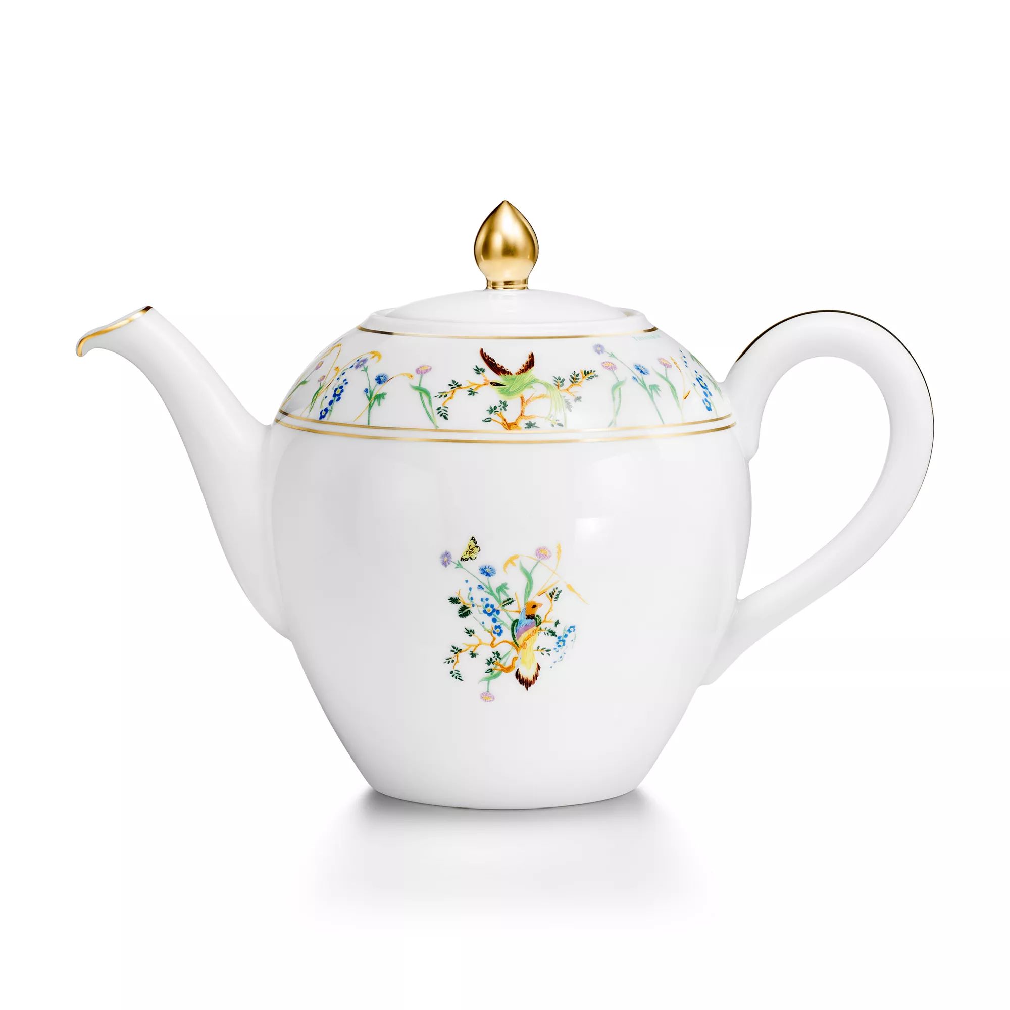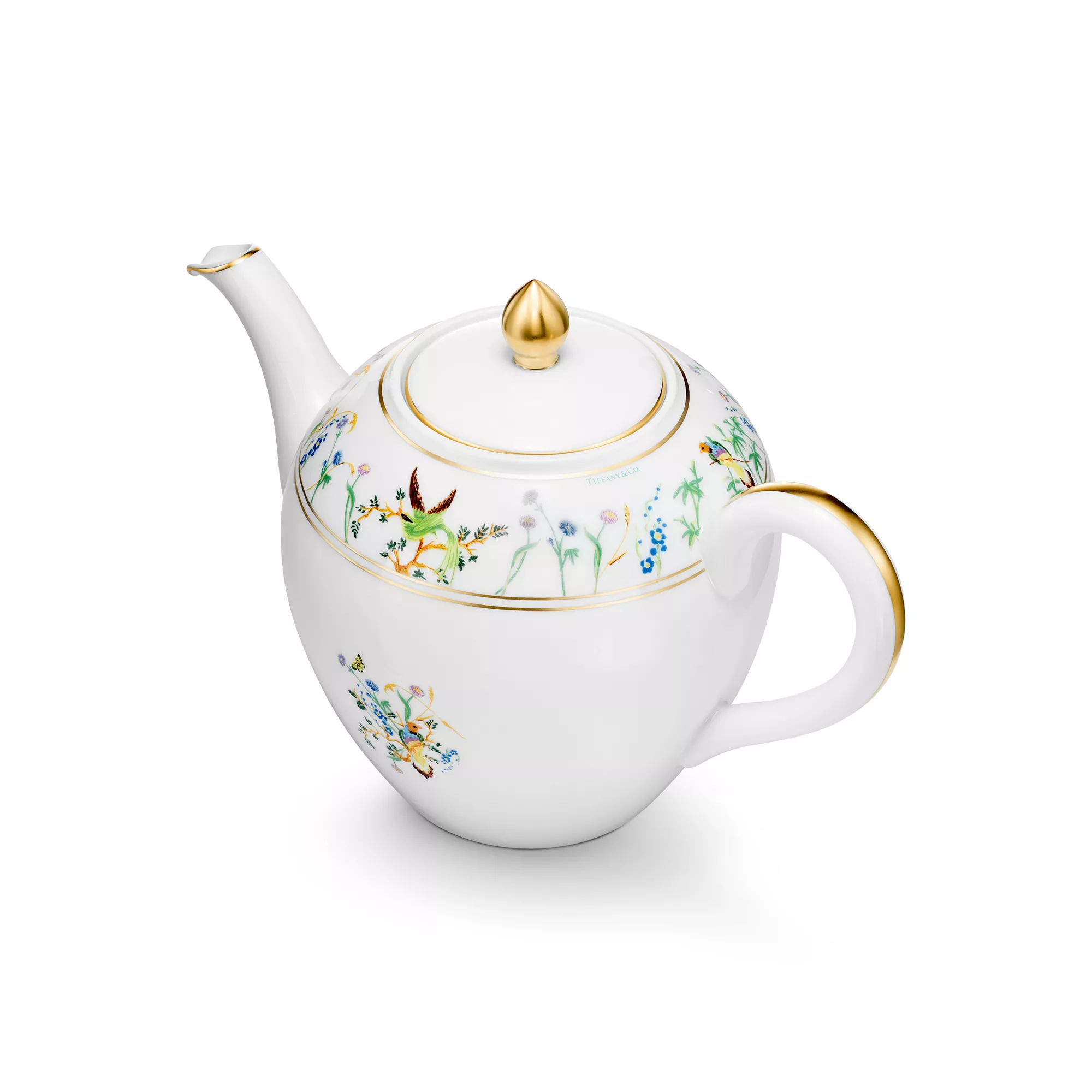 Featuring flora and fauna motifs first introduced on 19th-century Tiffany & Co. hollowware, the Tiffany Jardin collection captures the beauty of the natural world. Delicate illustrations of birds, butterflies and flowers teem with life; and a hand-painted gold rim and handle add a refined finish to this porcelain teapot. Set your table with the complete Tiffany Jardin collection or style with other Tiffany & Co. tableware to create an unexpected look.