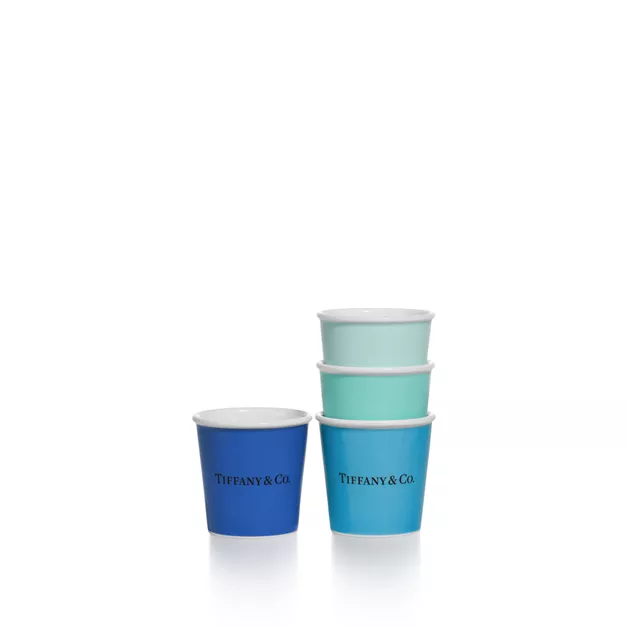 Tiffany artisans transform utilitarian items into handcrafted works of art. Crafted in bone china, this contemporary set of four espresso cups features four distinct shades of blue, creating a beautiful ombré effect when used together.