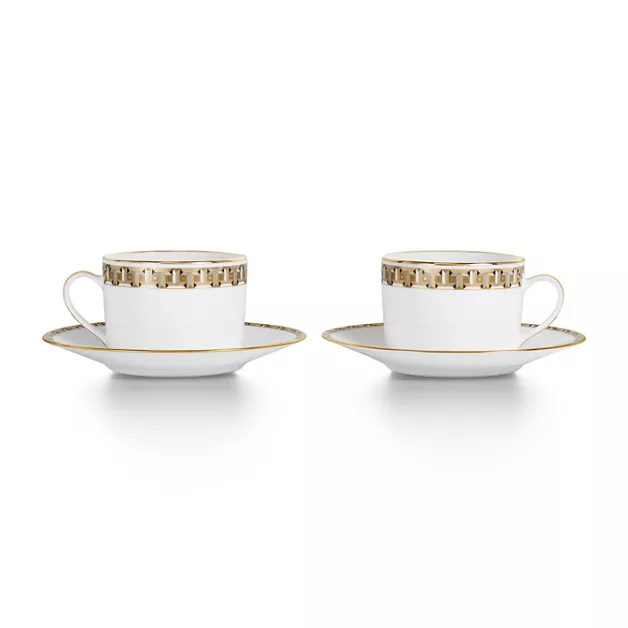 Inspired by the jewellery collection of the same name, Tiffany T True dinnerware brings radiance to the table. Crafted from Limoges porcelain, a geometric interpretation of the Tiffany T True motif adorns this set of two cups and saucers with a hand-painted gold rim. Mix with Tiffany T True dessert plates in different colours for a surprising table setting.