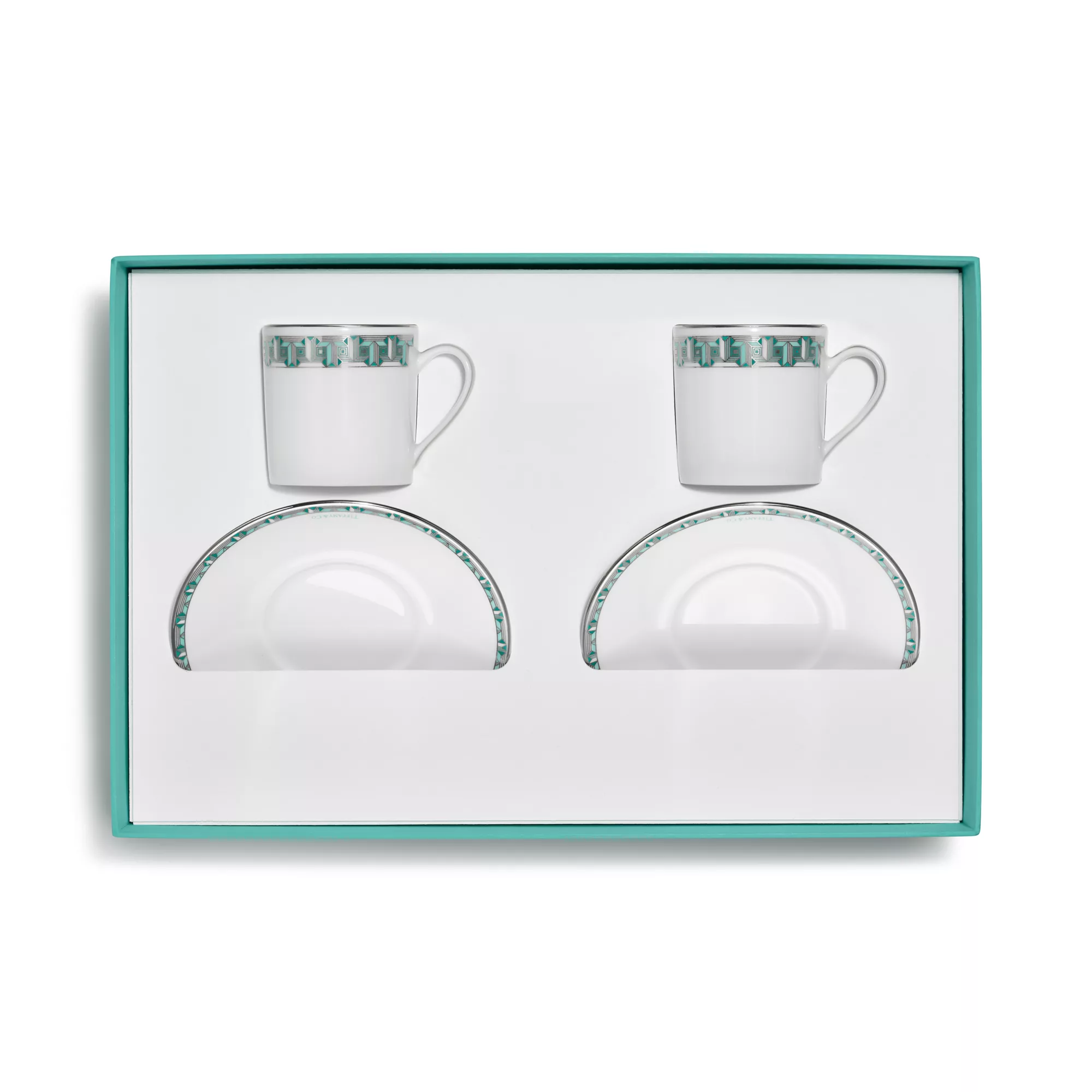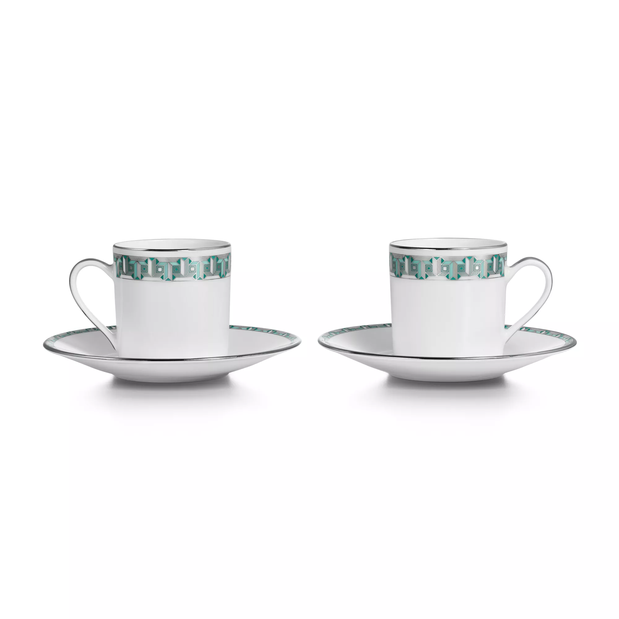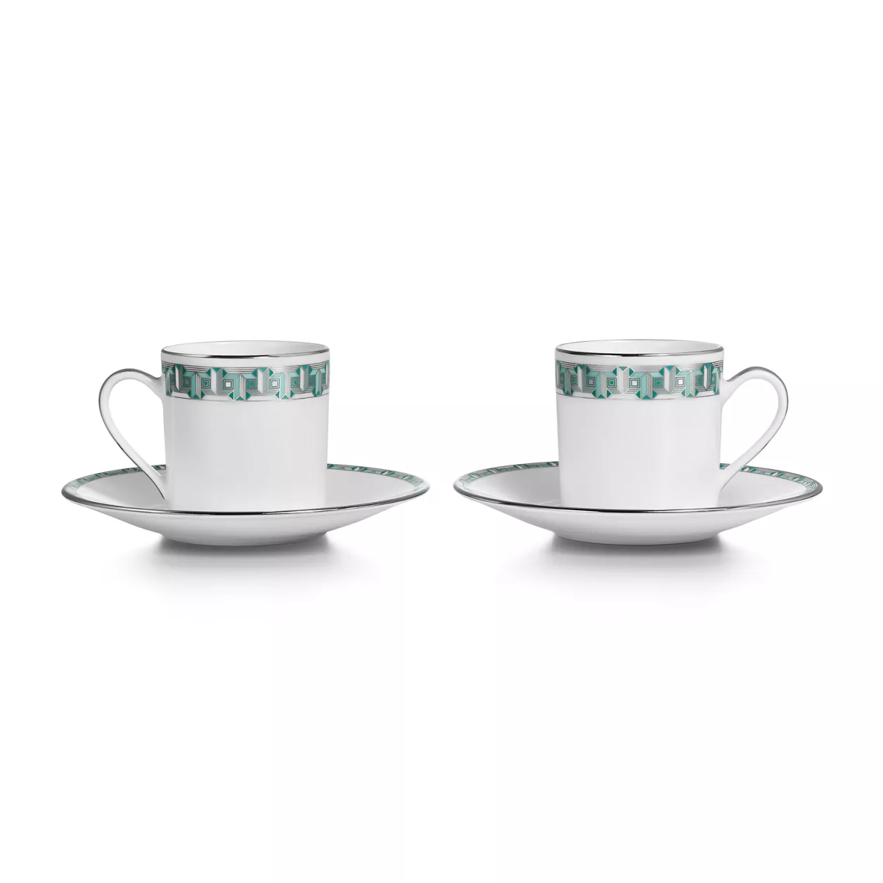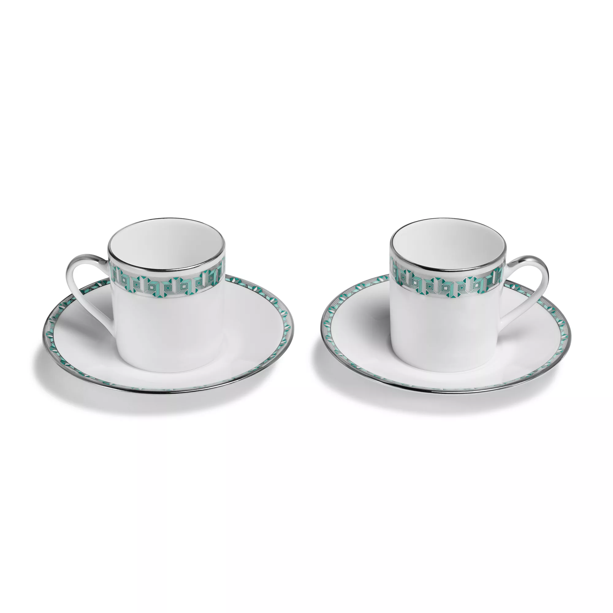 Inspired by the jewellery collection of the same name, Tiffany T True dinnerware brings radiance to the table. Crafted from Limoges porcelain, a geometric interpretation of the Tiffany T True motif adorns this set of two espresso cups and saucers with a hand-painted platinum rim. Mix with Tiffany T True dessert plates in different colours for a surprising table setting.