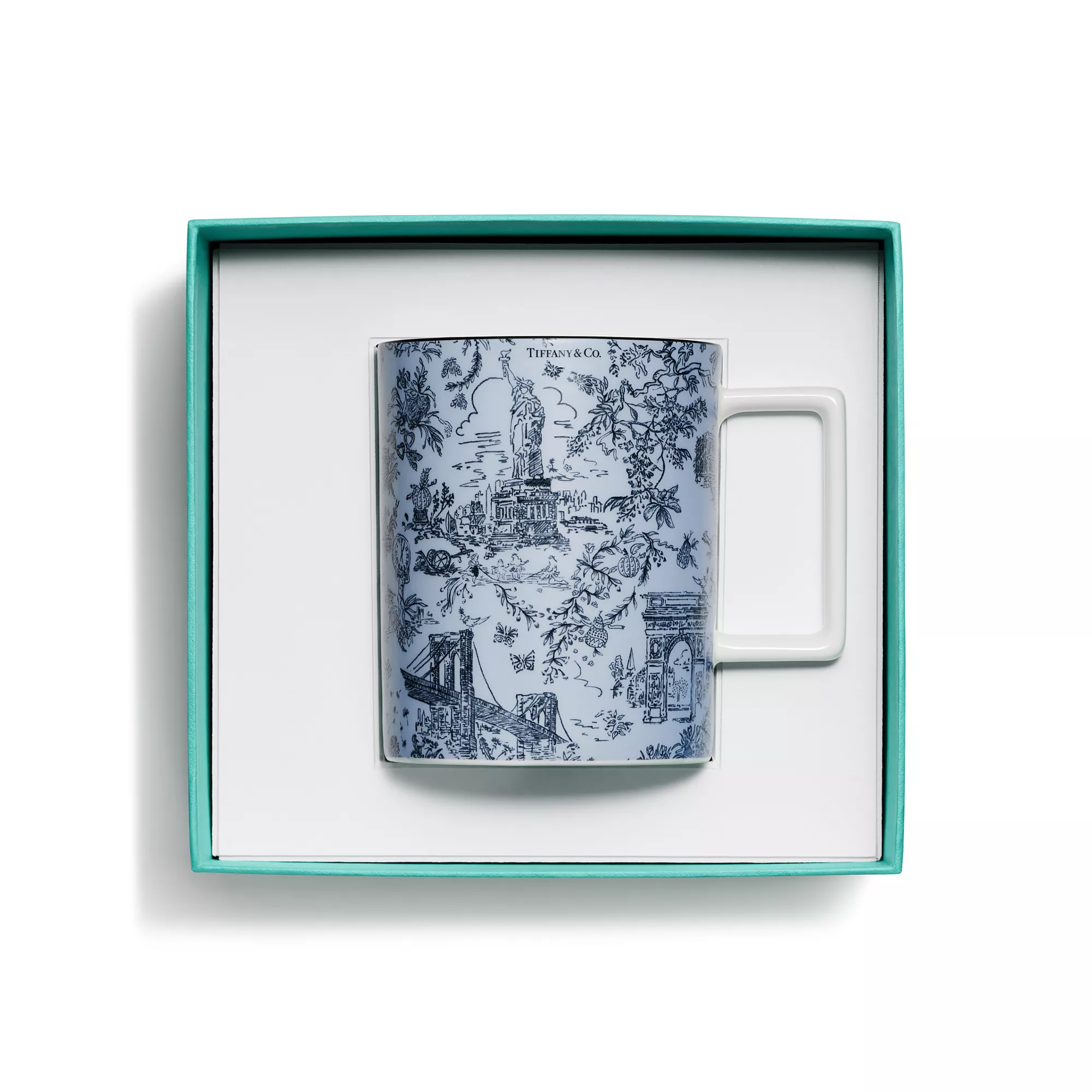 Tiffany Toile designs are a whimsical tribute to Tiffany's hometown and its heritage. Playful yet elegant, the artwork is inspired by an illustration of New York City from The Tiffany Archives. The Brooklyn Bridge meets Bird on a Rock; the Statue of Liberty mingles with a Tiffany & Co. diamond. This sapphire-coloured mug features the elaborate print with a black hand-painted rim. Pair the mug with a Tiffany Toile plate to create a set of your own.