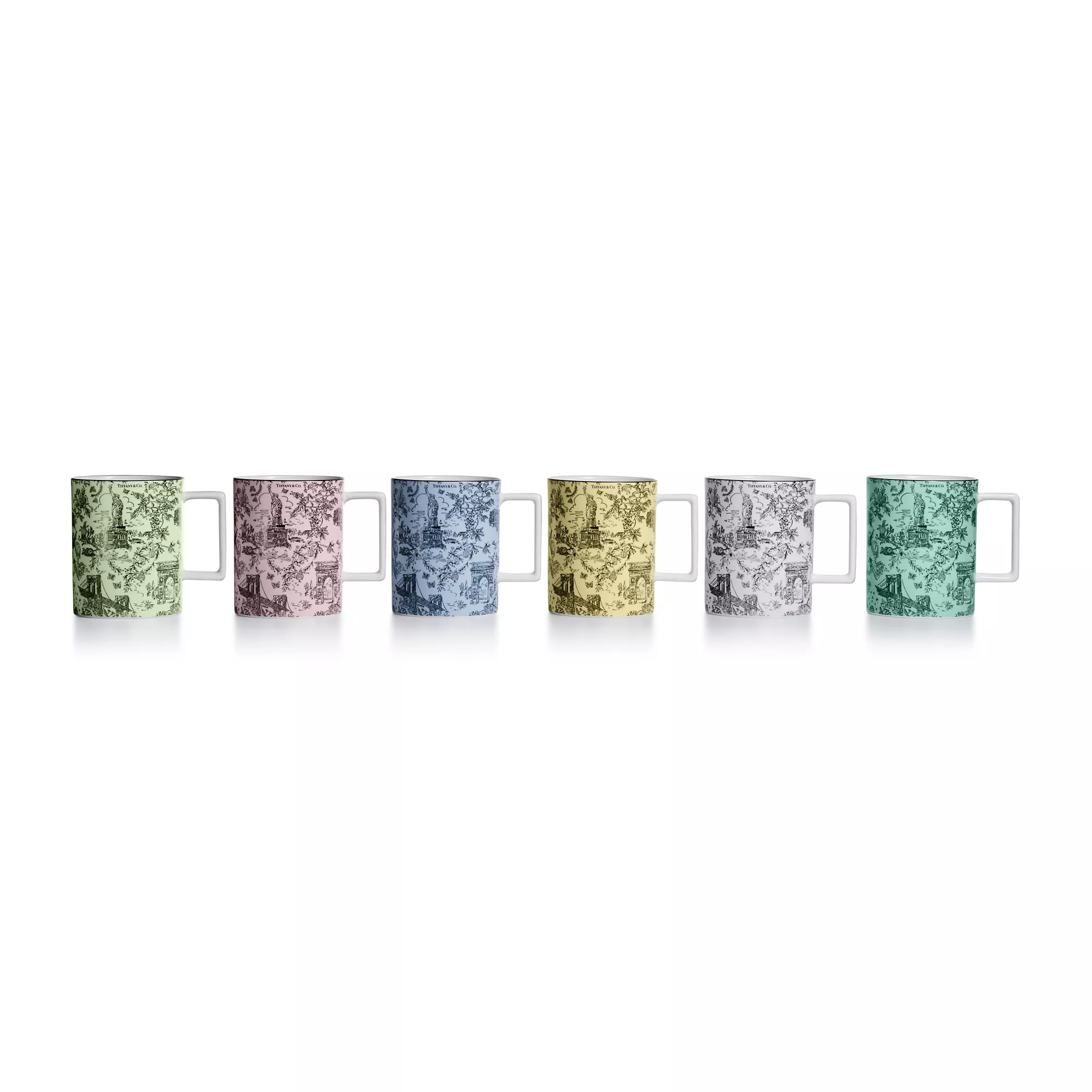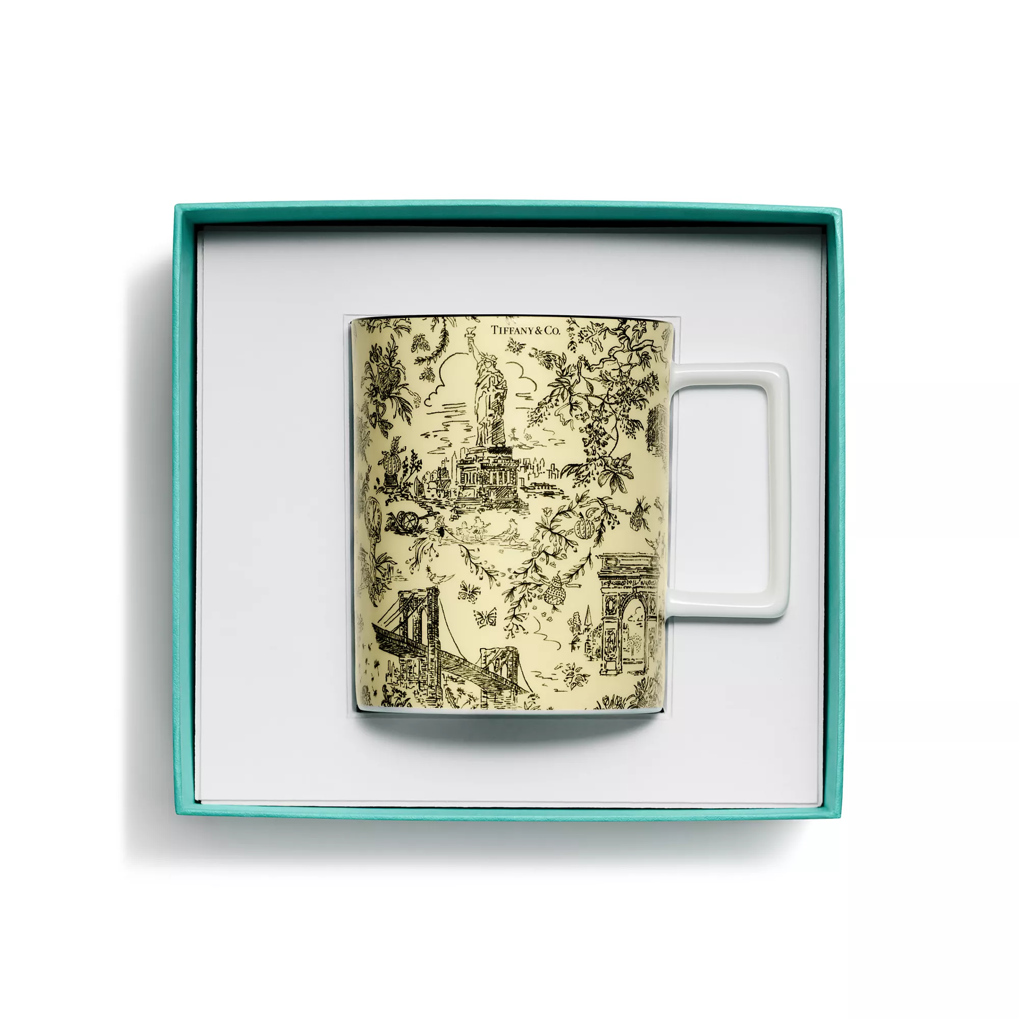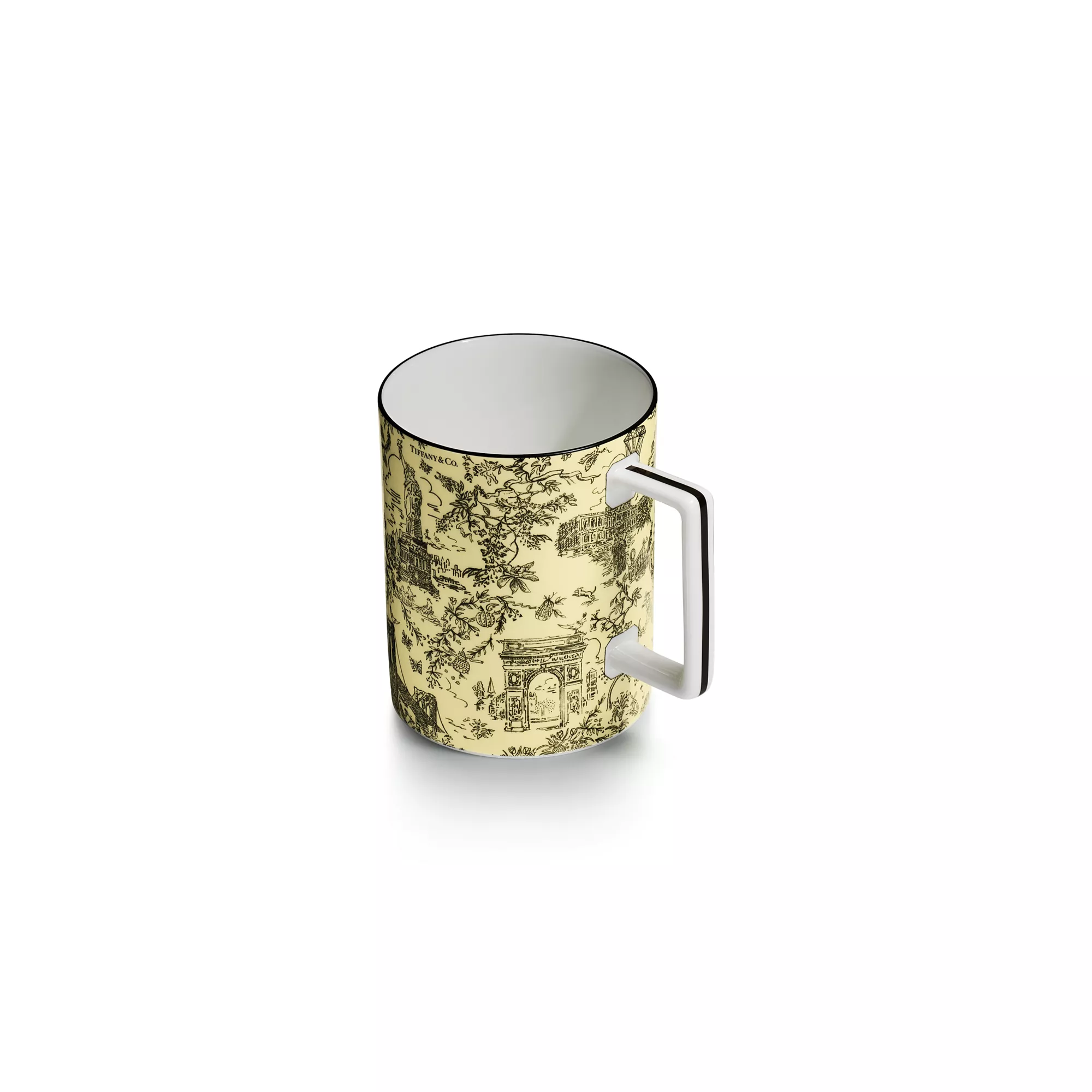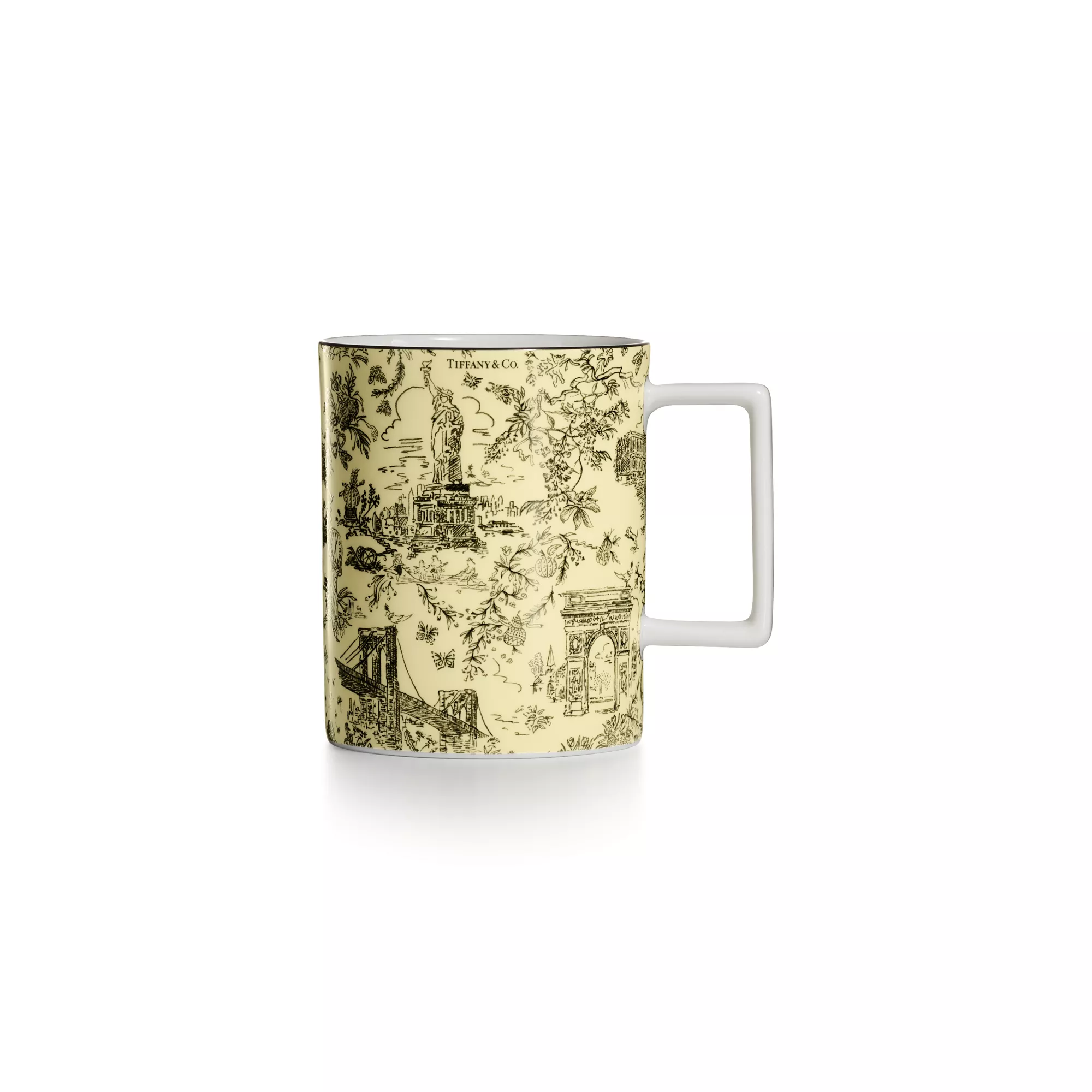 Tiffany Toile designs are a whimsical tribute to Tiffany's hometown and its heritage. Playful yet elegant, the artwork is inspired by an illustration of New York City from The Tiffany Archives. The Brooklyn Bridge meets Bird on a Rock; the Statue of Liberty mingles with a Tiffany & Co. diamond. This yellow diamond-coloured mug features the elaborate print with a black hand-painted rim. Pair the mug with a Tiffany Toile plate to create a set of your own.