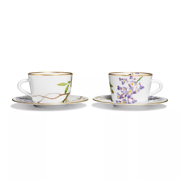 The Tiffany Wisteria collection draws from wisteria-inspired masterpieces from The Tiffany Archives. Reimagining this motif, the hand-painted florals imbue each design with a sense of timeless, feminine elegance. Crafted from Limoges porcelain, this teacup and saucer set features a hand-painted gold rim, elevating any table setting.