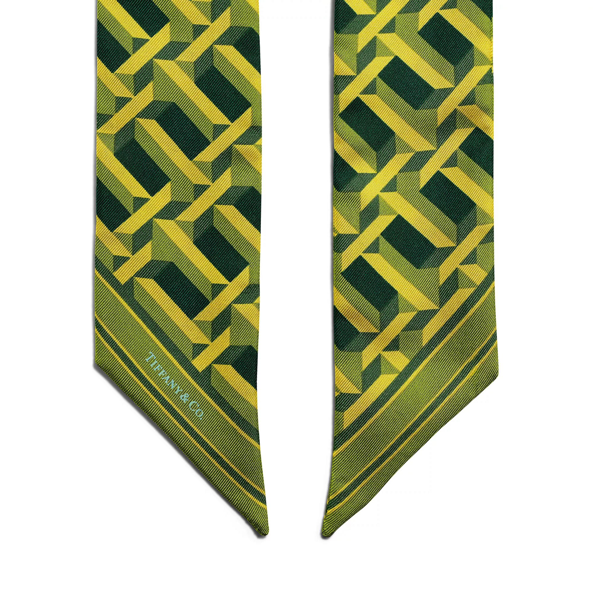 The Tiffany T collection is inspired by our favourite letter. A bold pattern of alternating Ts in an emerald green and citrine yellow palette decorates this silk ribbon scarf. Pair with a Tiffany scarf ring or artfully tie around your favourite handbag.