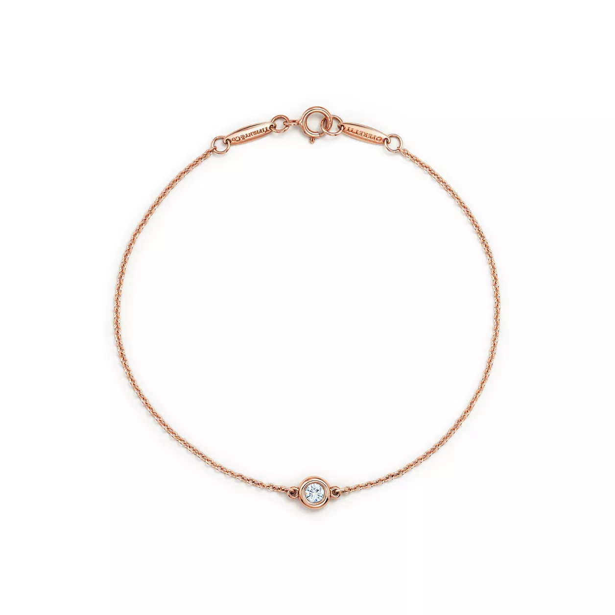 Tiffany round diamonds catch the light and make it dance. Bracelet in 18k rose gold with a round brilliant diamond. 7.25" long. Carat weight .10. Original designs copyrighted by the Nando and Elsa Peretti Foundation.