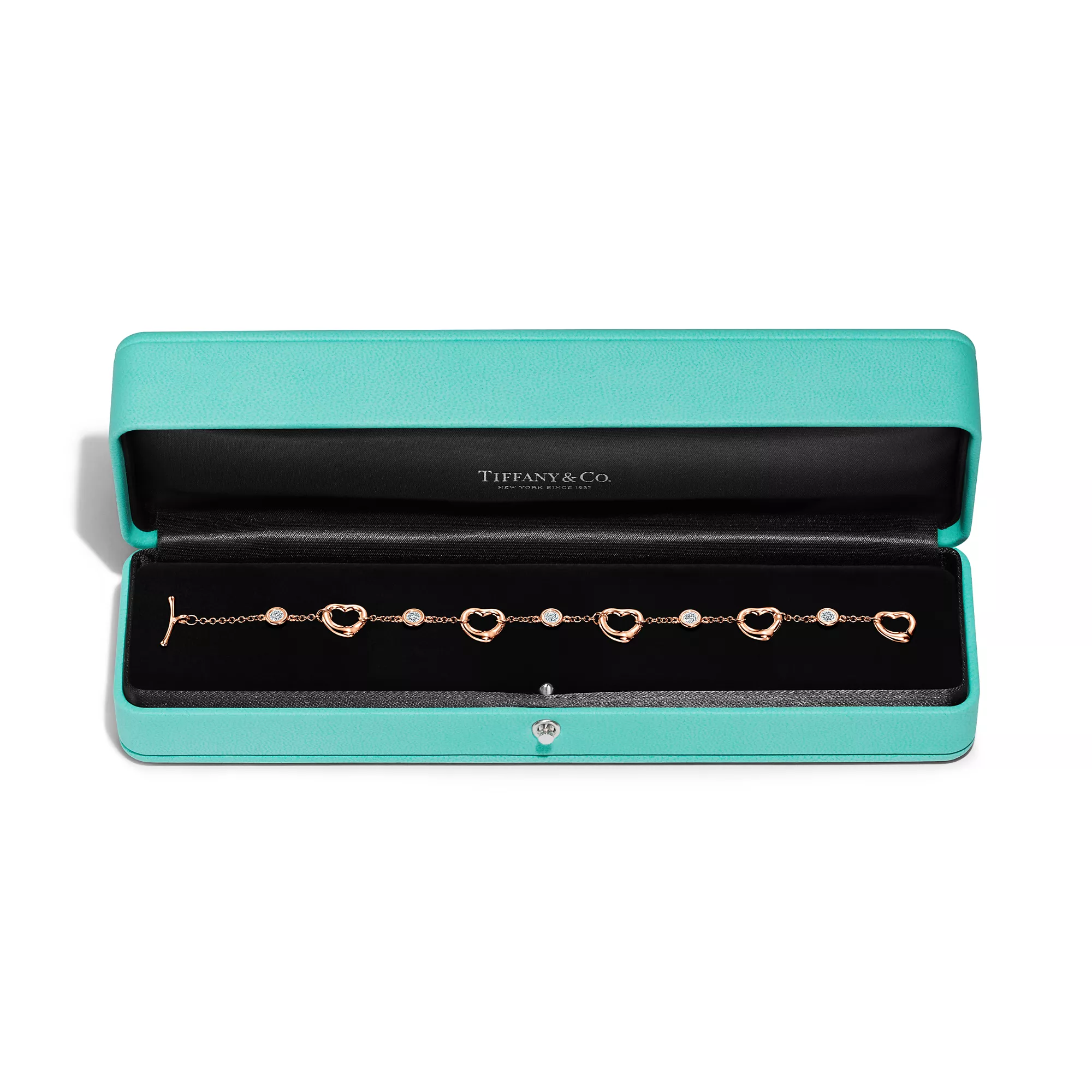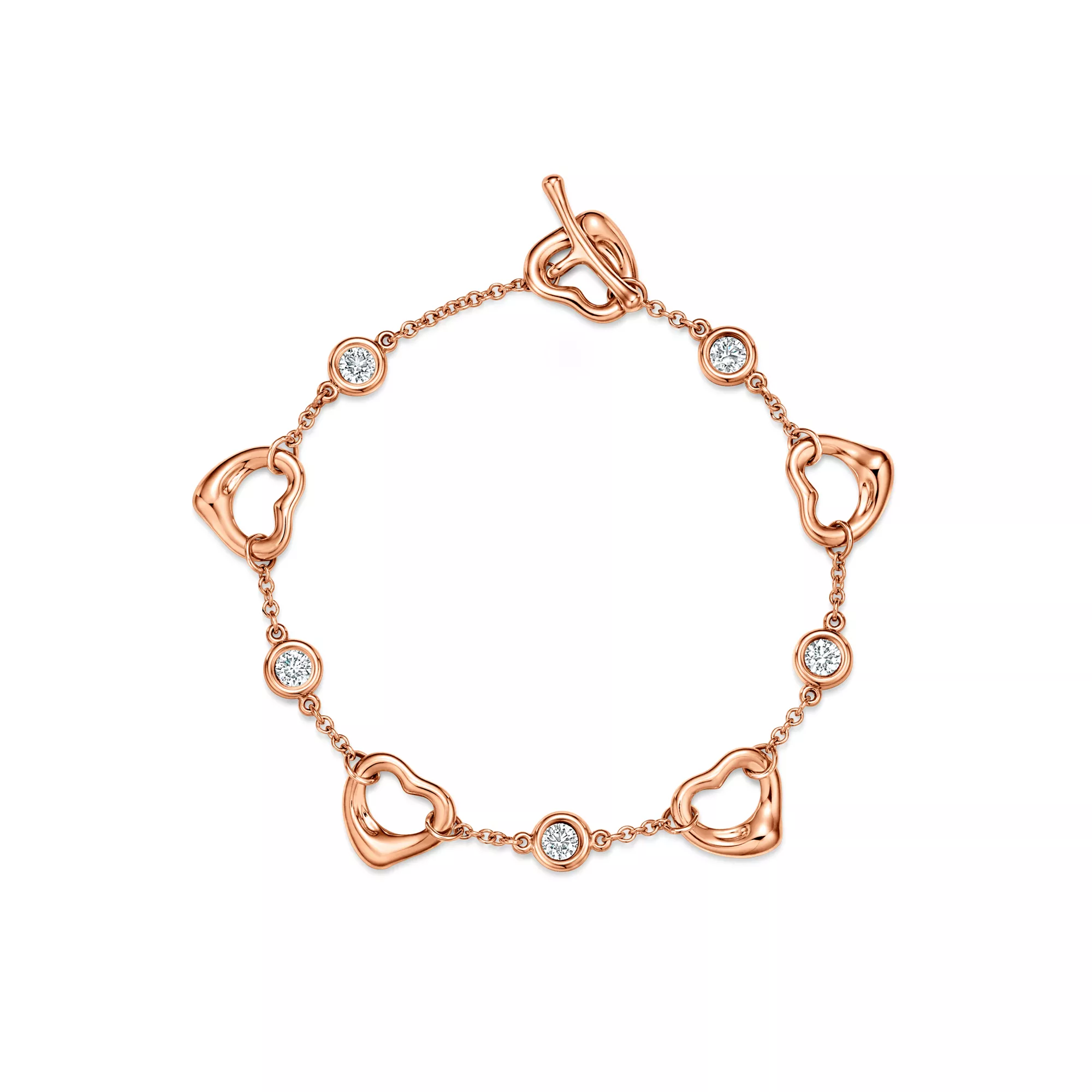 The simple, evocative shape of Elsa Peretti Open Heart designs are an expression of love's limitless bounds. A testament to Peretti’s affinity for craftsmanship and form, the collection reinterprets the heart shape with an organic and sculptural approach that transcends the sentimentality of this universal symbol. This 18k rose gold bracelet features Diamonds by the Yard®, a combination of fine, fluid chains and bezel-set stones that forever changed the role of diamonds in fashion. Wear this piece by itself or mix with your everyday bracelet stack for a bold look.