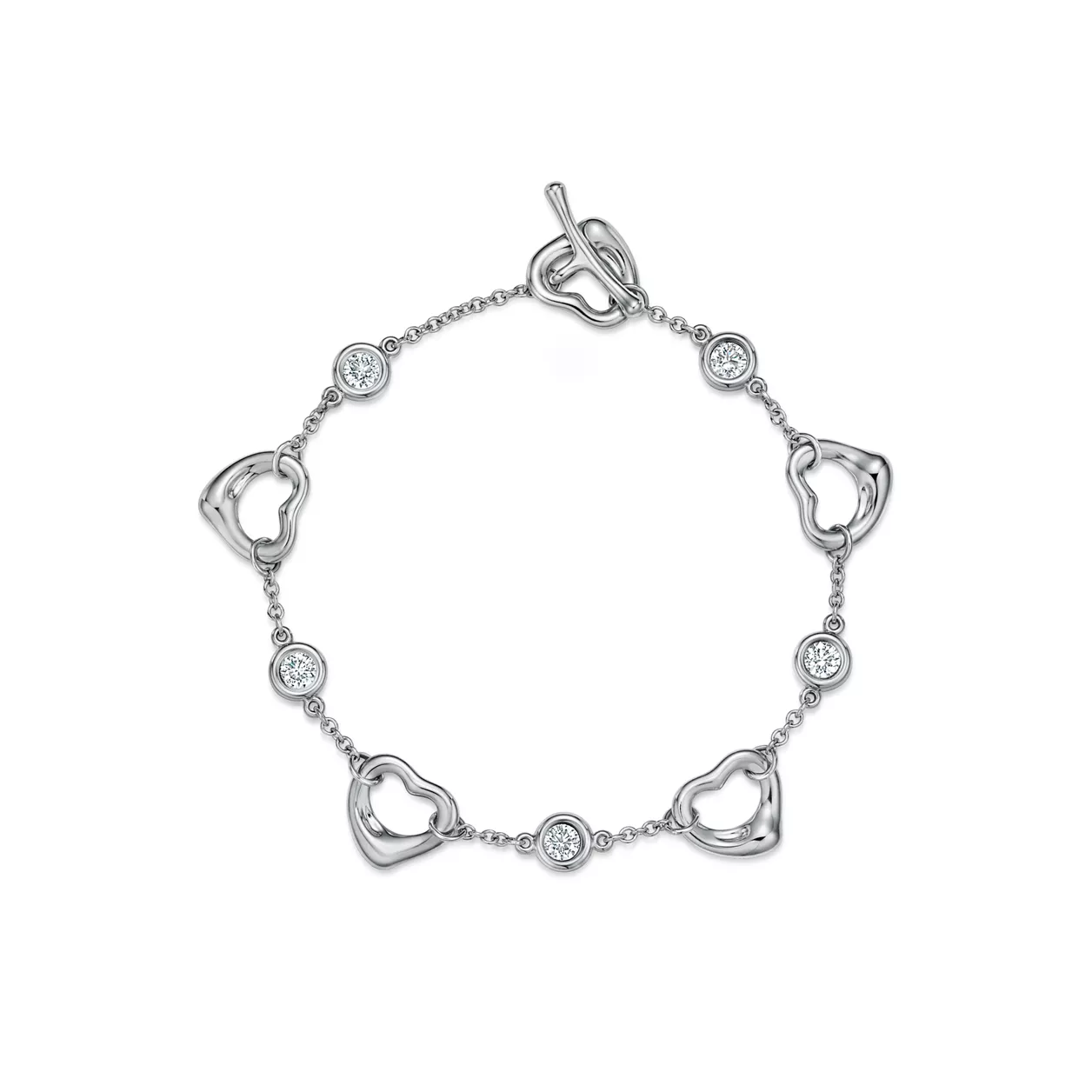 The simple, evocative shape of Elsa Peretti Open Heart designs are an expression of love's limitless bounds. A testament to Peretti’s affinity for craftsmanship and form, the collection reinterprets the heart shape with an organic and sculptural approach that transcends the sentimentality of this universal symbol. This platinum bracelet features Diamonds by the Yard®, a combination of fine, fluid chains and bezel-set stones that forever changed the role of diamonds in fashion. Wear this piece by itself or mix with your everyday bracelet stack for a bold look.