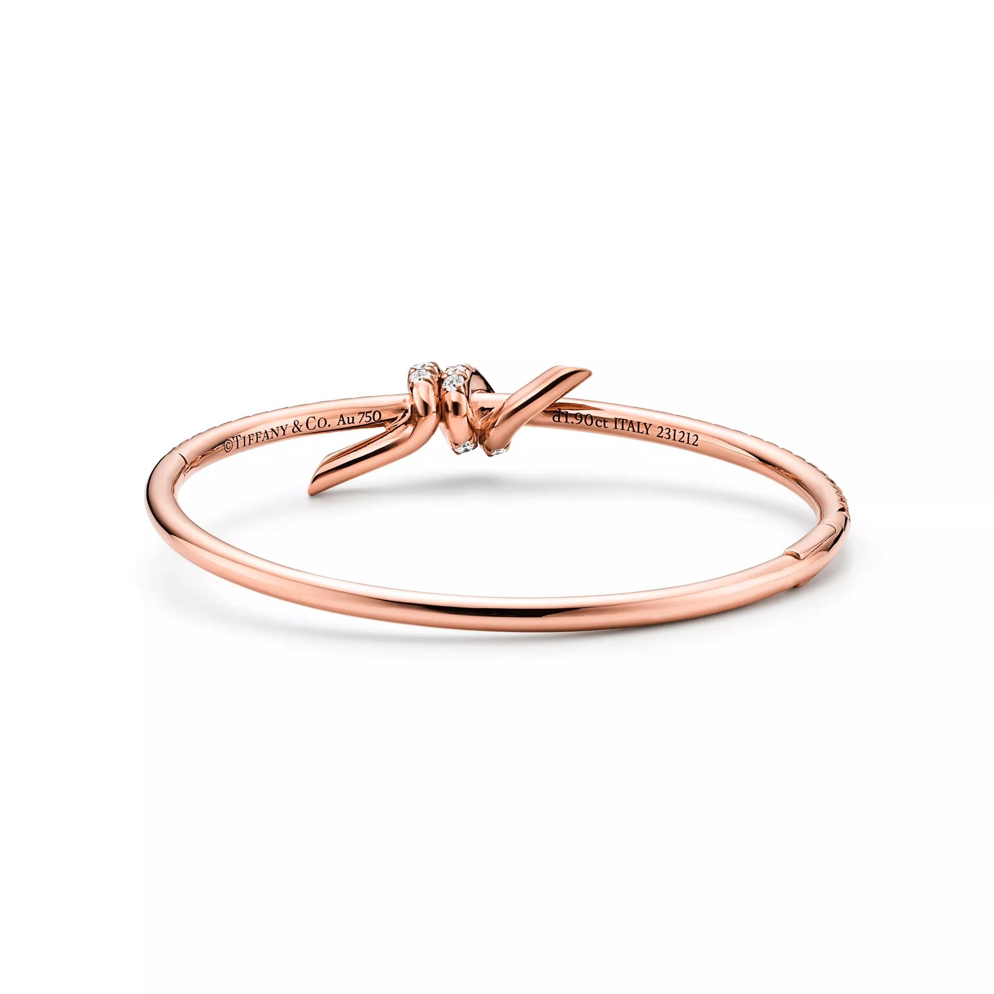 Tiffany Knot is an expression of love’s unwavering bonds. Inspired by an archival bow crafted in 1889, Knot is a symbol of life’s most enduring ties and meaningful connections. This bangle is crafted of 18k rose gold and polished by hand for high shine. Each round brilliant diamond—specifically chosen to meet Tiffany’s high standards—is hand set at precise angles to maximise brilliance. Wear this bangle on its own or partnered with classic silhouettes for an unexpected pairing.