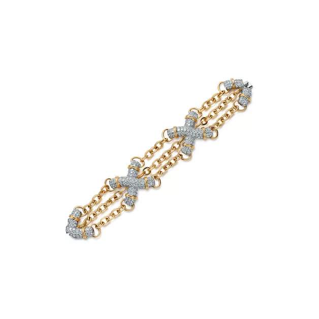 As one of the 20th century’s most gifted artists, Jean Schlumberger’s visionary creations are among the world’s most intricate designs. Born into a prominent family of textile merchants in Alsace, France, his self-taught early beginnings influenced some of his greatest creations. This pavé X link bracelet showcases the designer’s signature cross-stitch motif in graphic scale with voluminous chains, embracing his bold interpretation of texture.