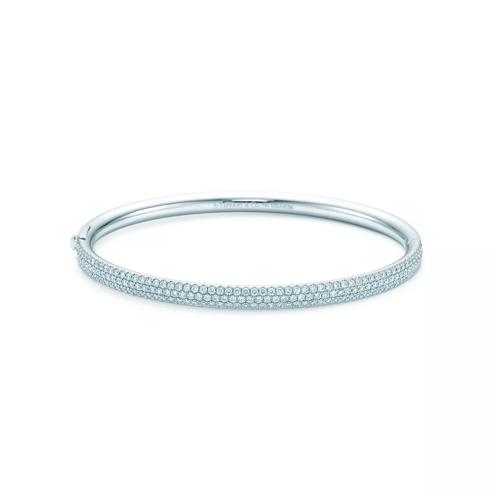 Streamlined and modern, the Tiffany Metro collection twinkles like a nighttime city skyline. Scintillating diamonds complement this bangle's minimal design.