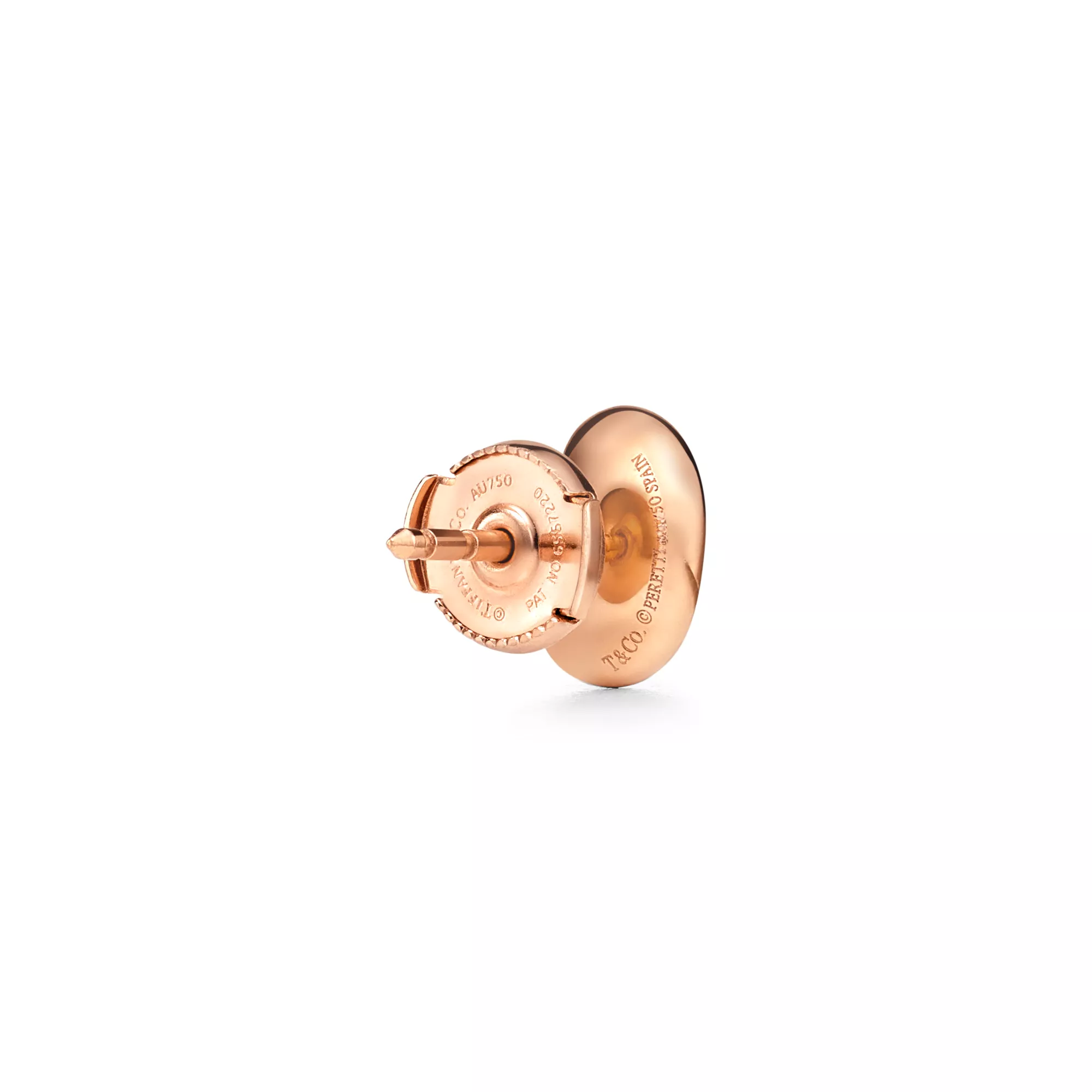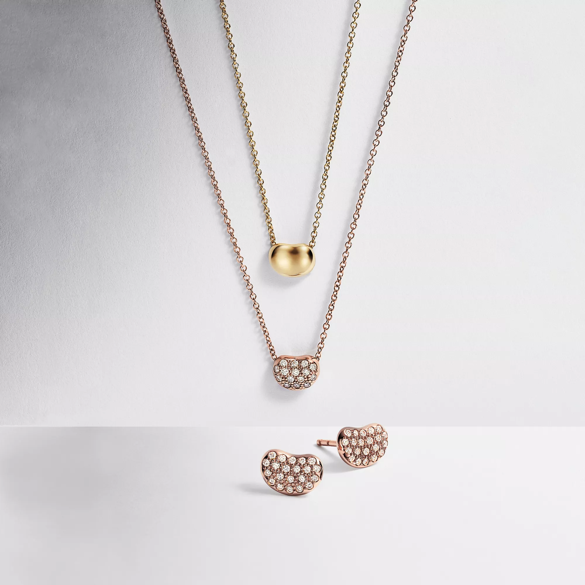 The bean represents the origin of all things. Earrings in 18k rose gold with pavé diamonds, 9 mm wide. Carat total weight .25. Original designs copyrighted by the Nando and Elsa Peretti Foundation.