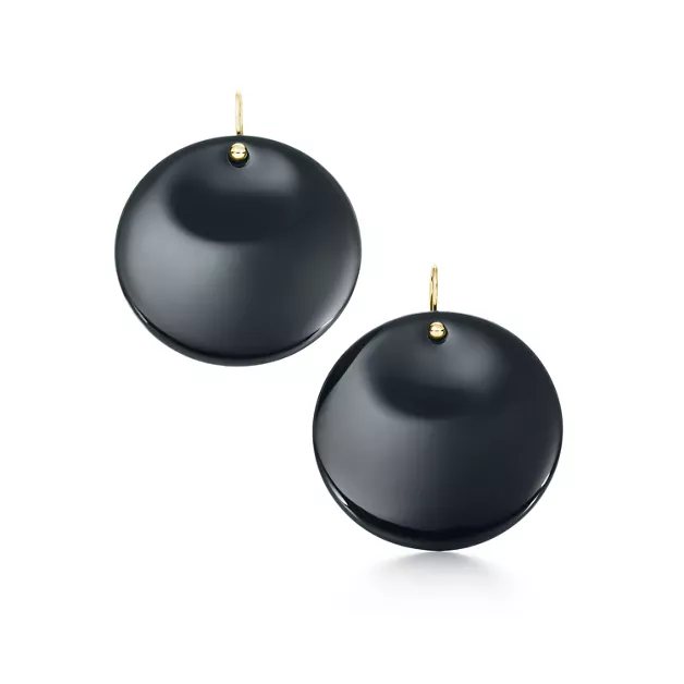 Sculpted to a sensual perfection, this seminal form retains its mysterious allure for all time. Earrings in black lacquer over Japanese hardwood with 18k gold hooks, for pierced ears. 40 mm. Original designs copyrighted by the Nando and Elsa Peretti Foundation.