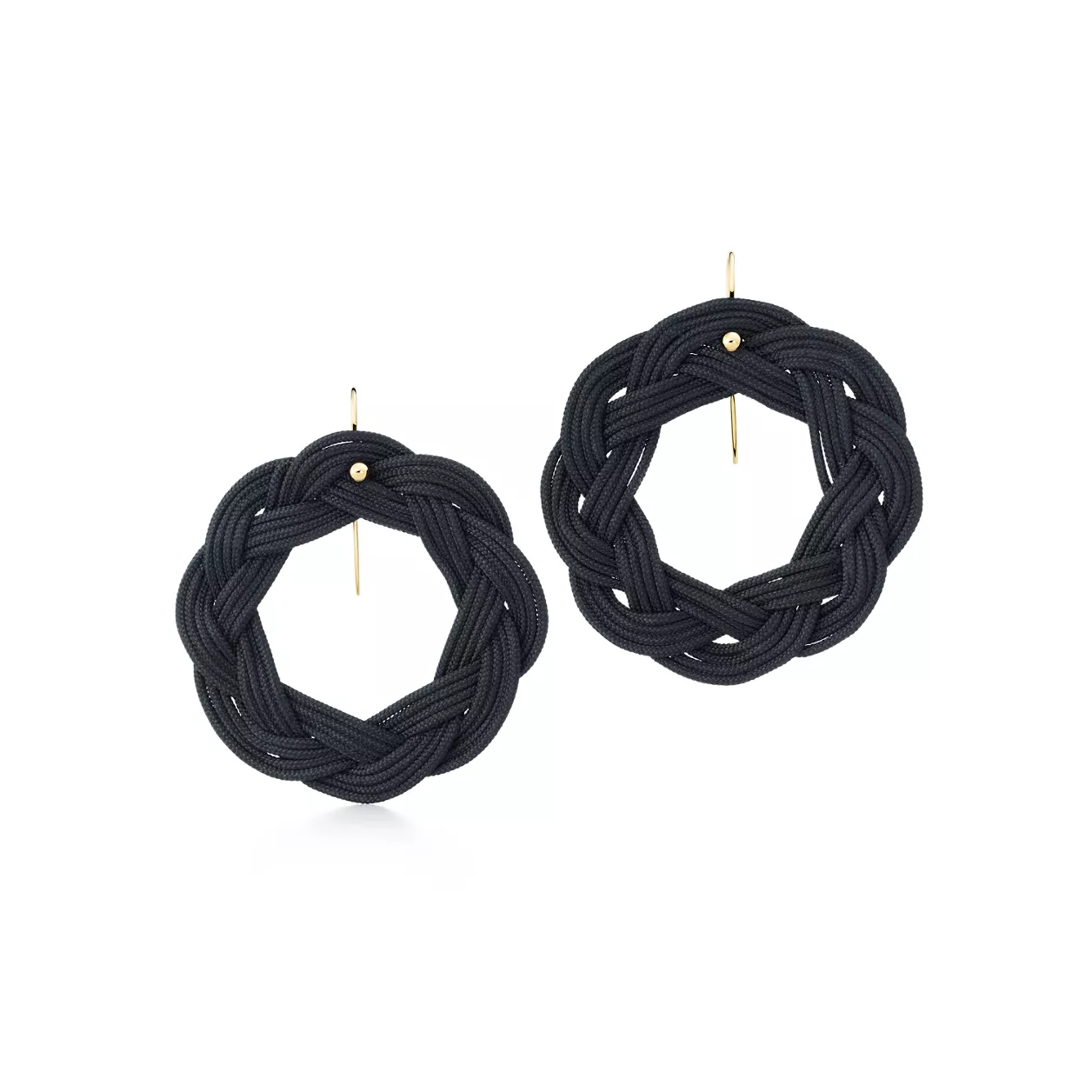 Braided silk circles woven by hand. Hook earrings in black woven silk with 18k gold, for pierced ears. 55 mm wide. Original designs copyrighted by the Nando and Elsa Peretti Foundation.