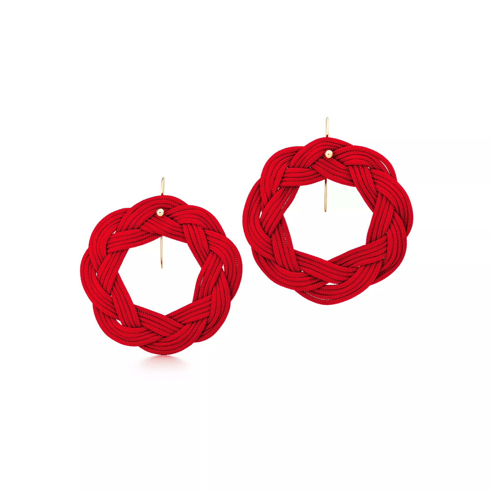 Braided silk circles woven by hand. Hook earrings in red woven silk with 18k gold, for pierced ears. 55 mm wide. Original designs copyrighted by the Nando and Elsa Peretti Foundation.