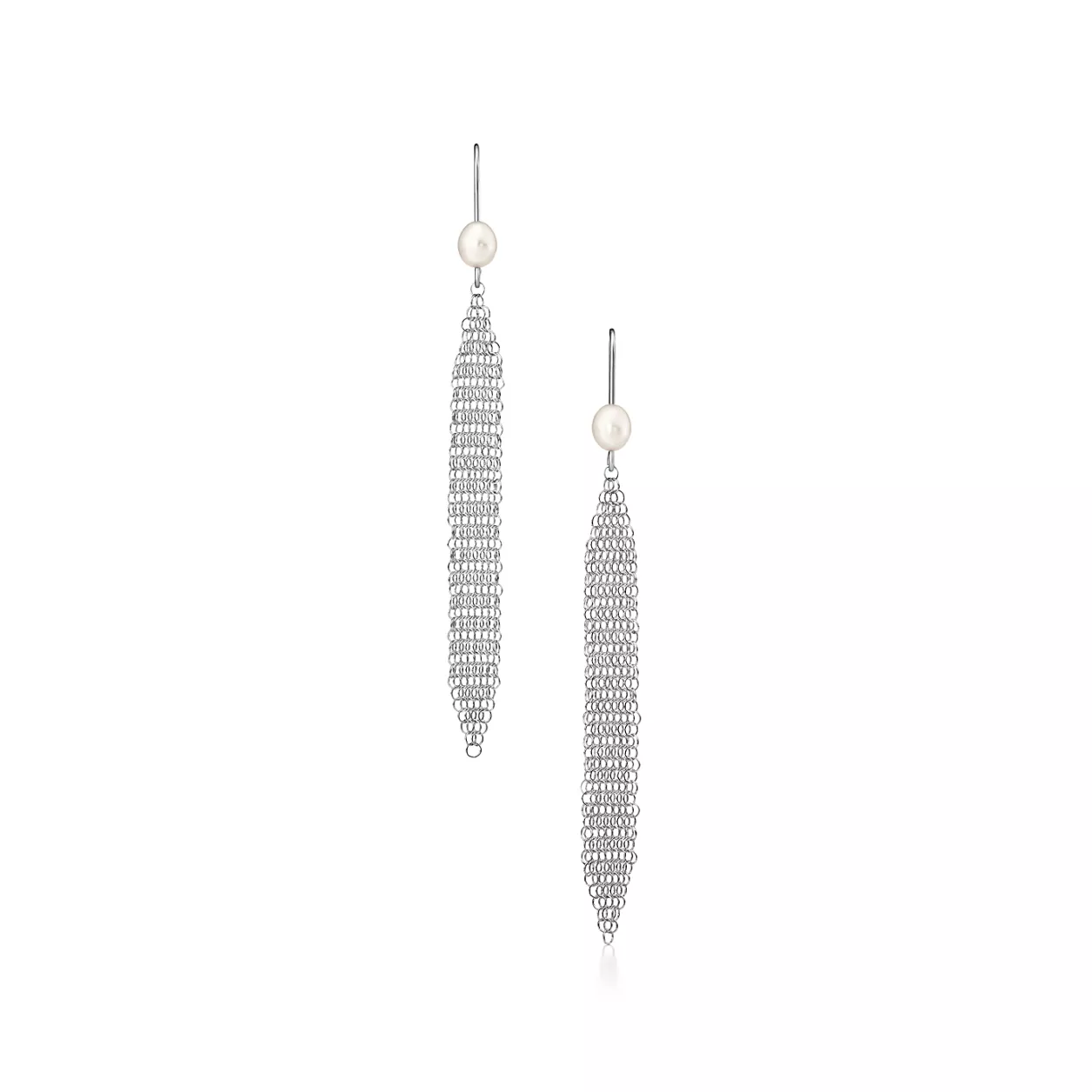 The form is malleable and ergonomic in the way it drapes over the body's contours. Tassel earrings in sterling silver with freshwater cultured pearls. 2.75" long. Pearls 4.5-5mm. Original designs copyrighted by the Nando and Elsa Peretti Foundation.