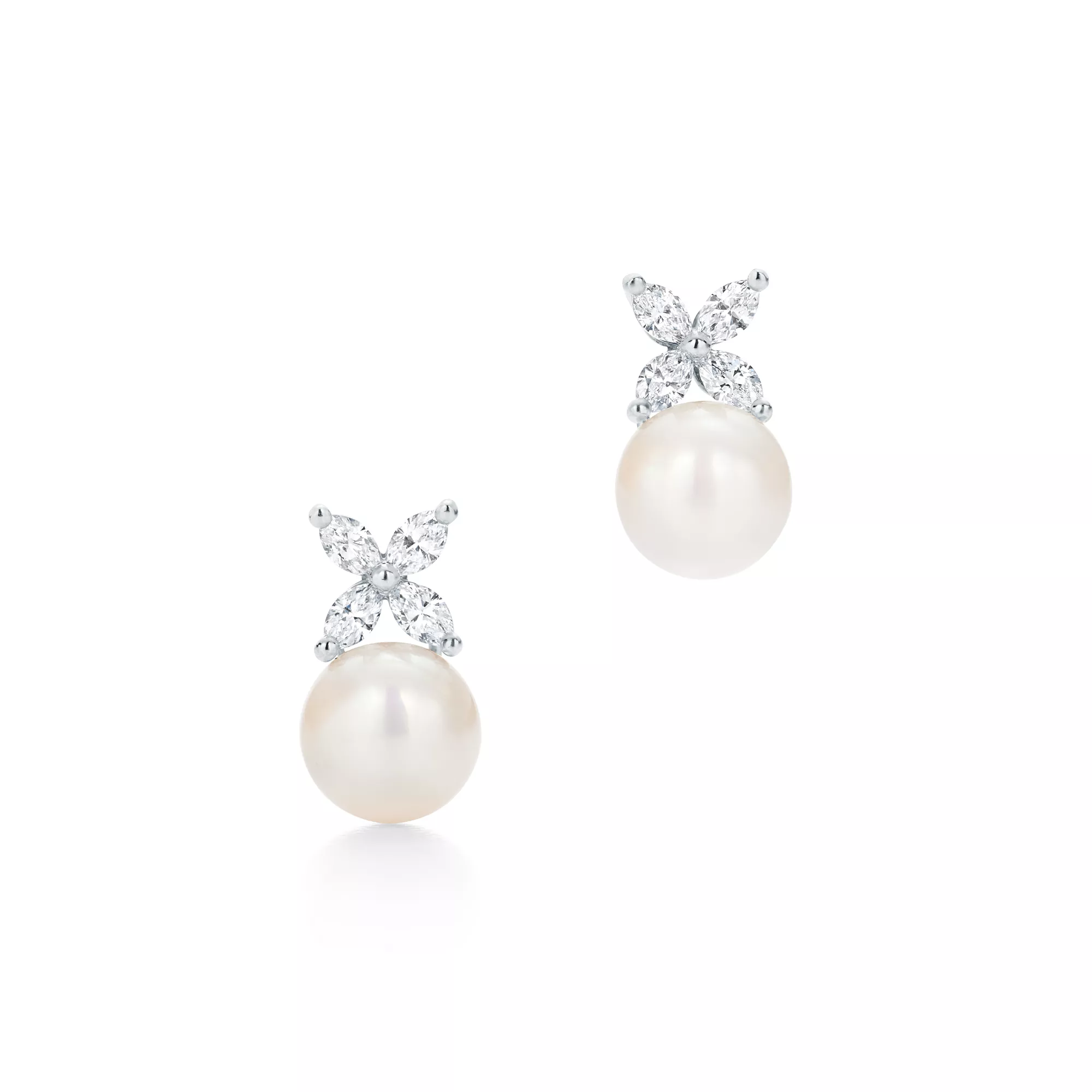 With an intensity that rivals the night sky, Tiffany Victoria celebrates the blazing brilliance of Tiffany diamonds. Timeless pearls complement shining diamonds in these classic earrings.
