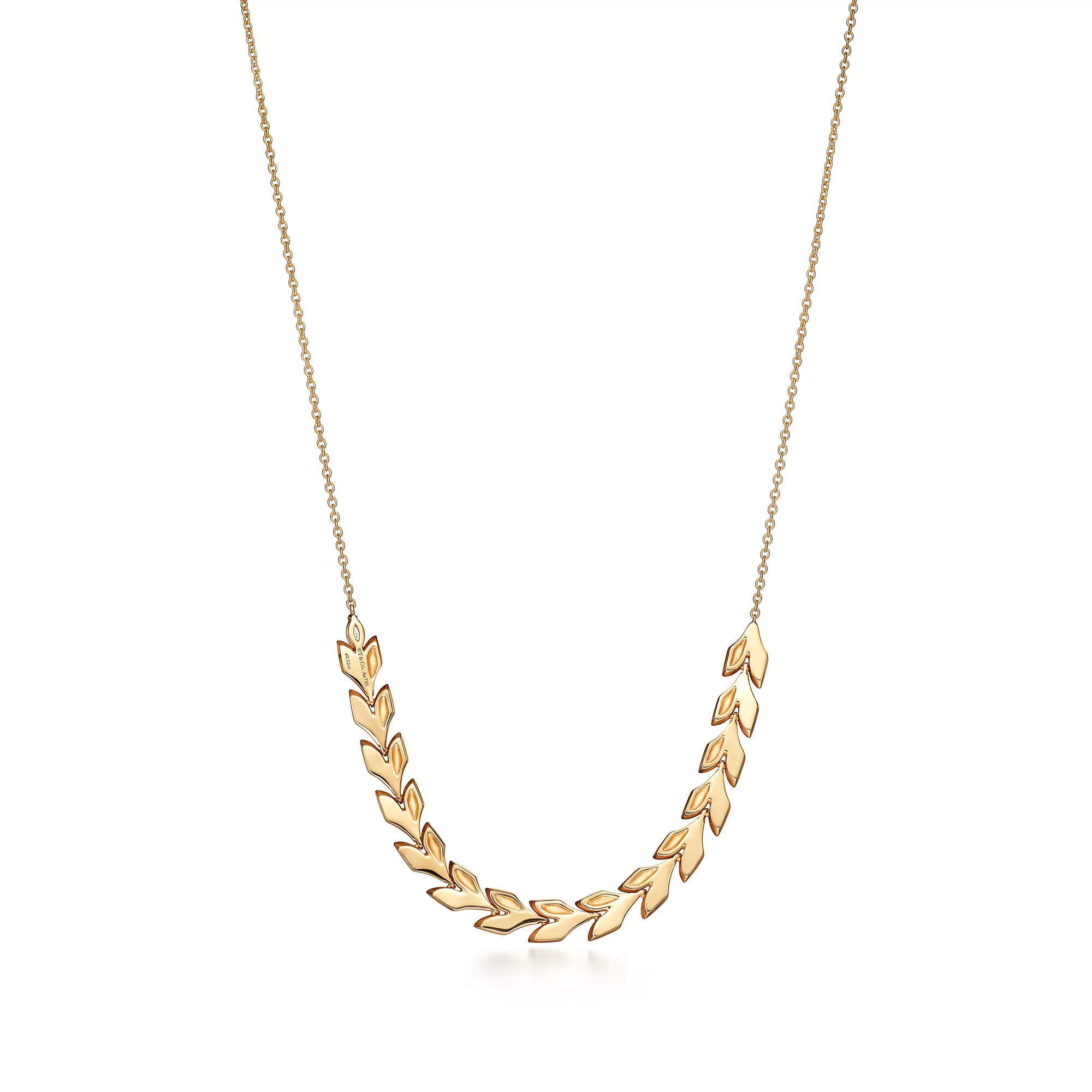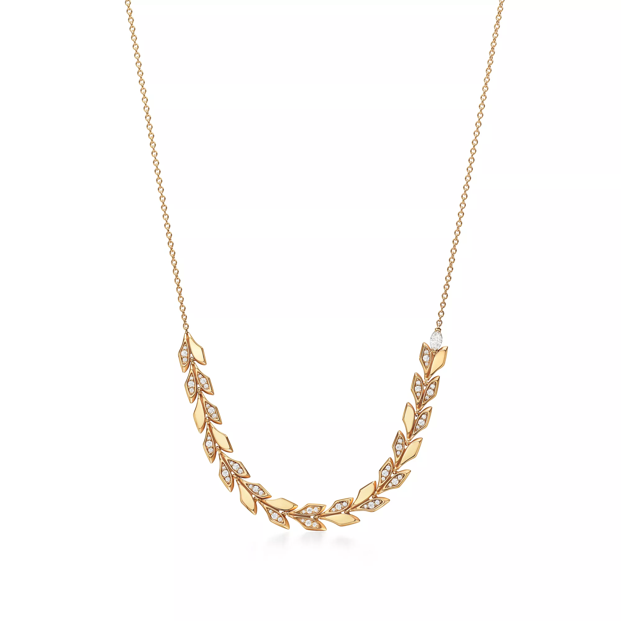 Inspired by the natural world, Tiffany Victoria designs capture the fluid movement of flowers, vines and leaves with a mix of expertly cut diamonds. This striking pendant is crafted of 18k gold that features a contrast of high polish and sandblasted finishes. Round brilliant and marquise diamonds play off the light and accentuate the vine motif. When too many diamonds are never enough, Tiffany Victoria is the ultimate way to shine. Wear on its own for a dramatic statement or layer with pendants of different lengths.