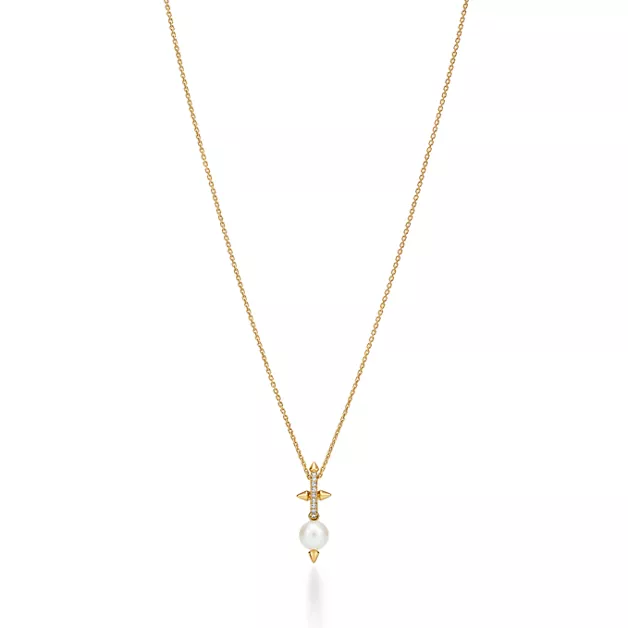 Building on the House’s legacy of collaborating with visionary artists, Tiffany Titan by Pharrell Williams is an expression of rebellious creativity. These designs draw inspiration from Poseidon and his trident. An angular spear-shaped motif crafted from 18k gold appears on each side of the large-scale pearl, while reverse-set diamonds allow light to enter from every angle, maximising brilliance.