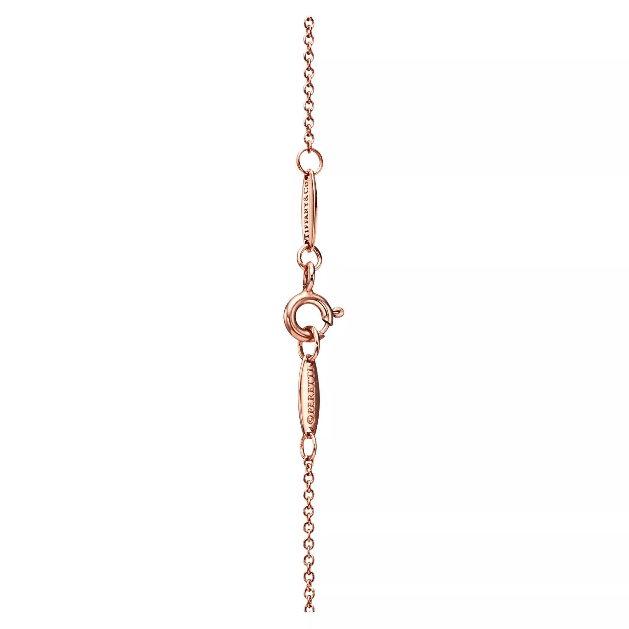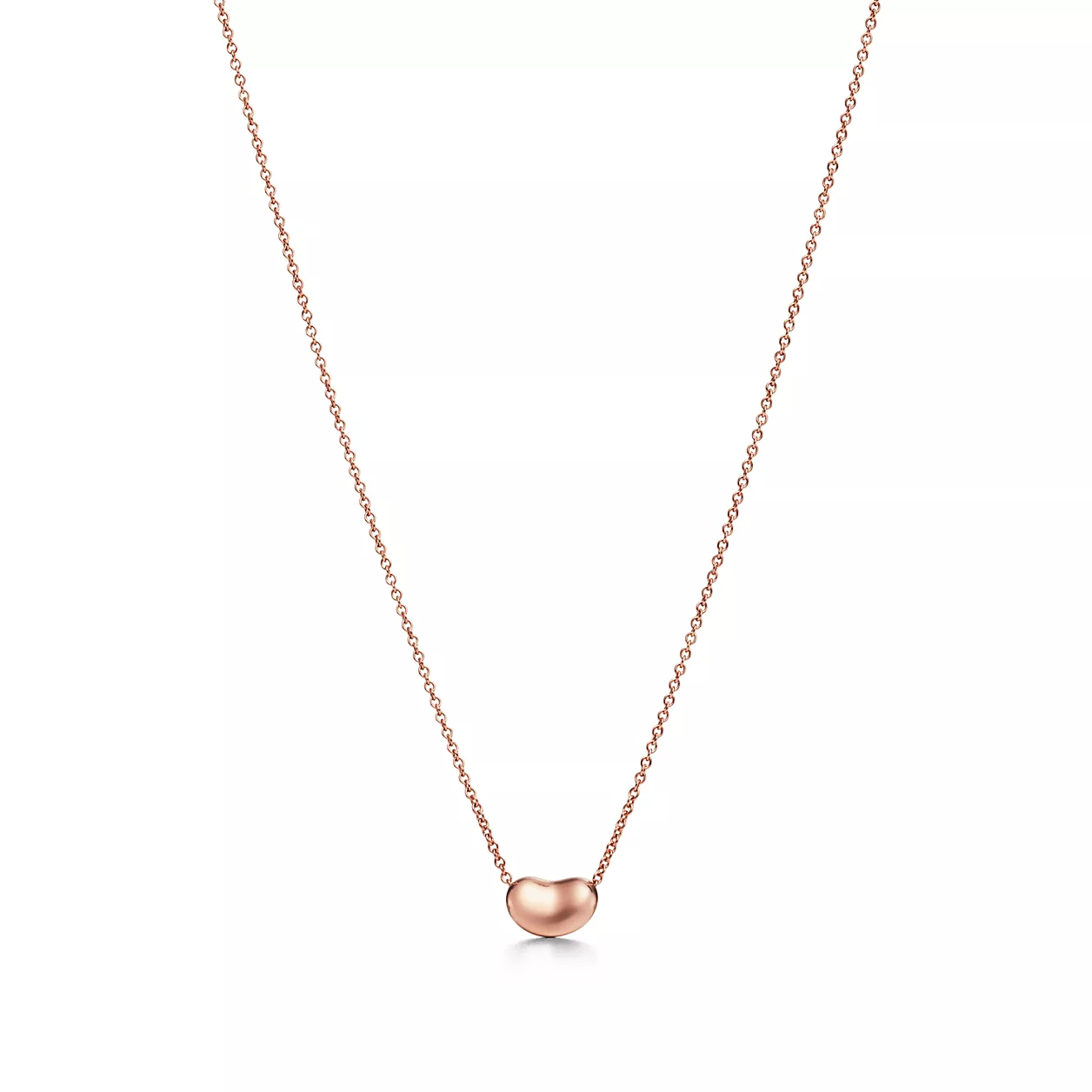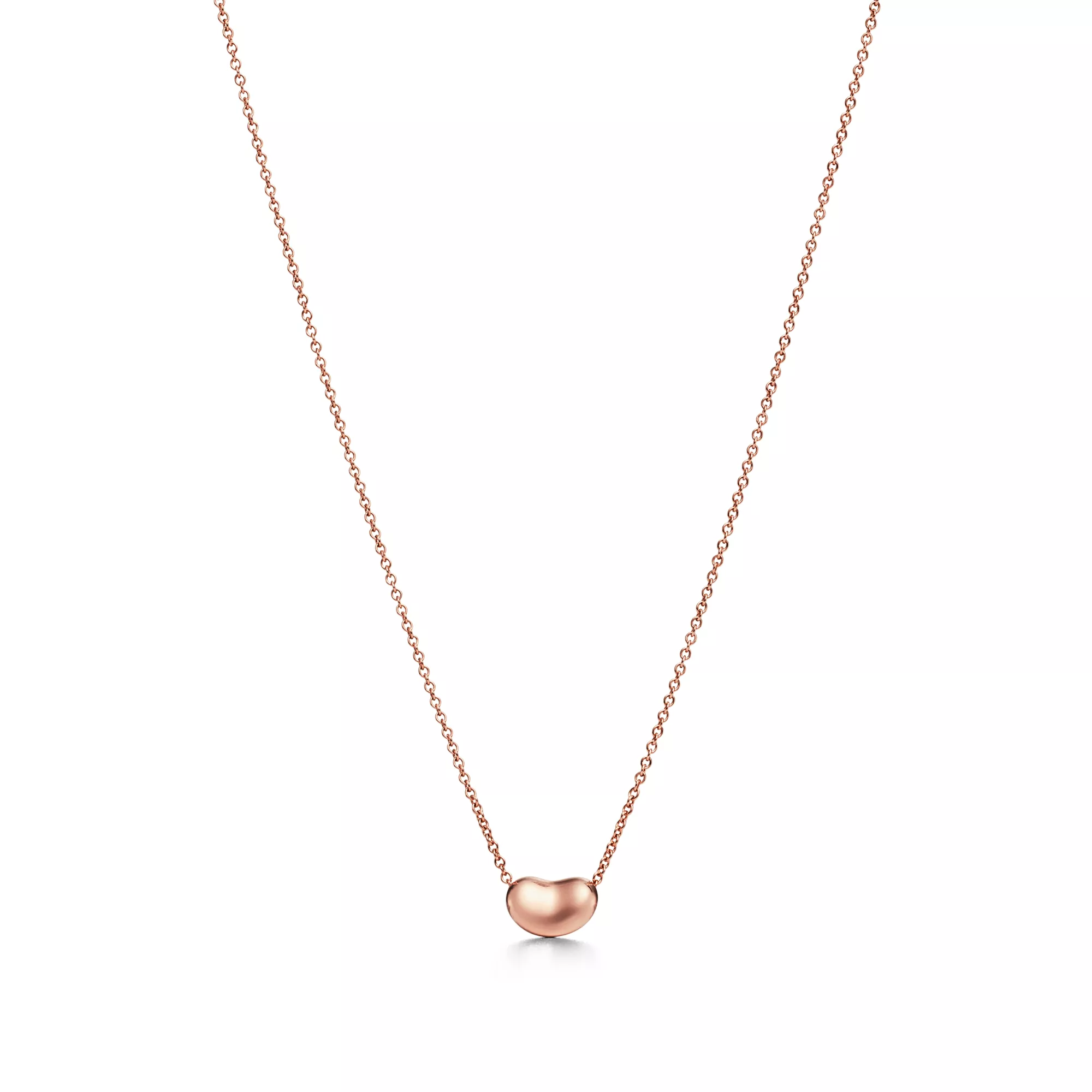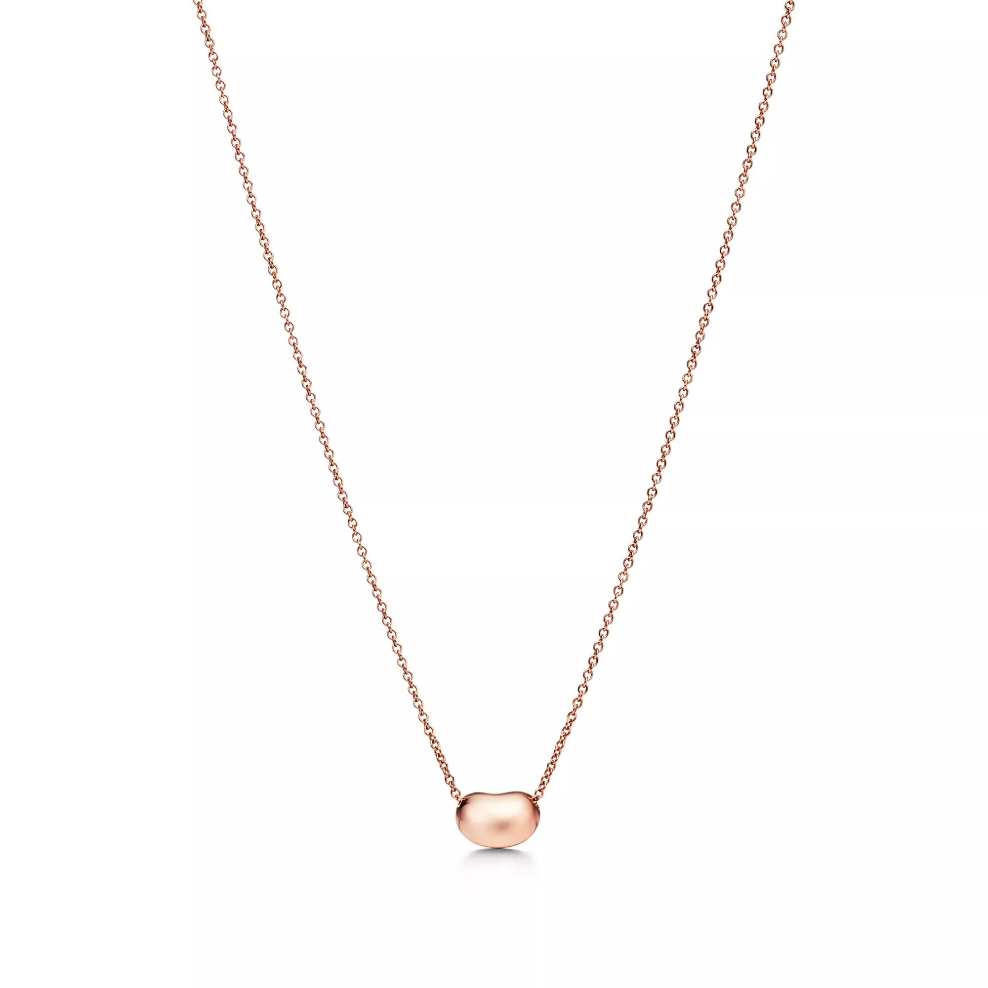 The bean represents the origin of all things. Pendant in 18k rose gold, 9 mm wide. On a 16" chain. Original designs copyrighted by the Nando and Elsa Peretti Foundation.