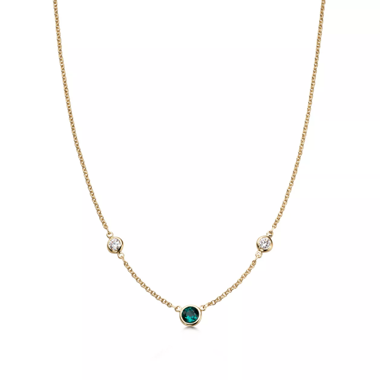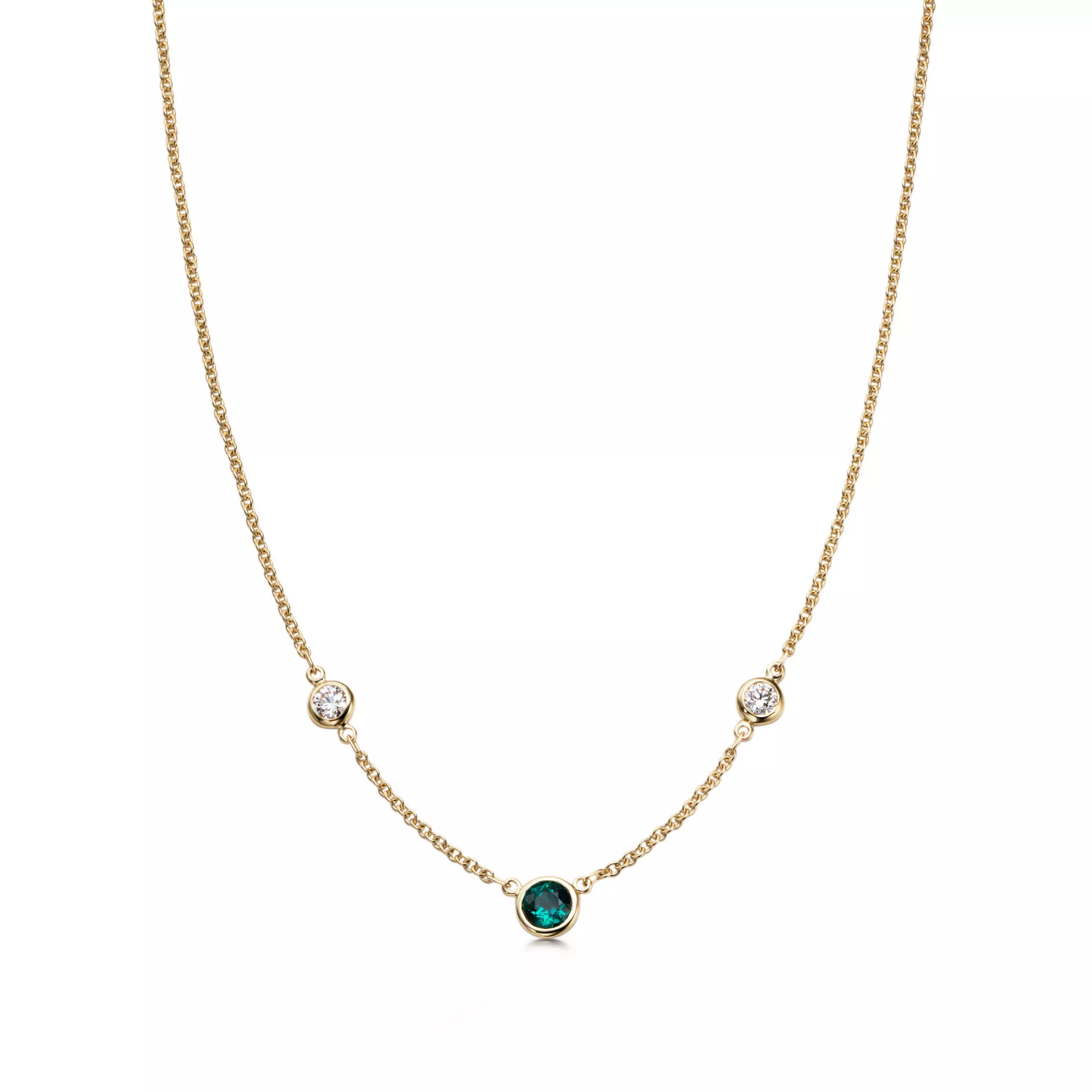 Necklace in 18k gold with two round brilliant diamonds and a round emerald. 16" long. Diamonds, carat total weight .16; emerald, carat weight .20. Original designs copyrighted by the Nando and Elsa Peretti Foundation.