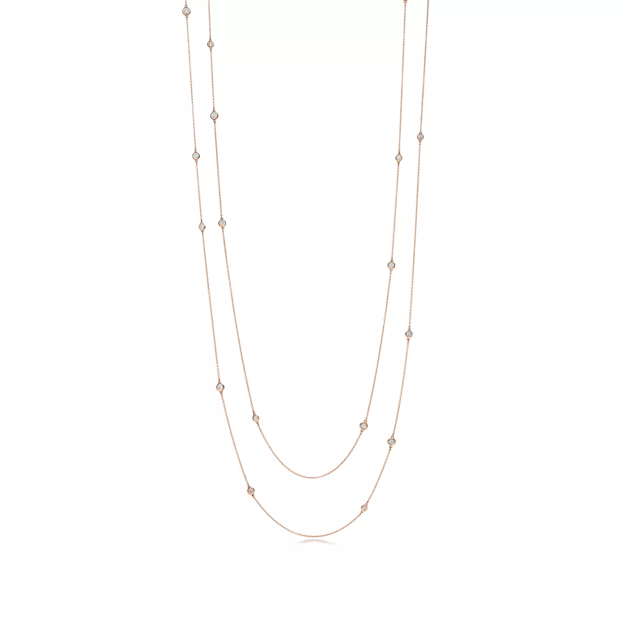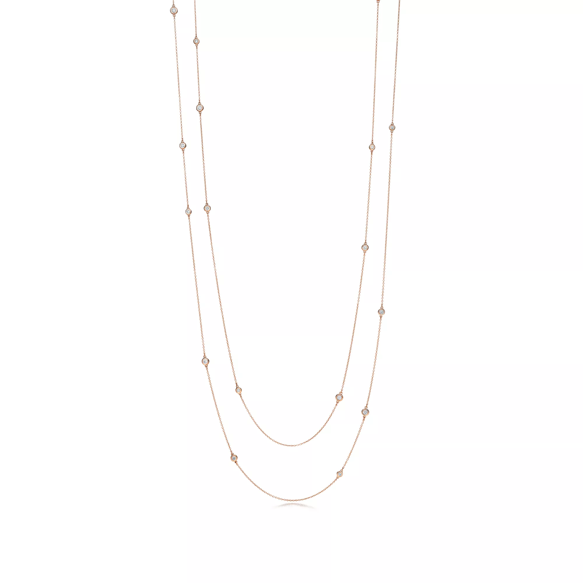 Tiffany round diamonds catch the light and make it dance. In 18k rose gold with 24 round brilliant diamonds. 72" long. Carat total weight 1.20. Original designs copyrighted by Elsa Peretti.