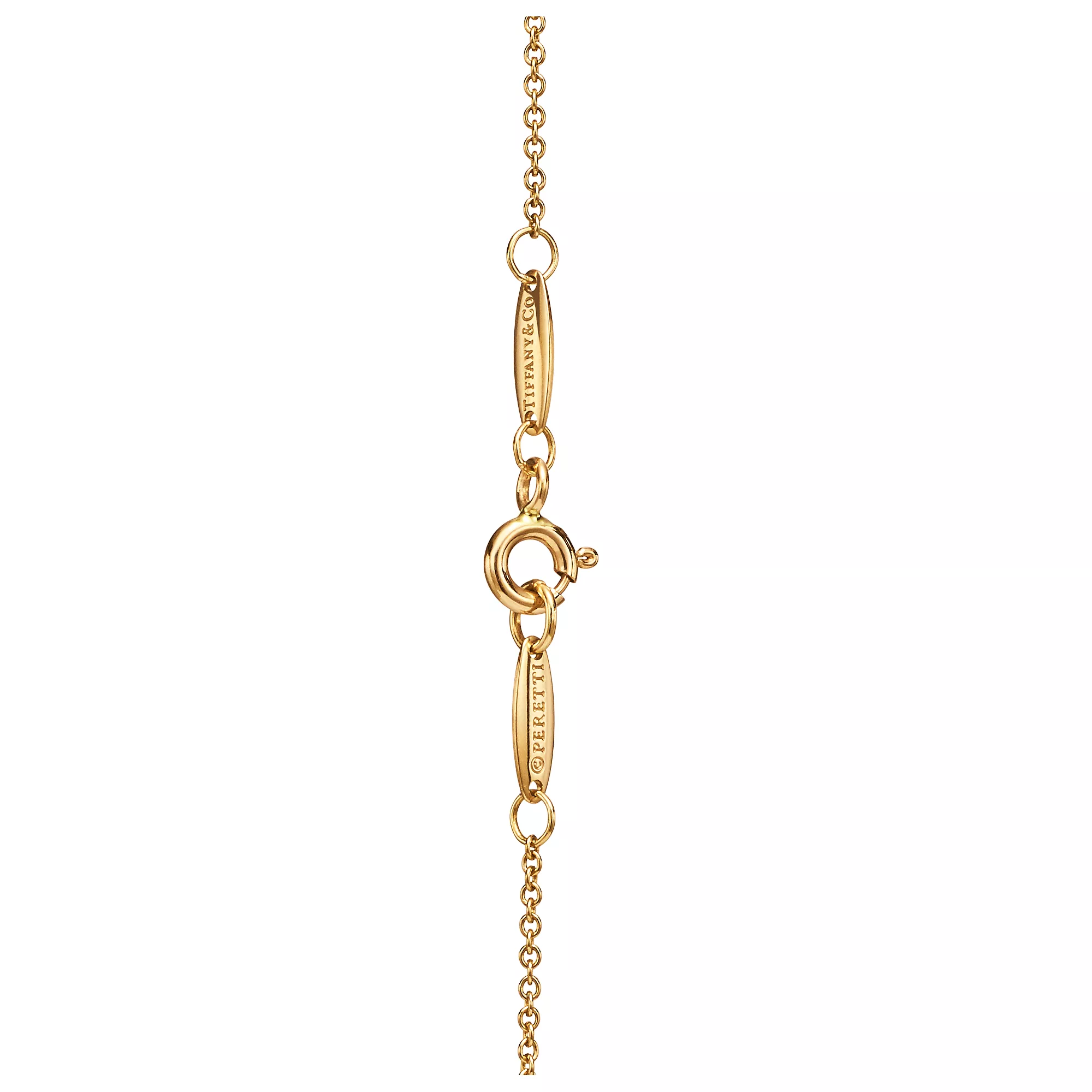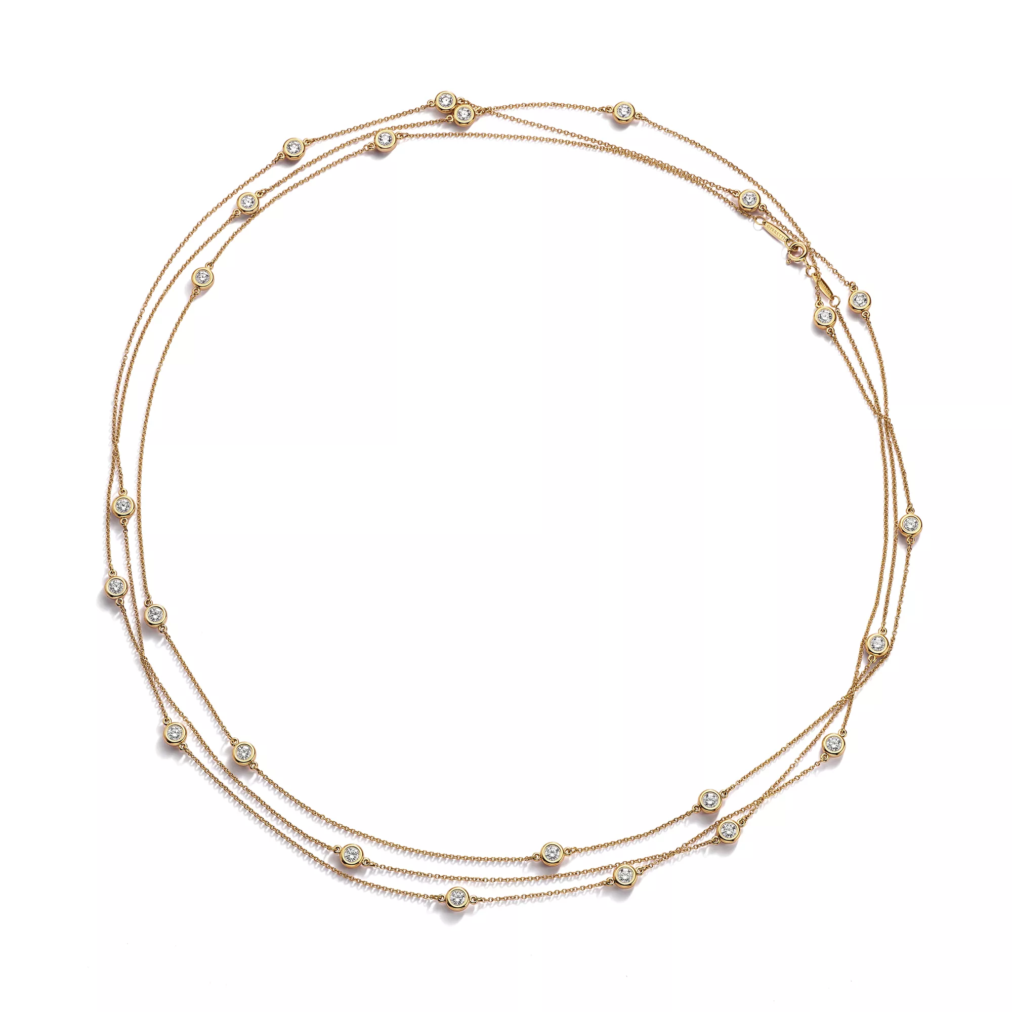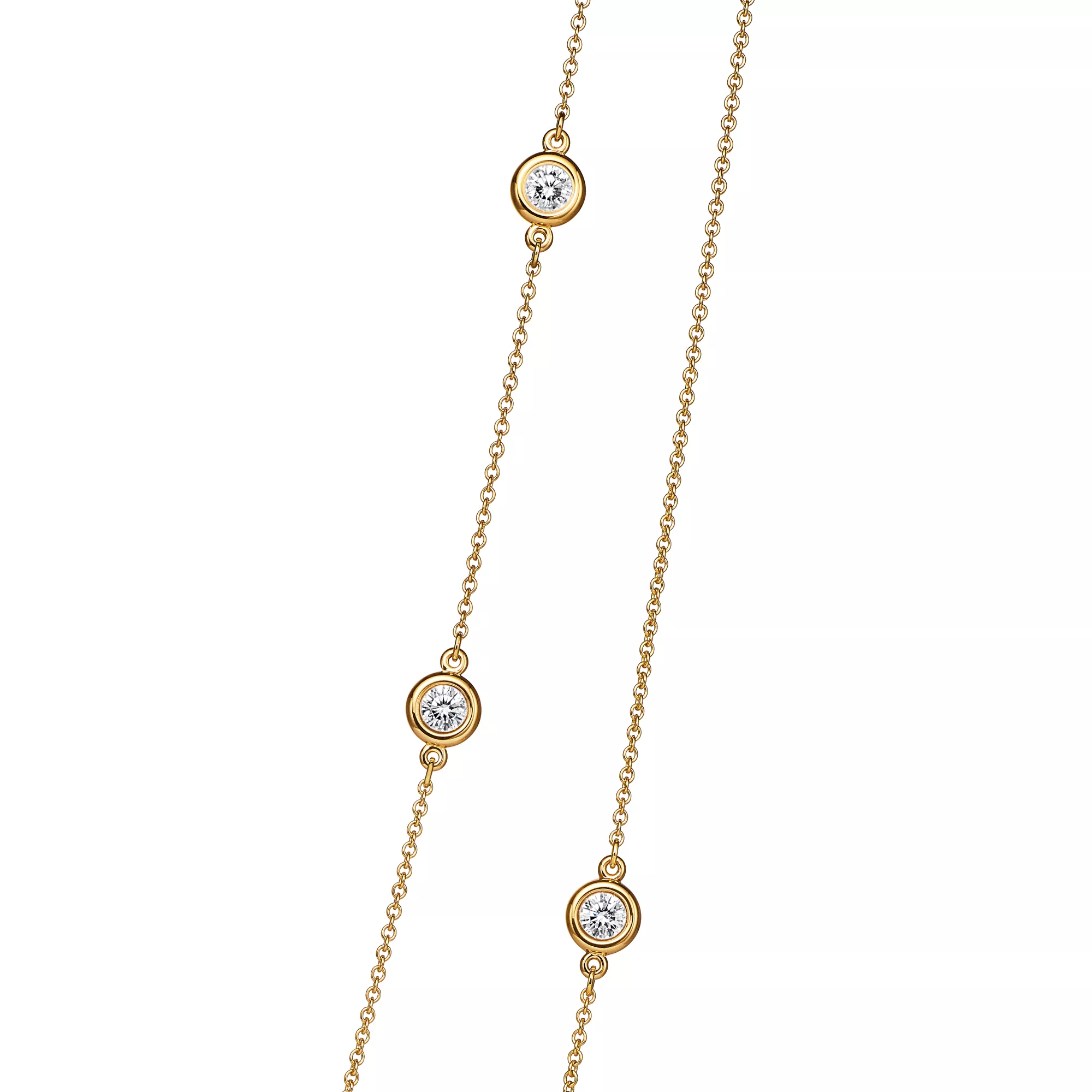 Elsa Peretti’s revolutionary Diamonds by the Yard® collection features a combination of fine, fluid chains and bezel-set stones that forever changed the role of diamonds in fashion. Each round brilliant diamond is positioned gracefully along an 18k yellow gold chain to look like a droplet of light against the skin. Layer this design with other Diamonds by the Yard® pendants and necklaces of varying lengths and metals for a look that’s all your own.