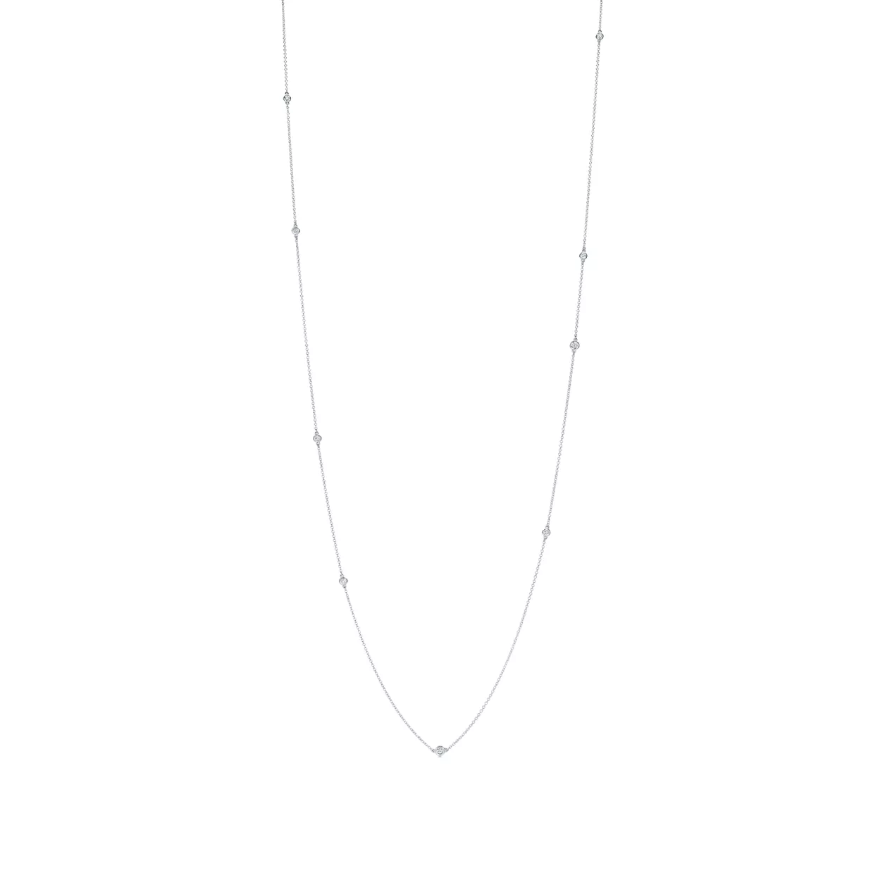 Tiffany round diamonds catch the light and make it dance. Sprinkle necklace in sterling silver with nine round brilliant diamonds. 32" long. Carat total weight .31. Original designs copyrighted by the Nando and Elsa Peretti Foundation.