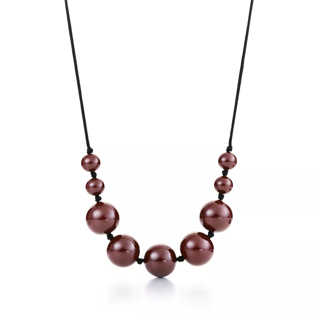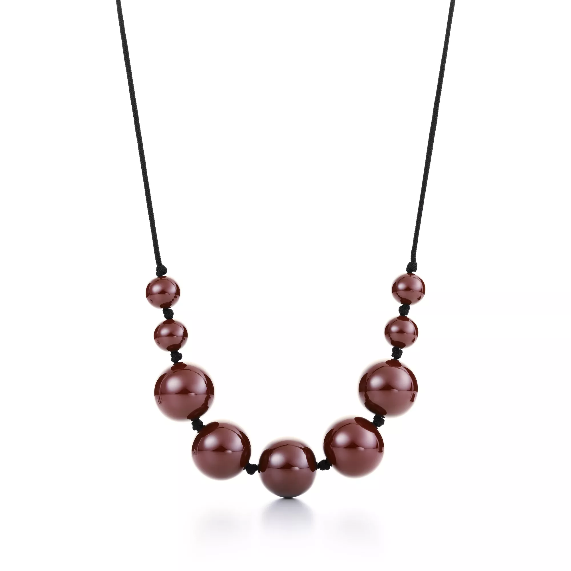 Sleek, bold and arresting. Necklace in traditional brown lacquer over Japanese hardwood. On an adjustable silk cord. Original designs copyrighted by the Nando and Elsa Peretti Foundation.