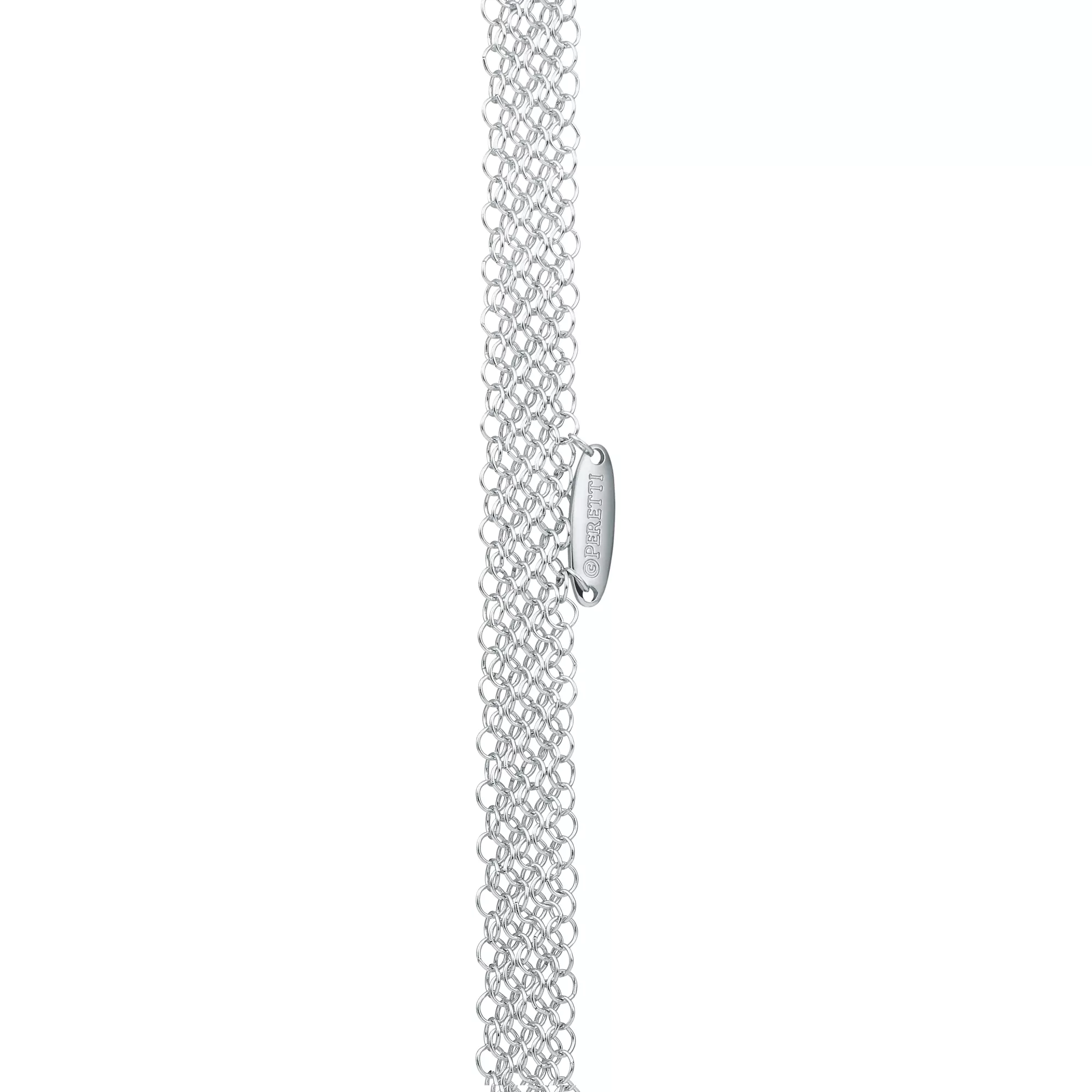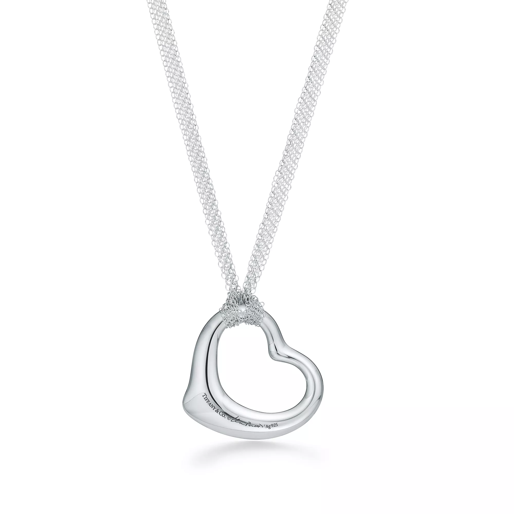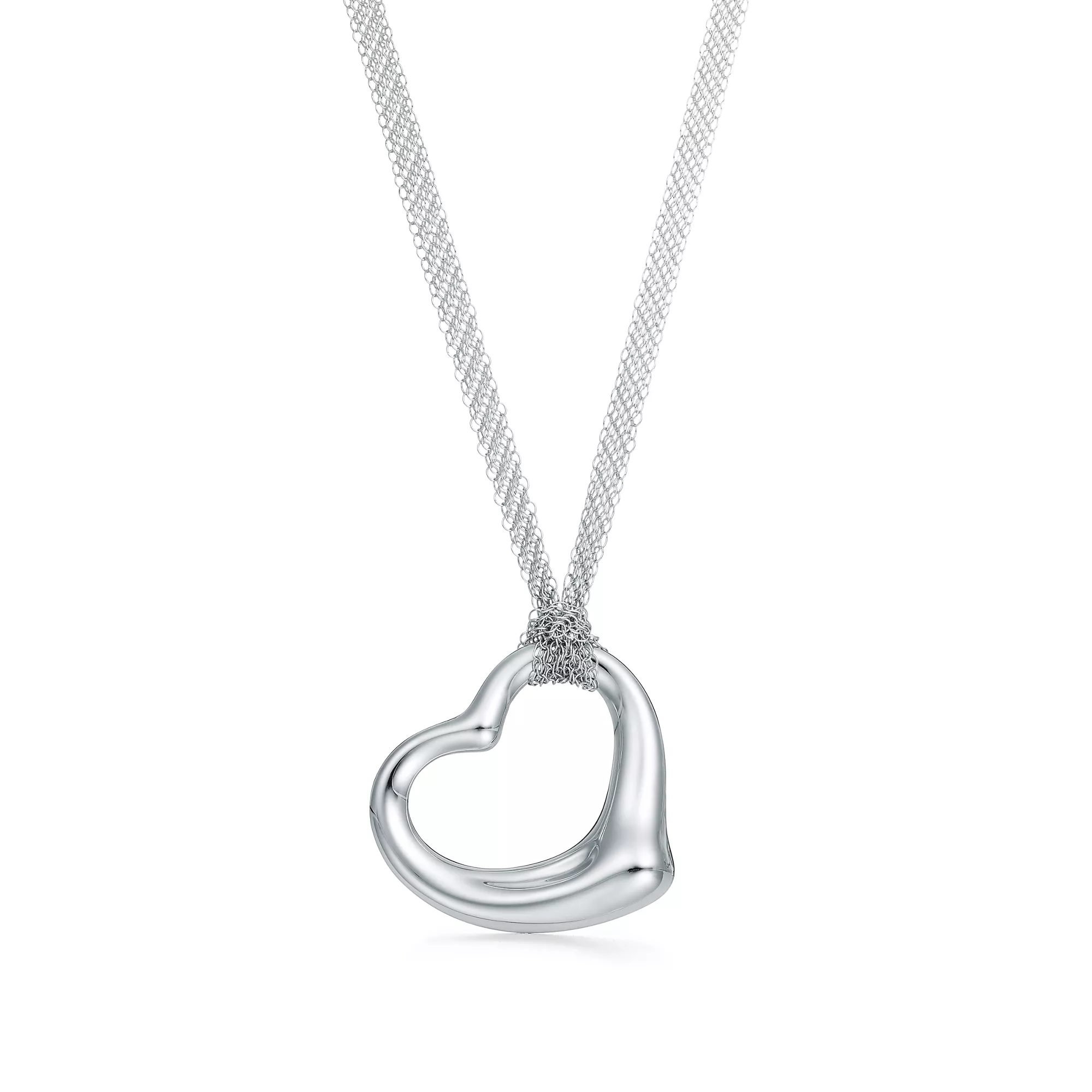 The simple, evocative shape of Elsa Peretti Open Heart designs celebrates the spirit of love. This pendant's organic curves create a striking contrast to a mesh chain.