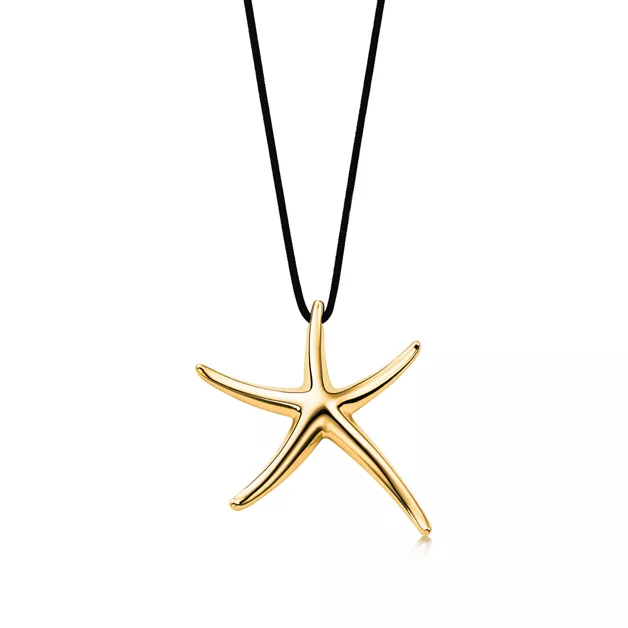 The starfish evokes life beneath the waves and in the celestial heavens. Pendant in 18k gold. On an 18" black silk cord. Original designs copyrighted by the Nando and Elsa Peretti Foundation.