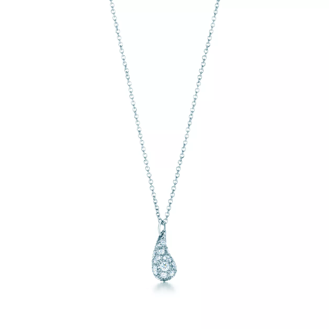 Reminiscent of a solitary raindrop or a shining bead of morning dew. Pendant in platinum with round brilliant diamonds. On a 16" chain. Carat total weight .75. Original designs copyrighted by the Nando and Elsa Peretti Foundation.
