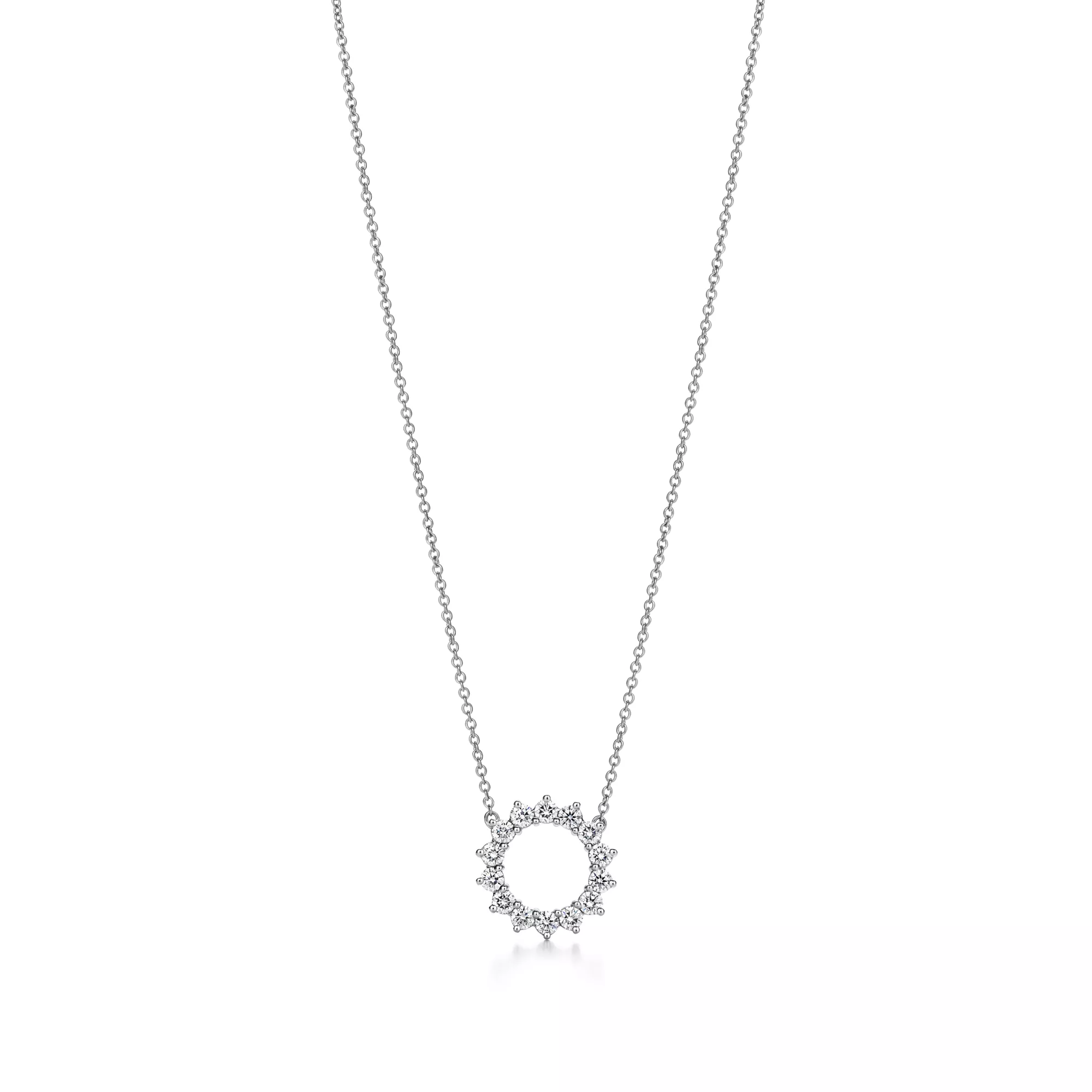 Poetry in motion. Pendant of round brilliant diamonds in platinum. Size small, on a 16" chain. Carat total weight .47